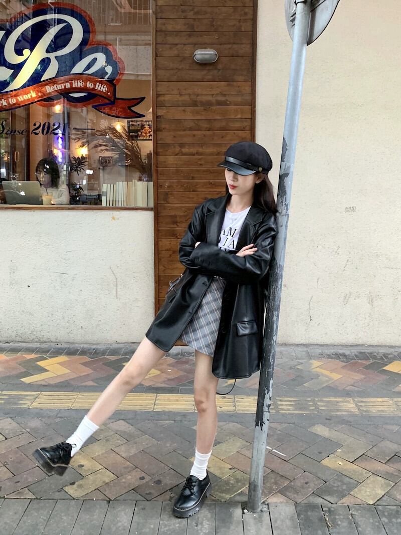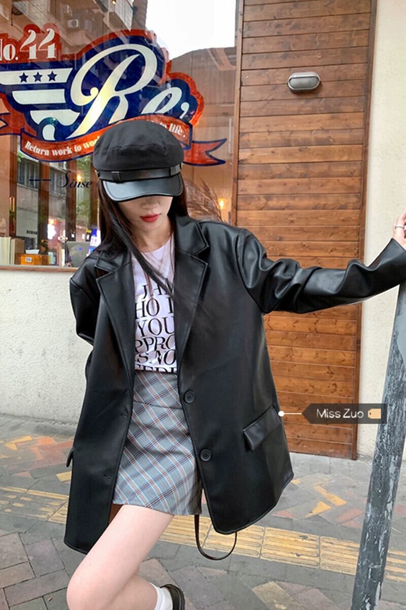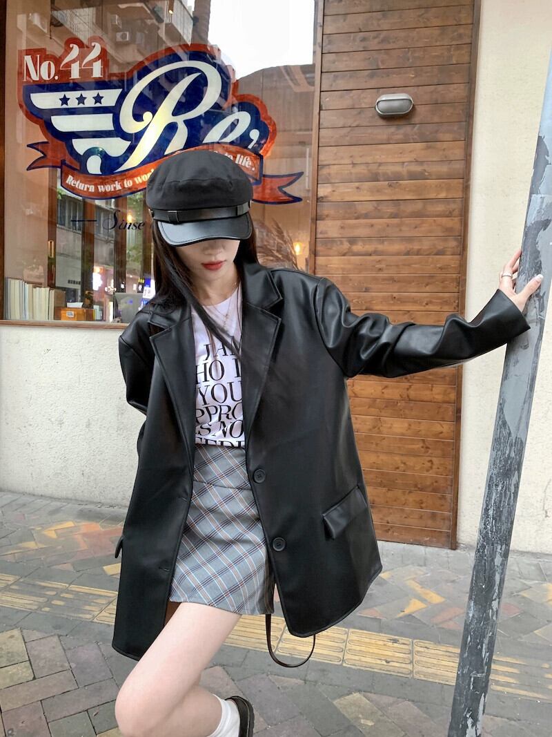 黒革のスーツのジャケットの女性の秋の気質と高級感 2023 新しい小さなレトロなミッドレングスのスーツ ブラック オータム 秋物 レザー 8571642323540370