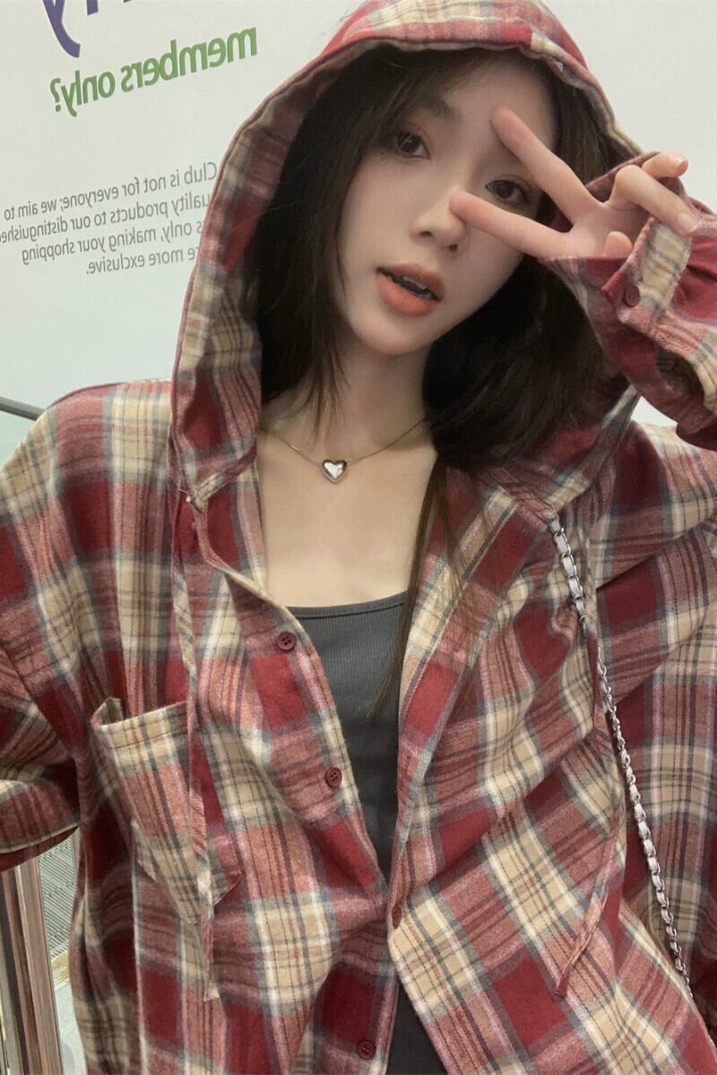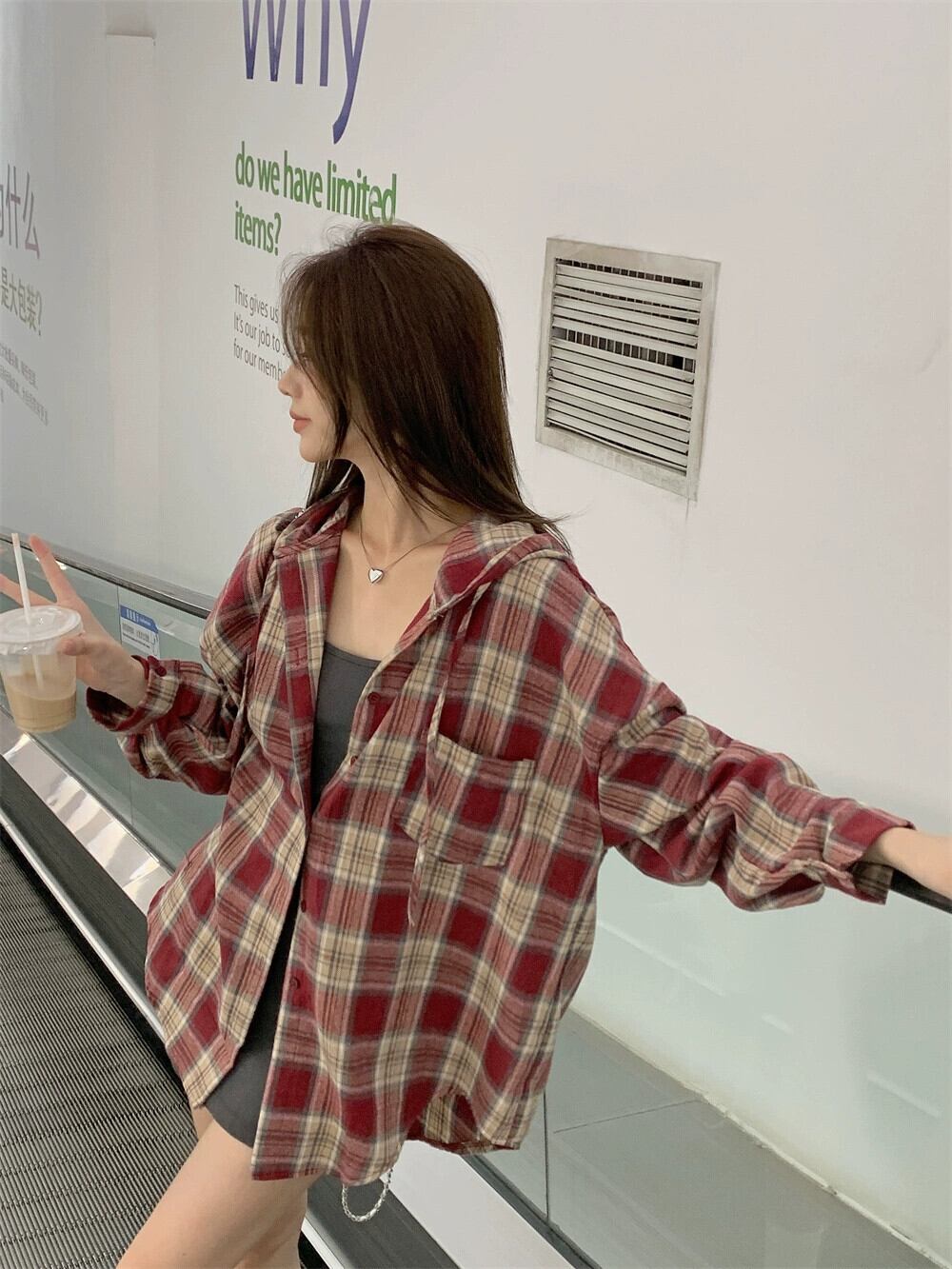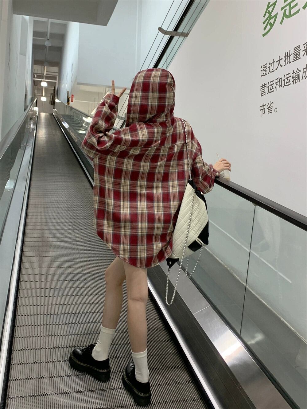 フード付きチェック柄シャツジャケット女性の 2023 初秋の新しい長袖シャツ香港スタイルのレトロな怠惰なスタイルのトップ ロング オータム 秋物 8571653522208010