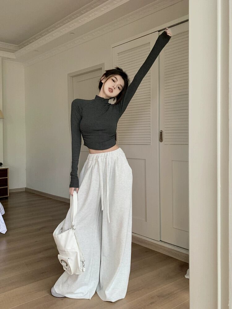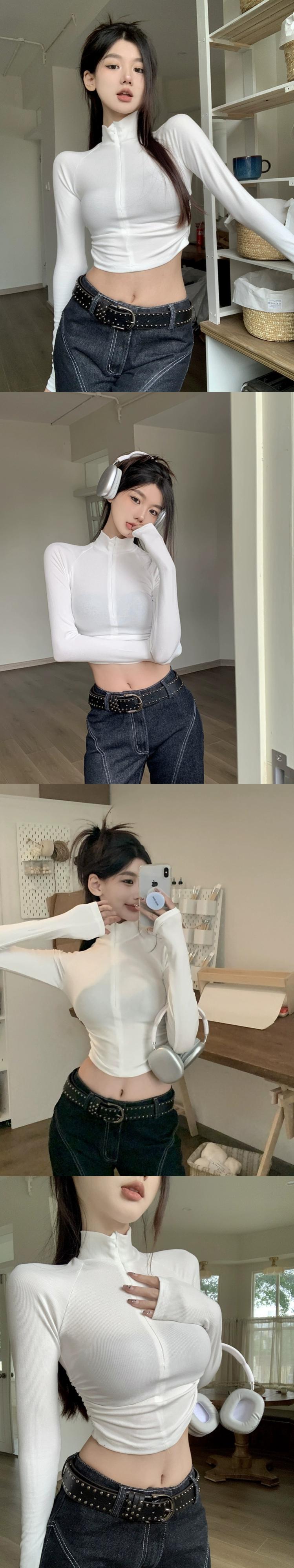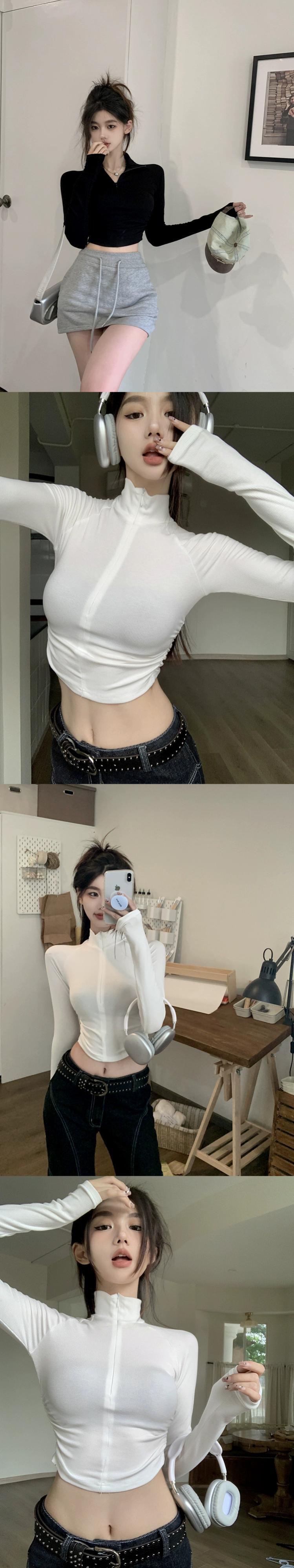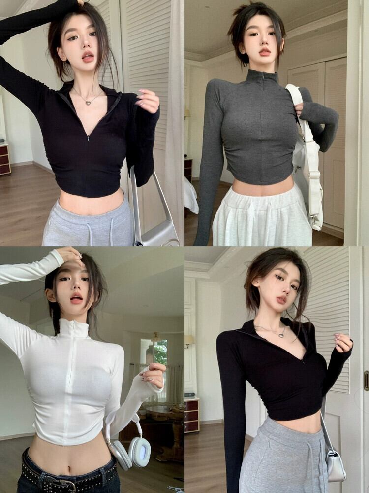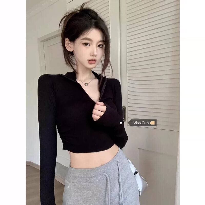 ハーフジップ黒長袖 Tシャツレディース 2023 秋の新作純粋な欲望甘辛スリムボトムシャツショートトップ ロング ブラック 大人ガーリー スウィート キュート カジュアル オータム 秋物 ピュア 8571695949490295