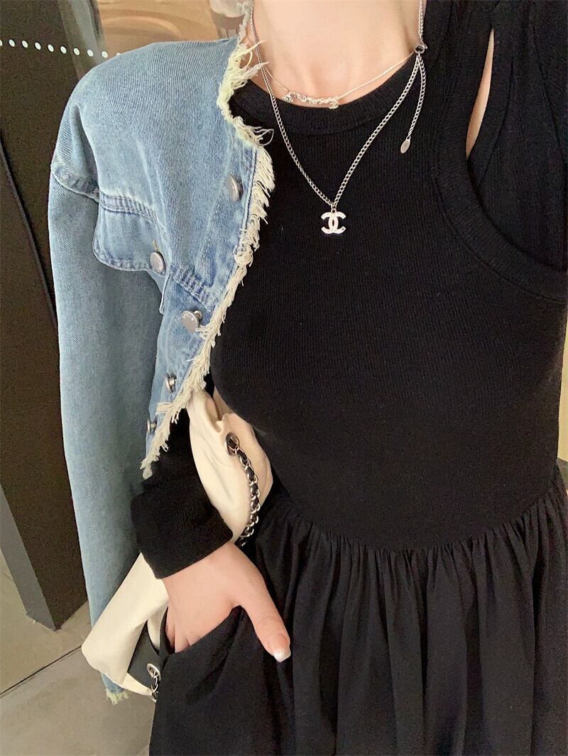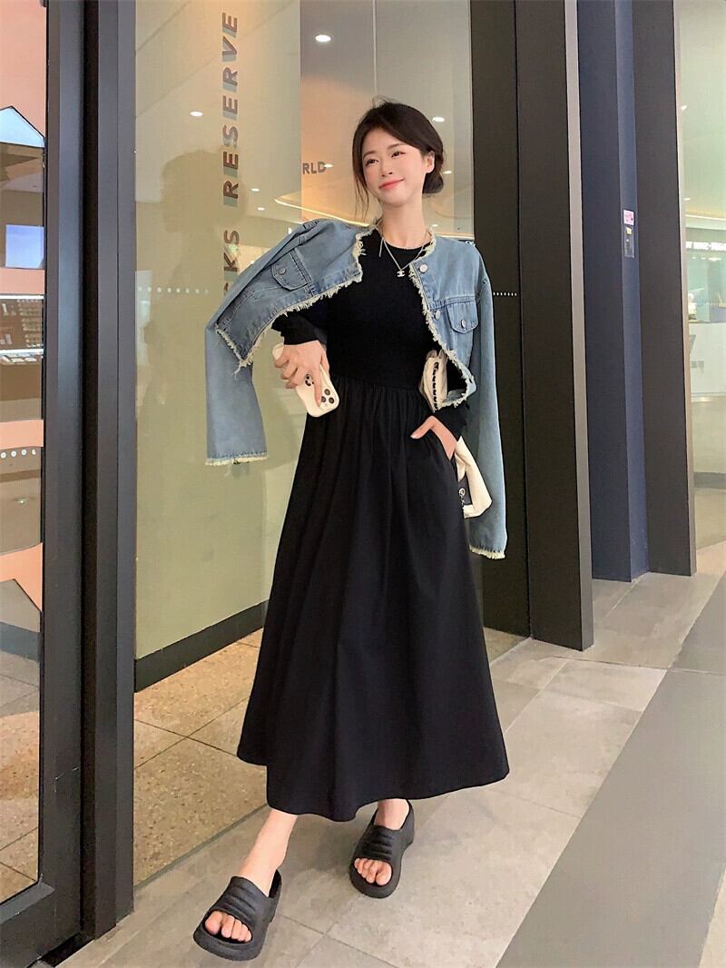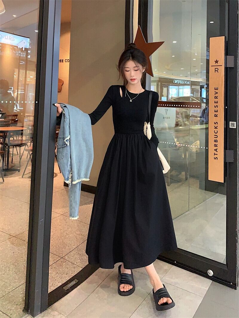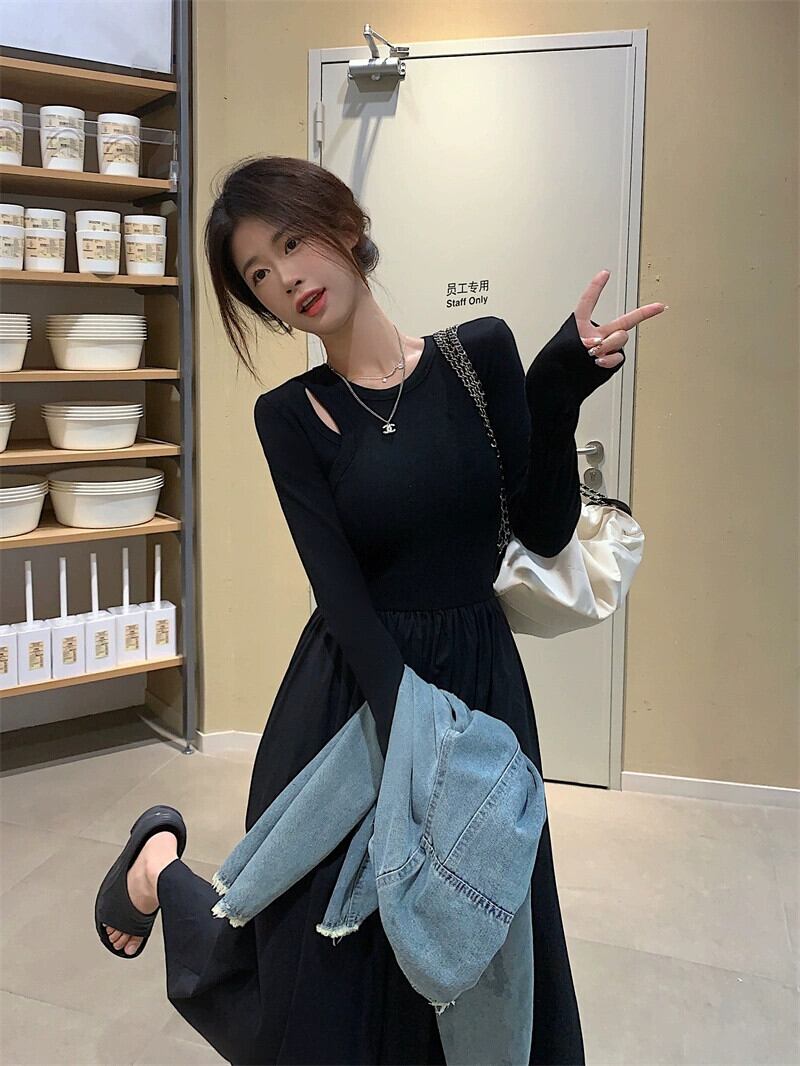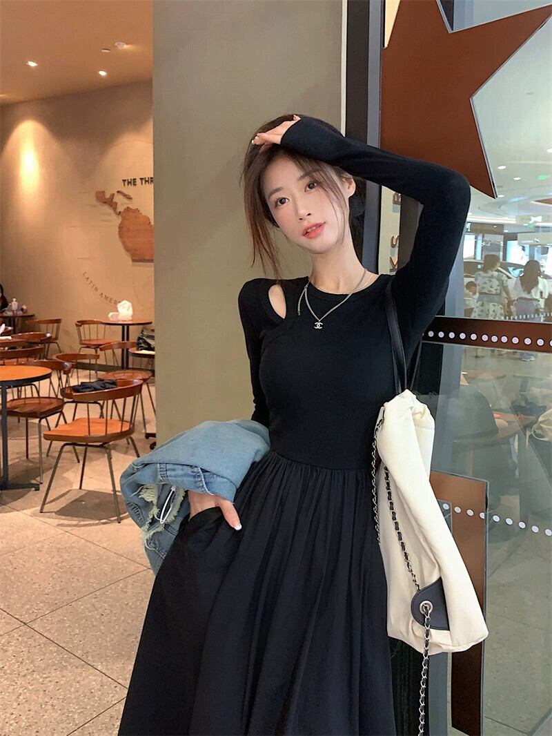 中空ニットスプライシング長袖ドレス女性の秋フレンチヘップバーンスタイルリトルブラックドレスウエストボトリングロングスカート オータム 秋物 8571635630855403