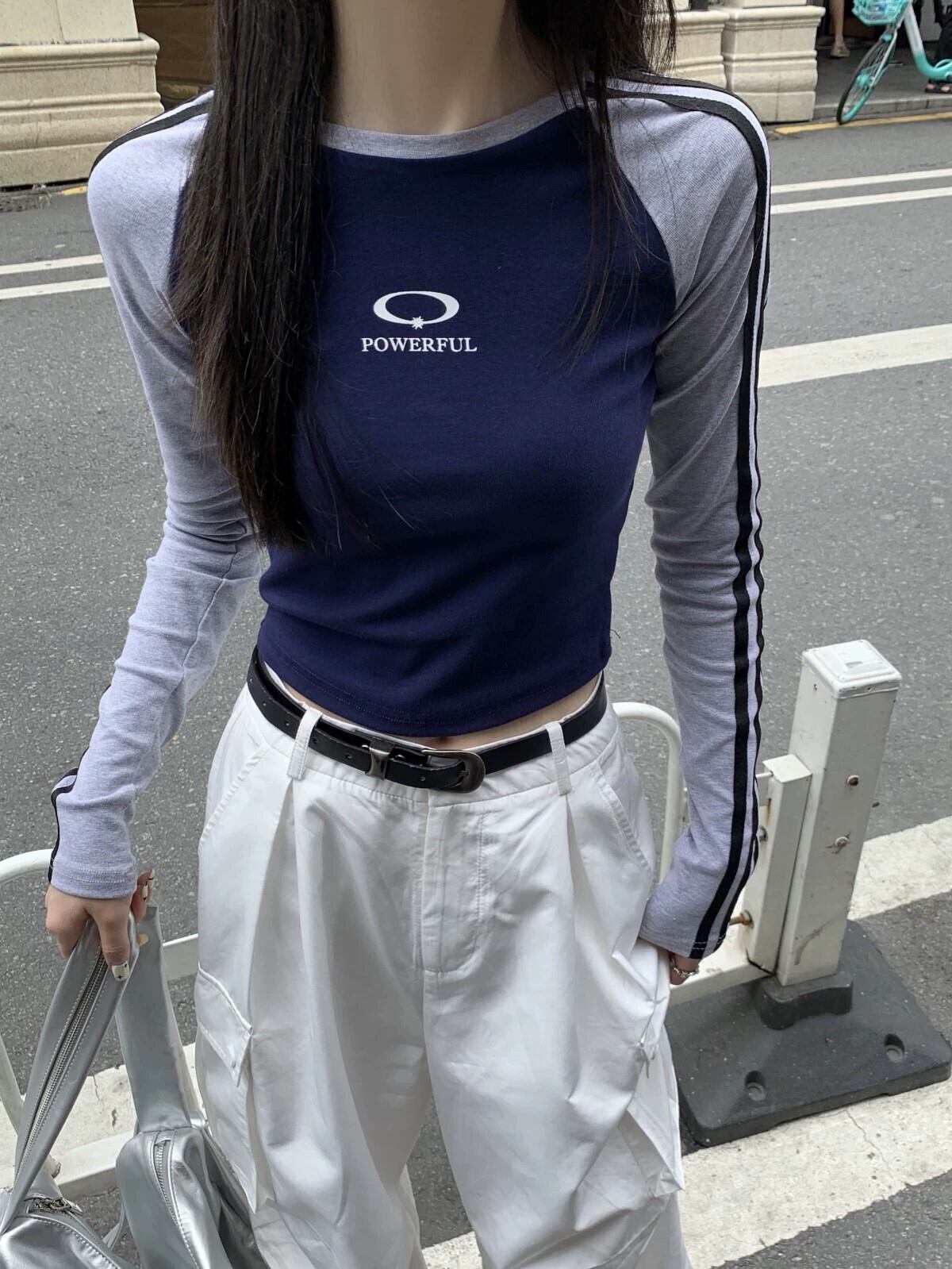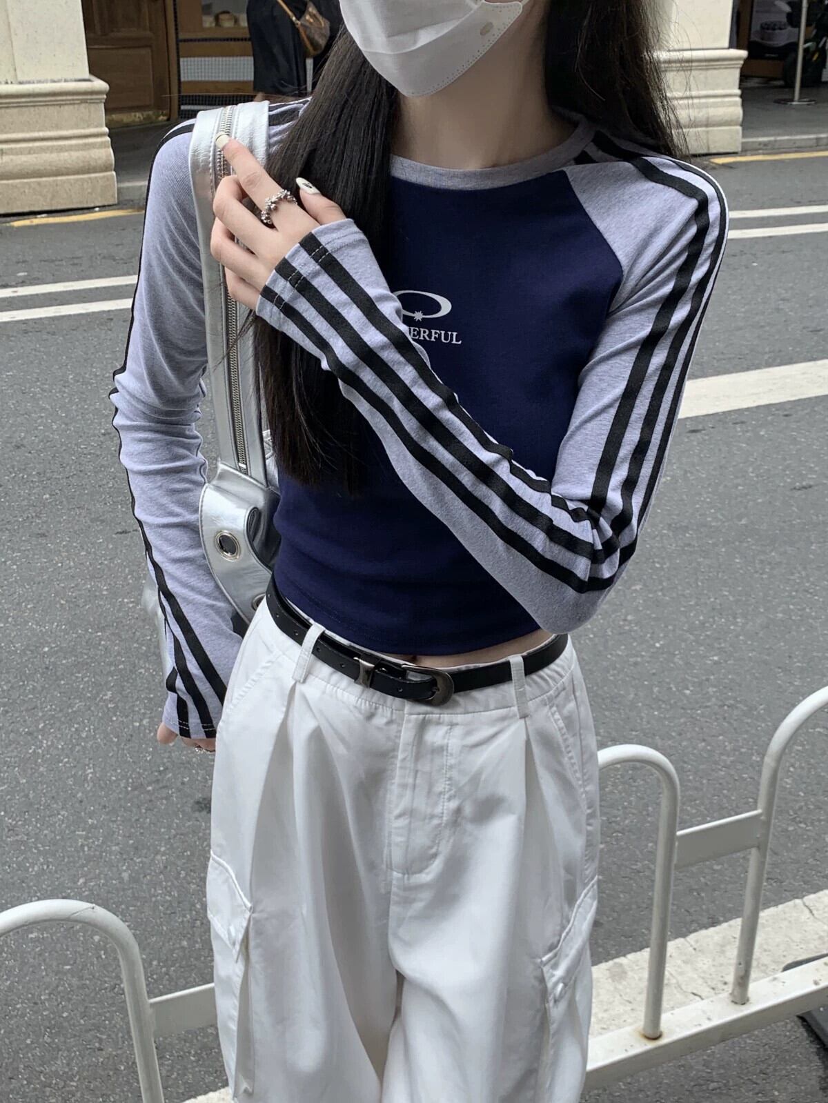 コントラストカラーラグラン長袖 Tシャツ女性の秋のインナーレイヤリングシャツ 2023 新しいアメリカンレトロネクタイショートトップ ロング オータム 秋物 8571667815565206