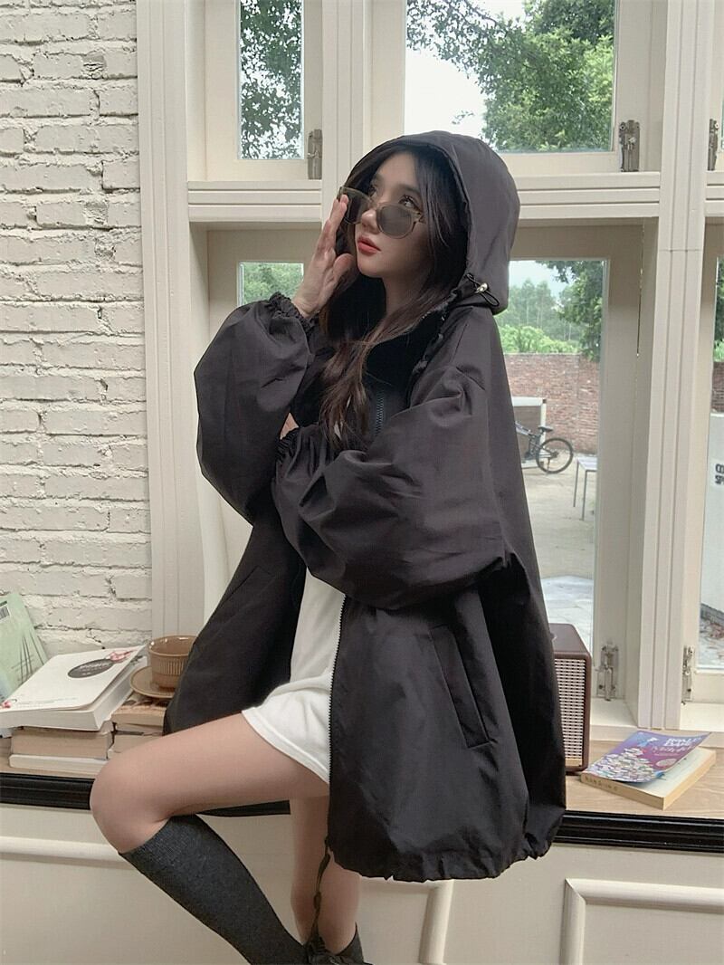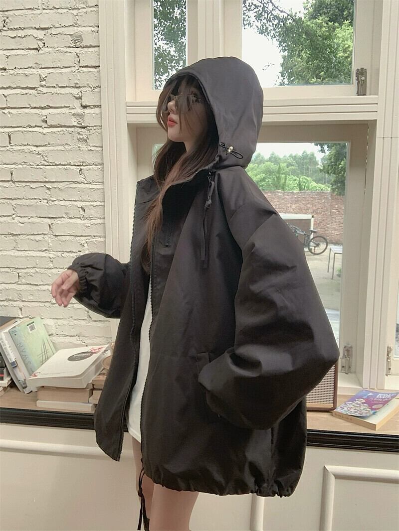黒のフード付きジャケット女性の 2023 秋の新しいルーズカジュアルスポーツスタイルオーバーサイズトップ ブラック オータム 秋物 8571661785308133