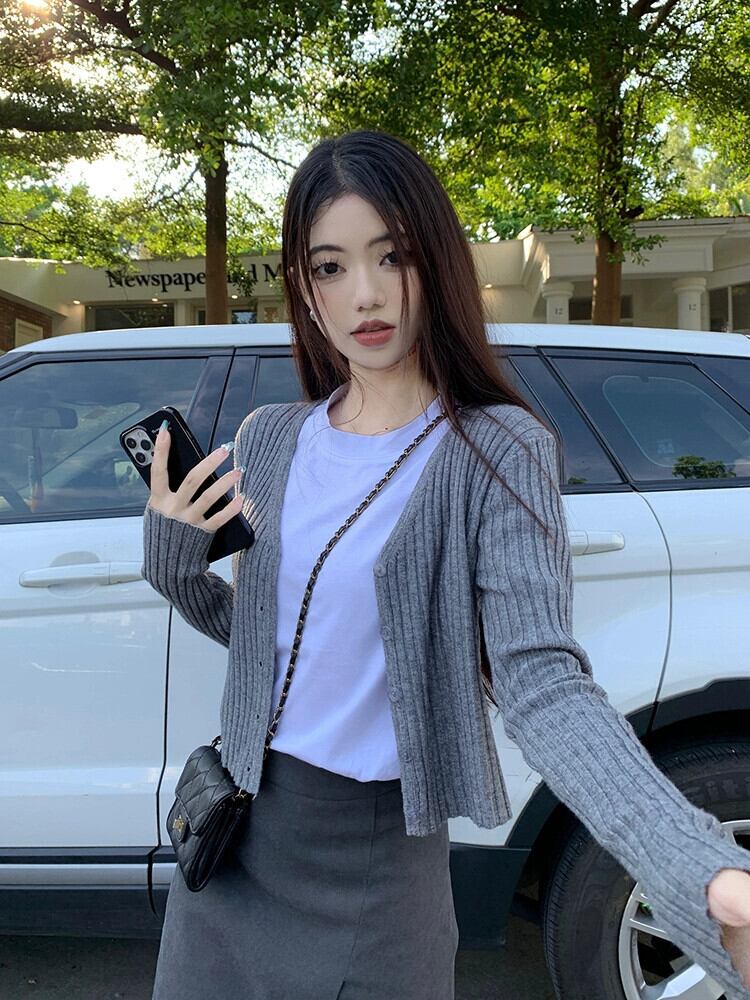 色:気質グレーのカーディガンセーター,白い綿のTシャツ,グレーのスカート,ブロガー募集オーダー