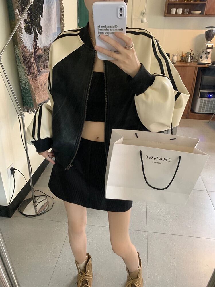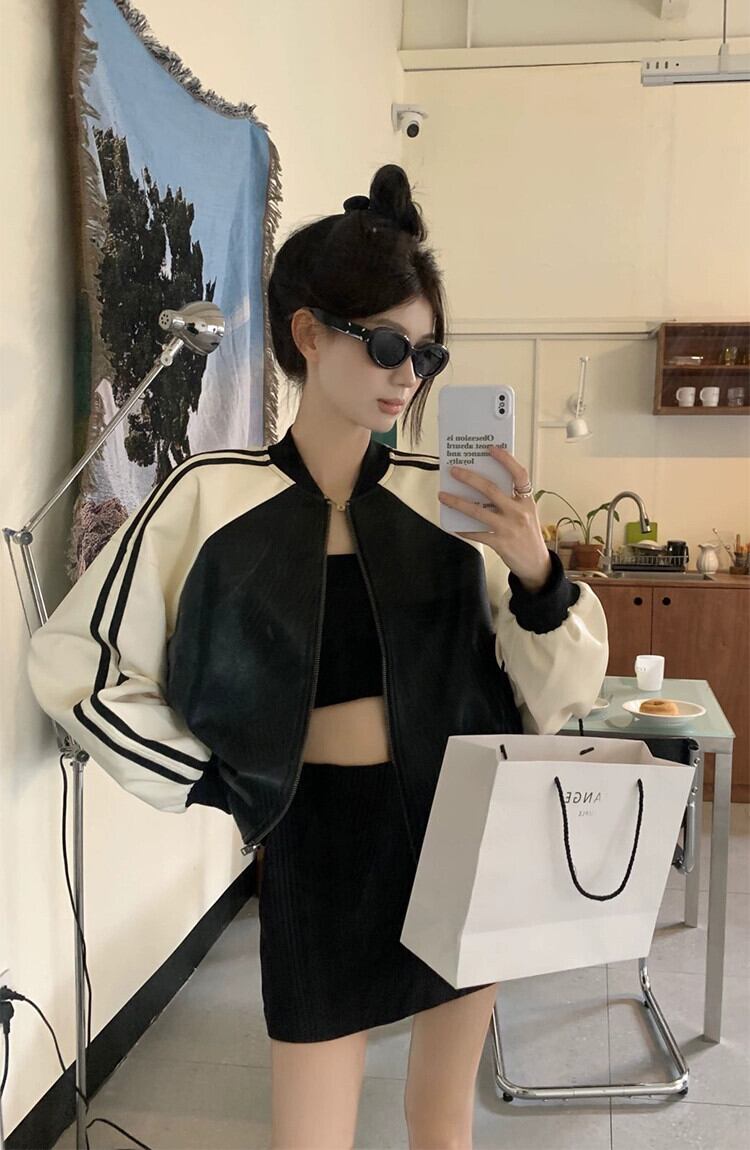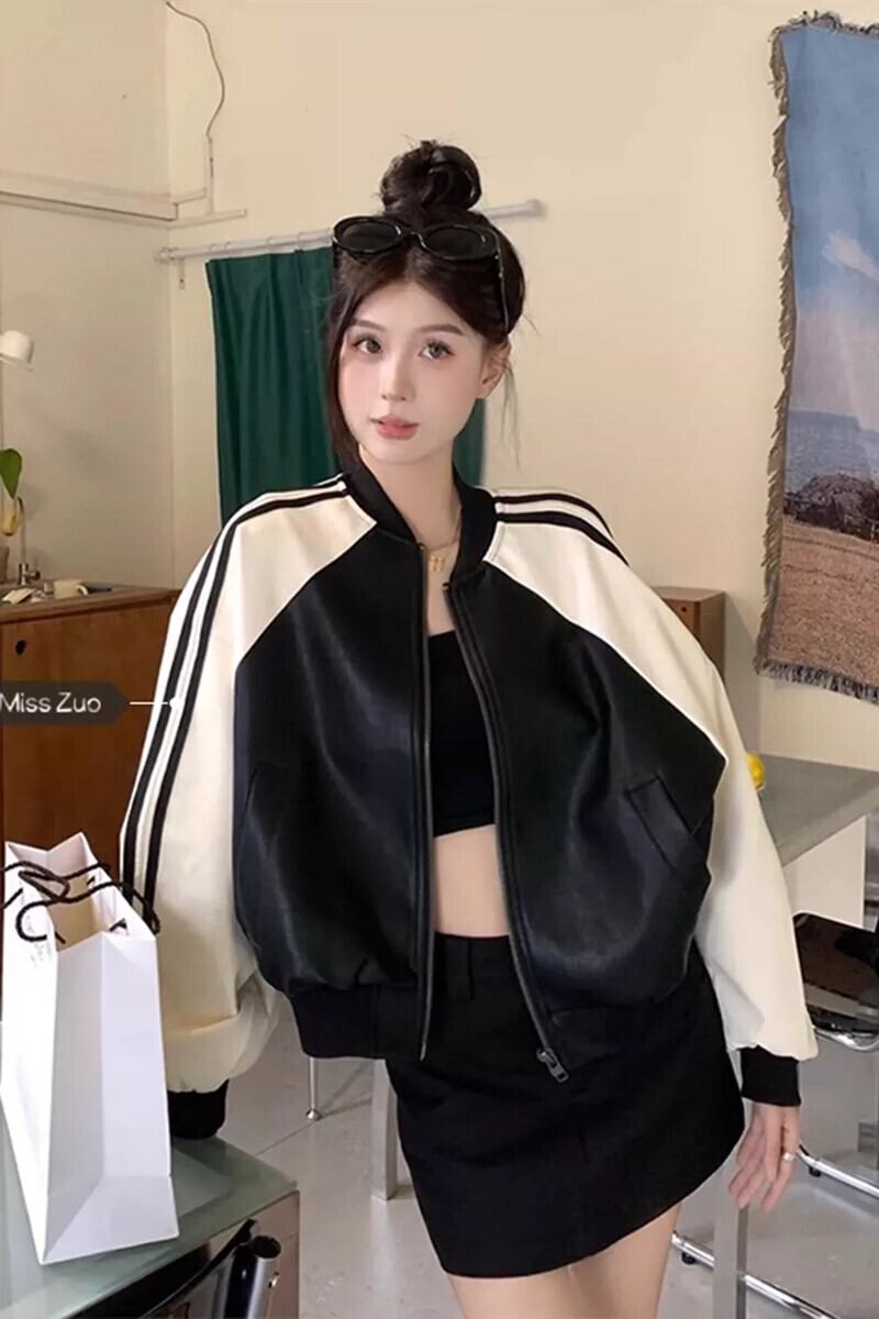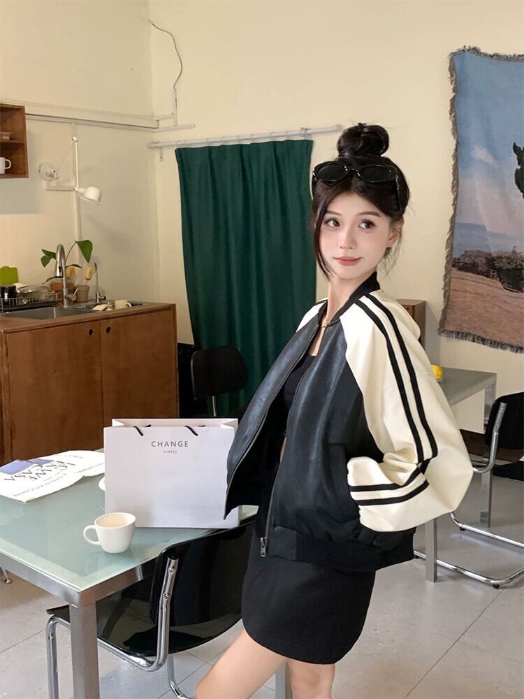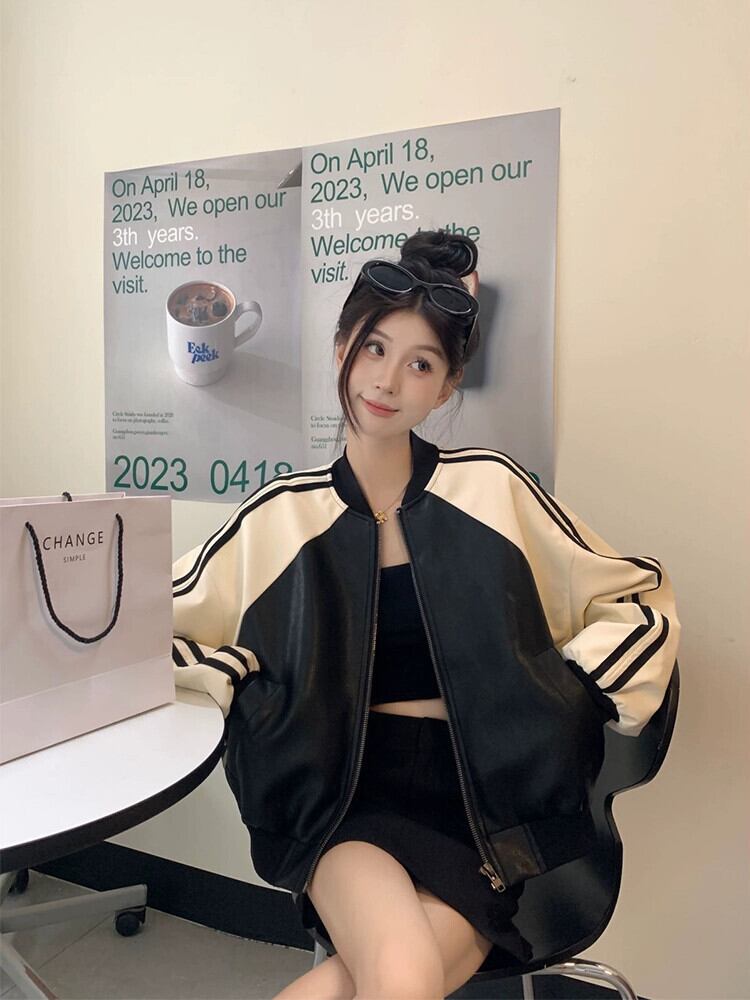 コントラストカラー野球ユニムレザージャケット女性秋 2023 新スタイルアメリカンレトロルーズリトルジャケットトレンディな オータム 秋物 8571662411602067
