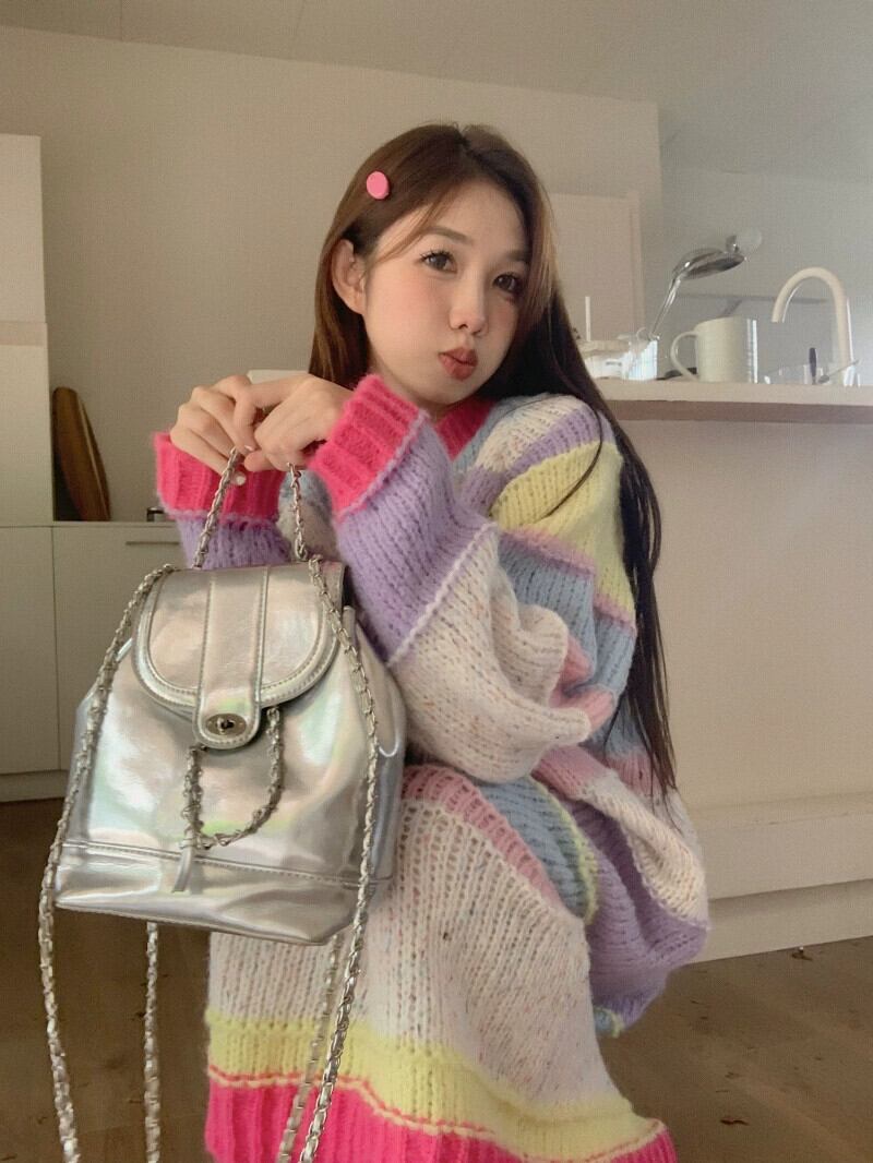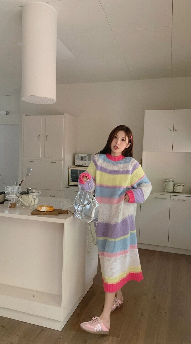 レインボーストライプセータードレス女性の秋ドーパミン着用ルーズ怠惰な甘い年齢を減らすニットロングスカート 大人ガーリー スウィート キュート カジュアル オータム 秋物 8571611265918974