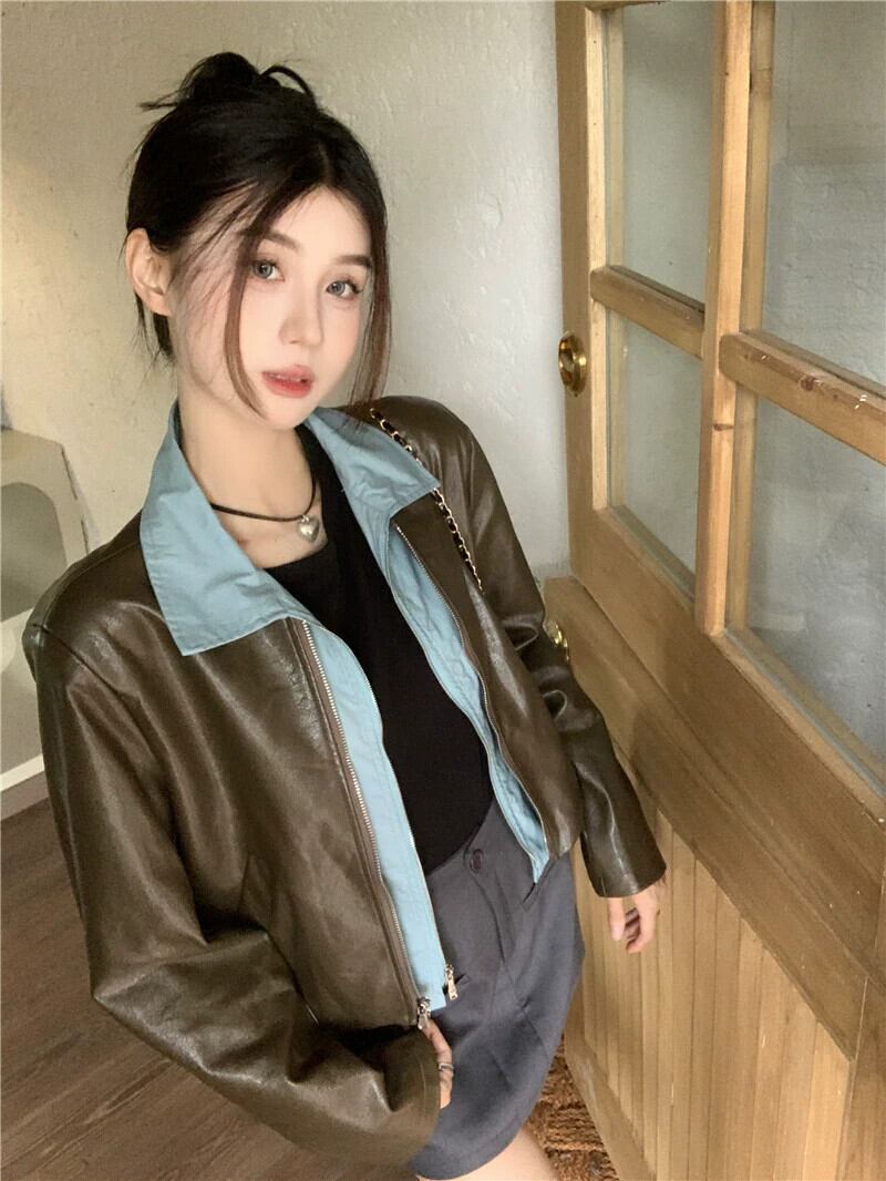 カラーブロックフェイクツーピースレザージャケットレディース2023秋新デザインアメリカンレトロショートPUレザージャケット オータム 秋物 8571662549349066