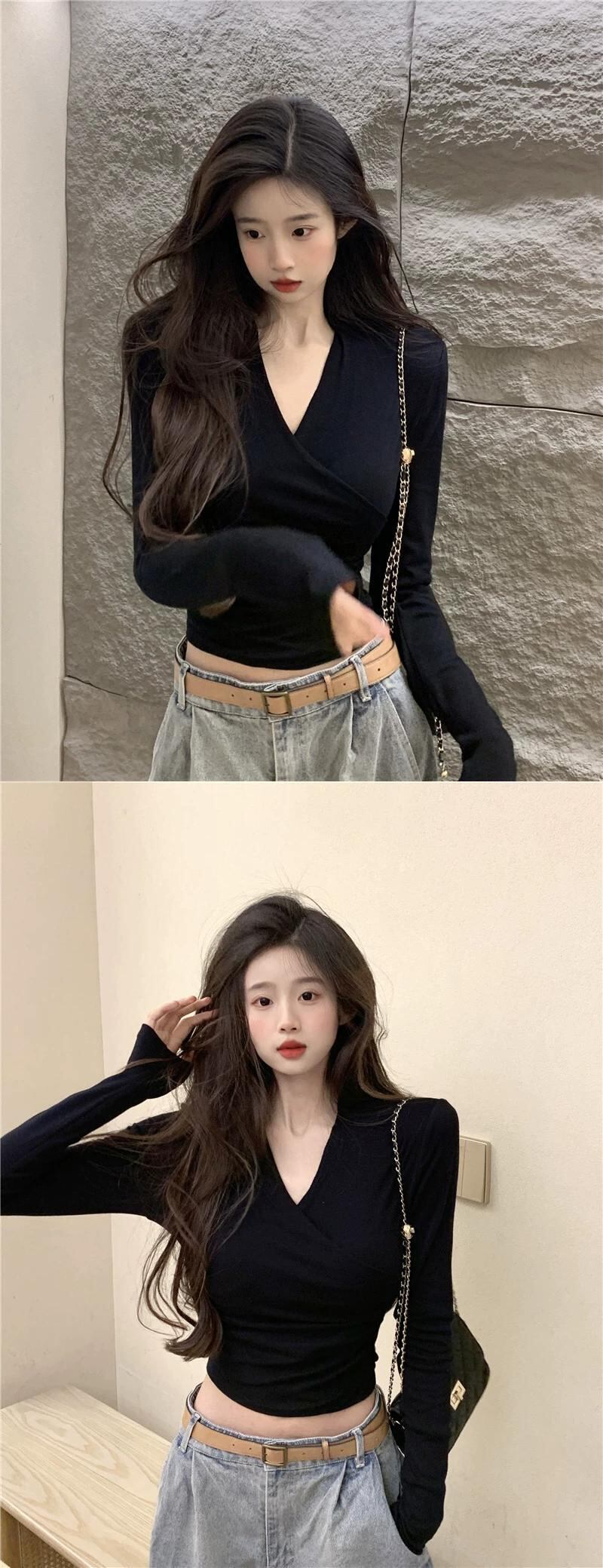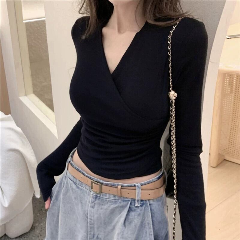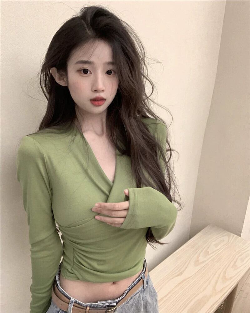 V ネックショートトップ女性の秋冬インナーレイヤリングシャツ 2023 新しい純粋な欲望ネクタイタイトグリーン長袖 T シャツ ロング オータム 秋物 ウィンター 冬物 Vネック Tシャツ ピュア 8571620296612392