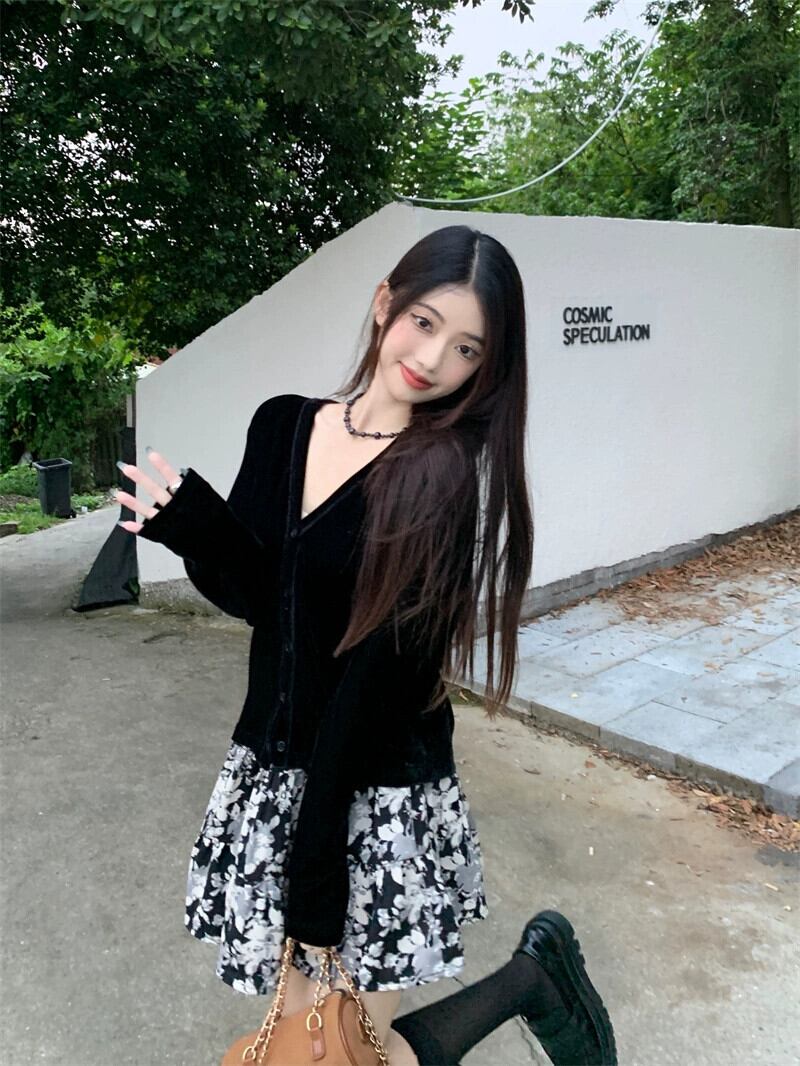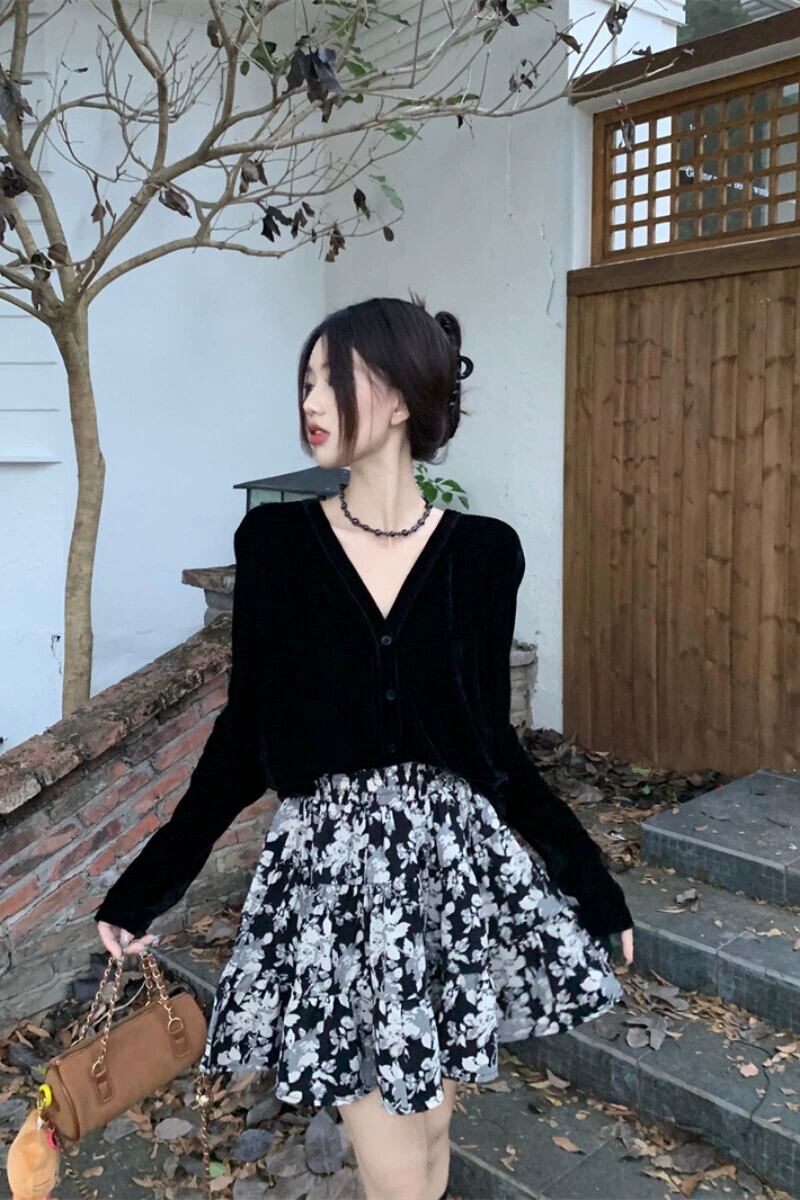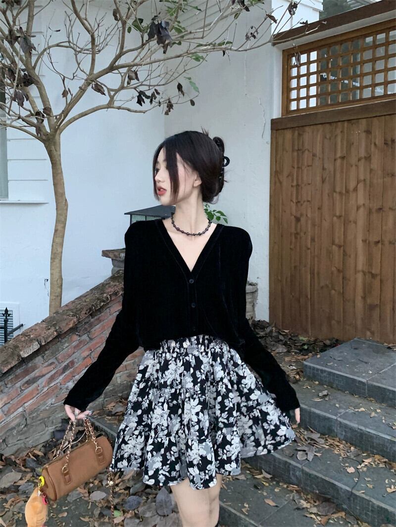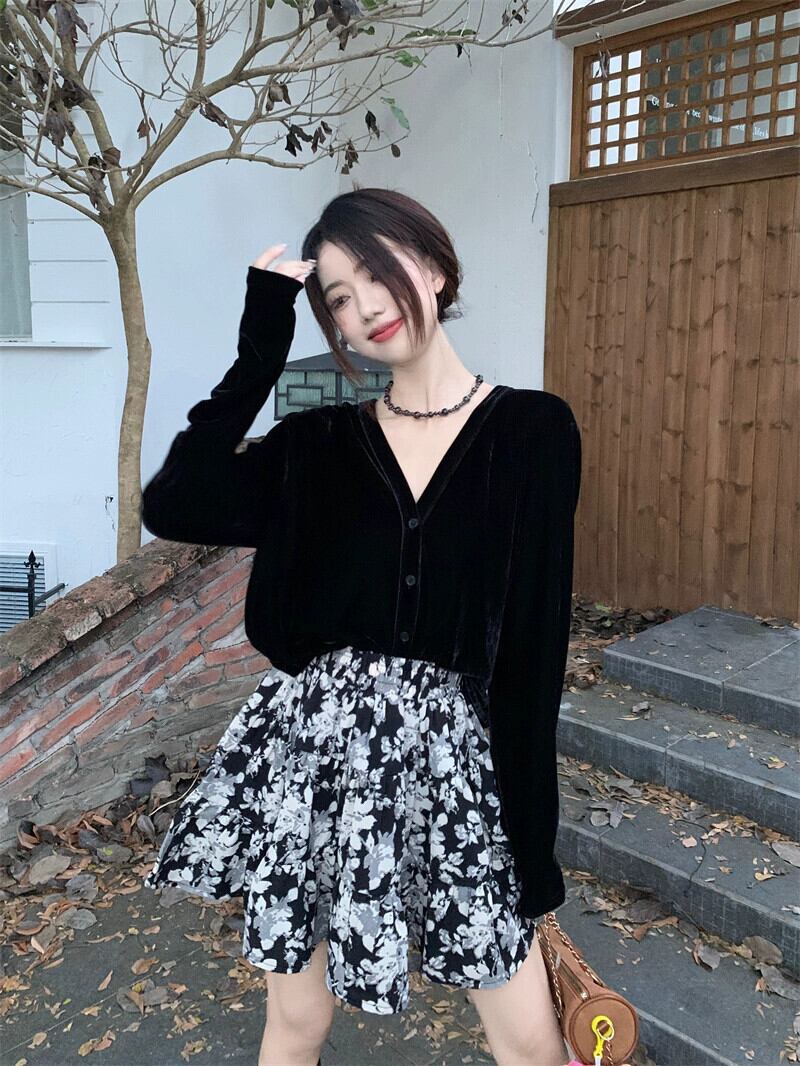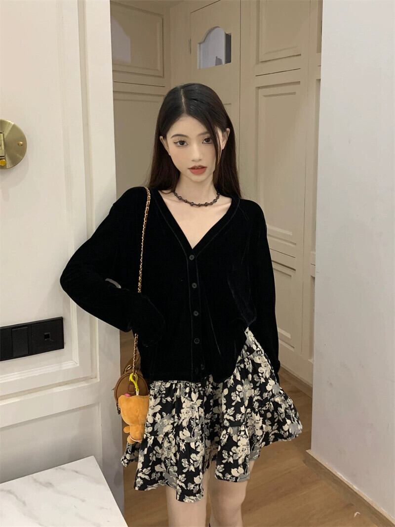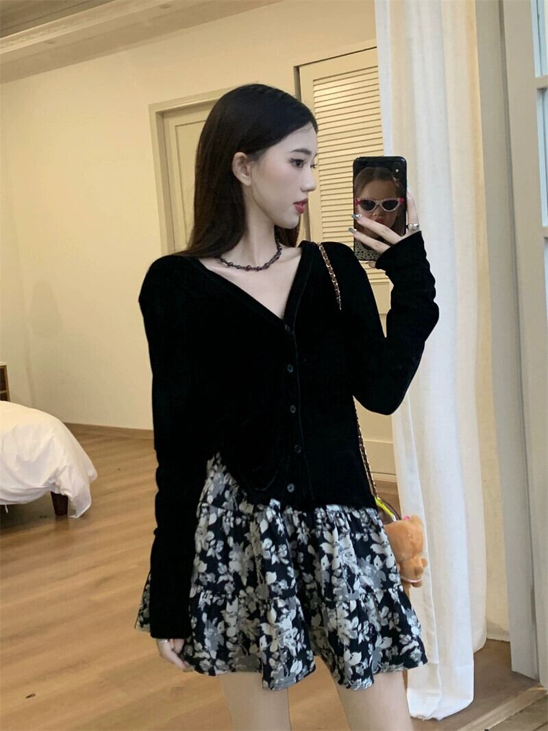 ブラックベルベット長袖シャツレディース2023年初秋新作フレンチスタイルの優しい気質のハイエンドVネックトップ ロング オータム 秋物 8571666757568699