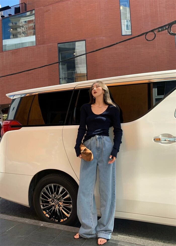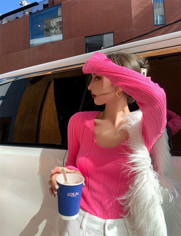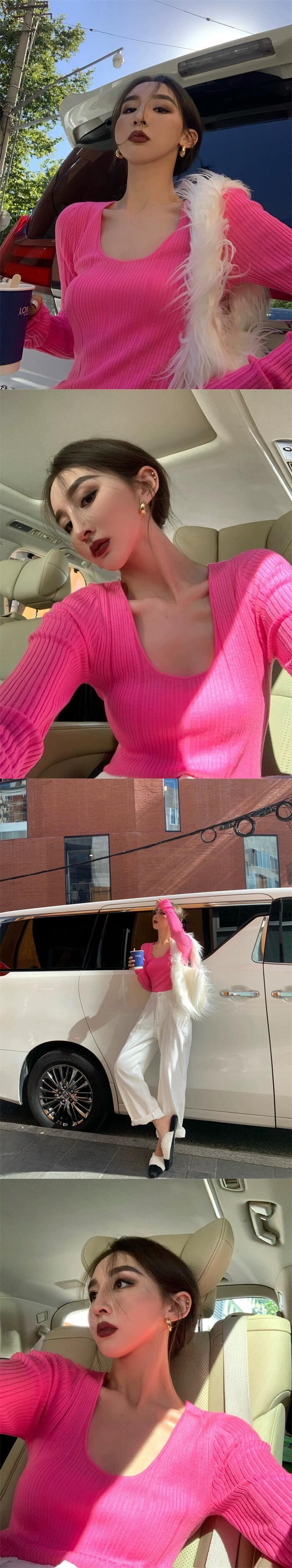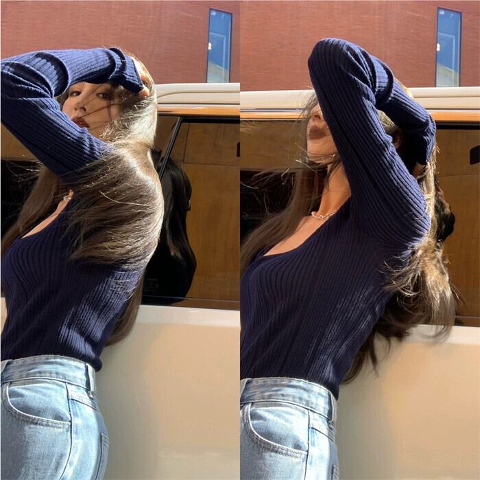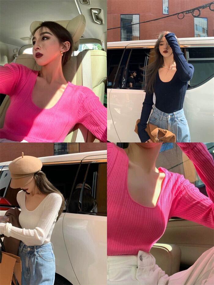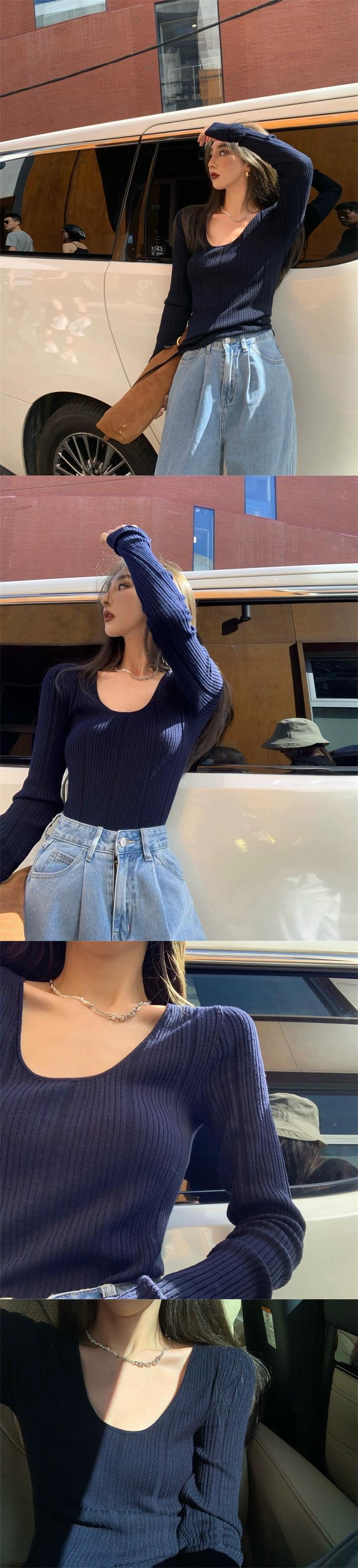 ネイビーブルーニットボトリングシャツ女性の秋と冬のインナーセーター2023新しい痩身Uネックトップ オータム 秋物 ウィンター 冬物 857163210831156