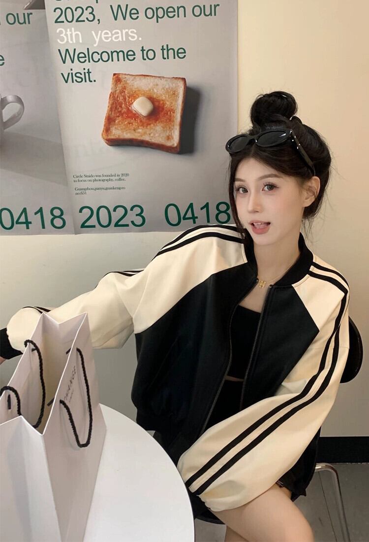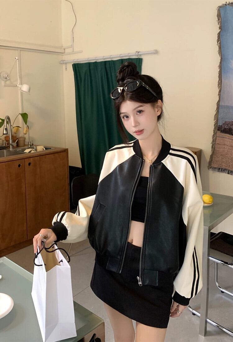 コントラストカラー PU レザージャケットの女性の秋 2023 新スタイルアメリカンレトロ小さな 2 バー野球ユニムレザージャケット オータム 秋物 8571694500368994