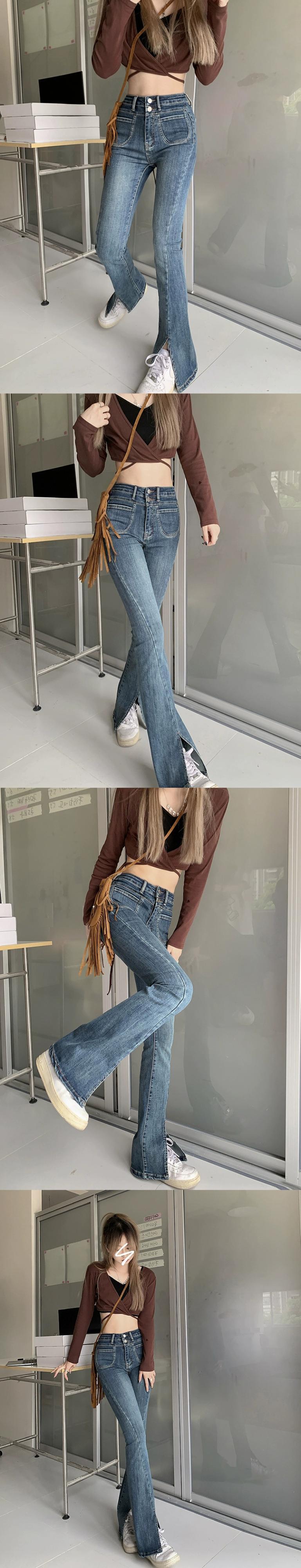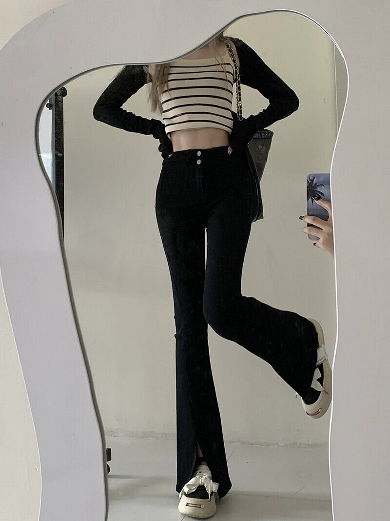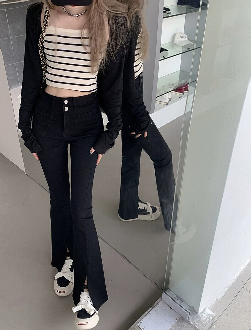黒スリットジーンズ女性のウエストスリムマイクロベルパンツ秋 2023 弾性スリムフロアモップパンツ ブラック エラスティック 伸縮 オータム 秋物 8571644602556576