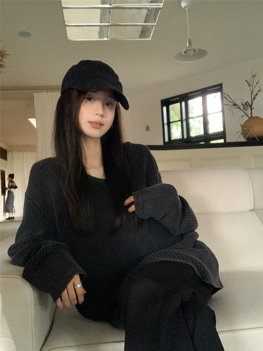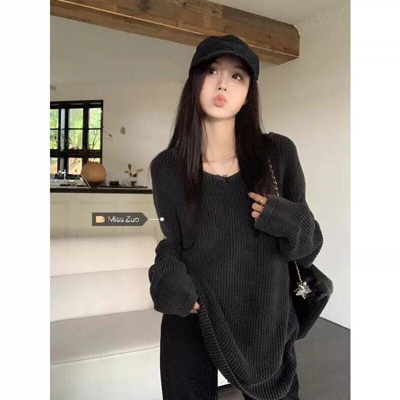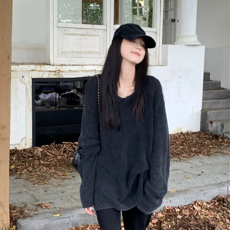 ウォッシュ加工大きいサイズのセーターの女性秋 2023 新しいレトロなゆるい怠惰なスタイルのミッドレングス V ネックセーター 大きめサイズ オータム 秋物 Vネック 8571695358983791