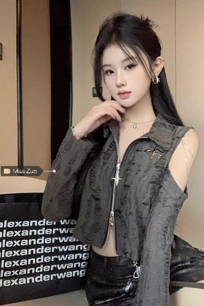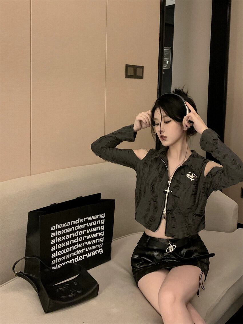 ラペルオフショルダーショートトップ秋デザインニッチスイートクールシックホールジッパー長袖Tシャツの女性 ロング 大人ガーリー スウィート キュート カジュアル オータム 秋物 8571662581348205