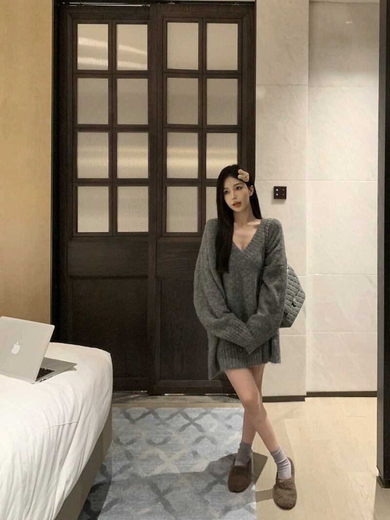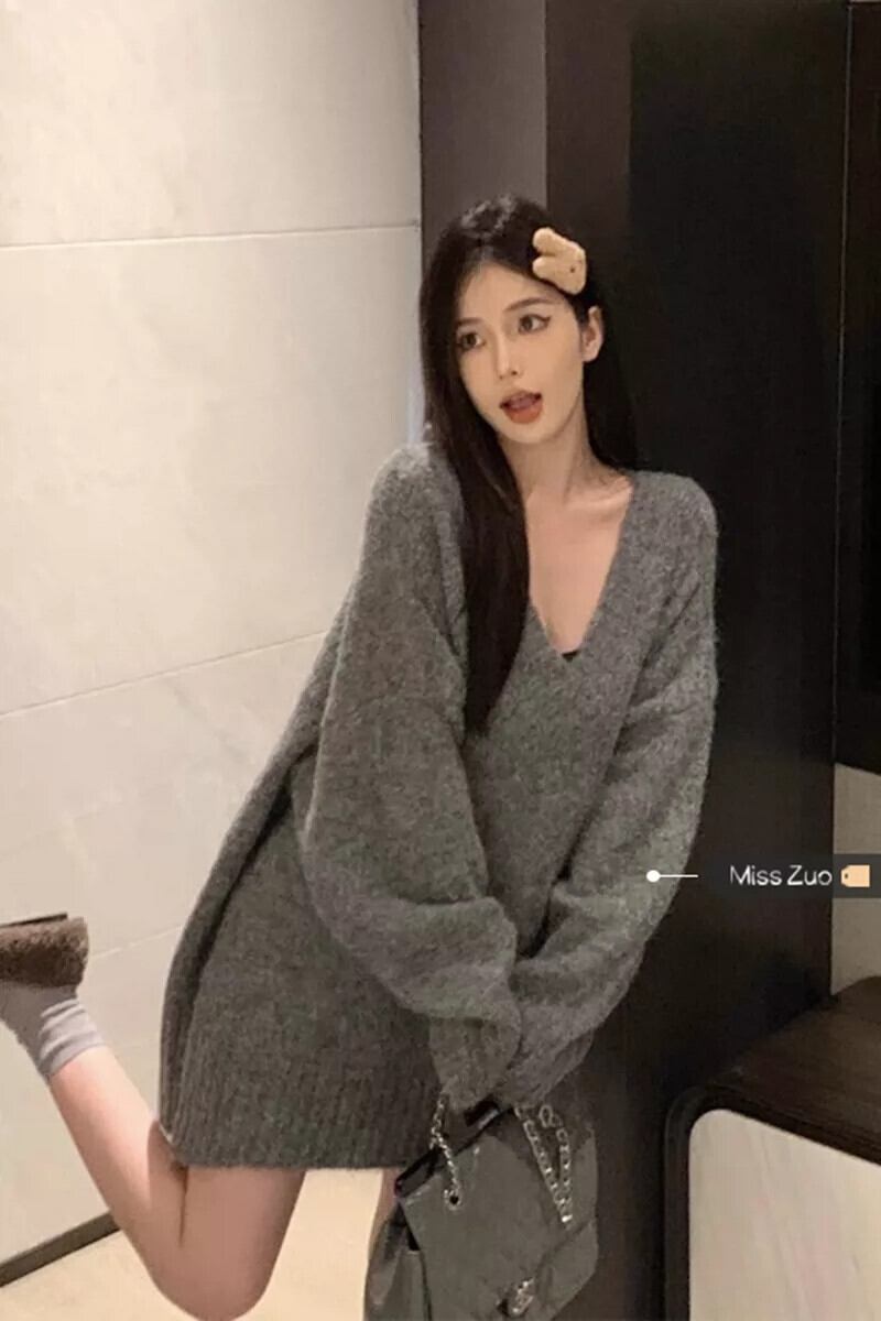 グレーのミドル丈セーター女性のお尻カバー 2023 新しい秋緩い怠惰なスタイル V ネックプルオーバーセーター オータム 秋物 Vネック 8571641036408453