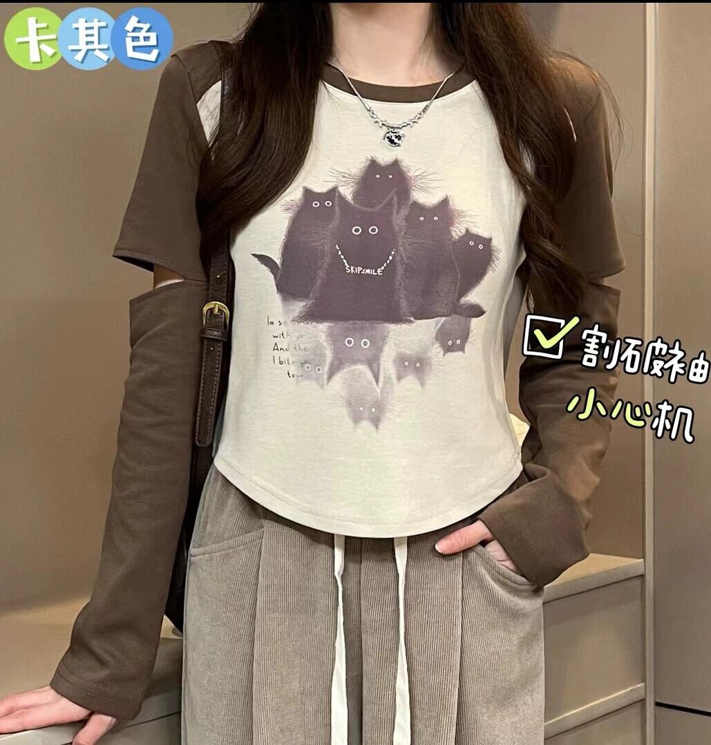 コントラストカラー長袖 Tシャツ女性秋 2023 新しいアメリカンレトロデザイン控えめなボトリングシャツショートトップ ロング オータム 秋物 8571615330924347