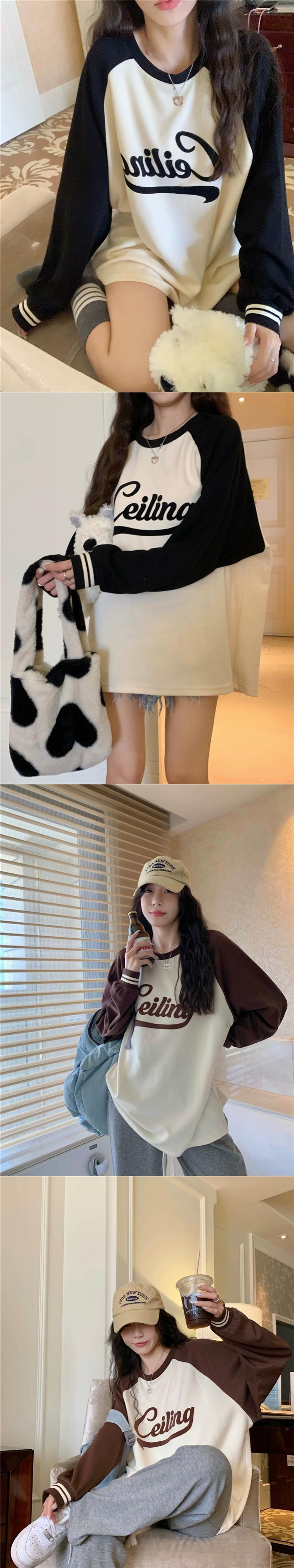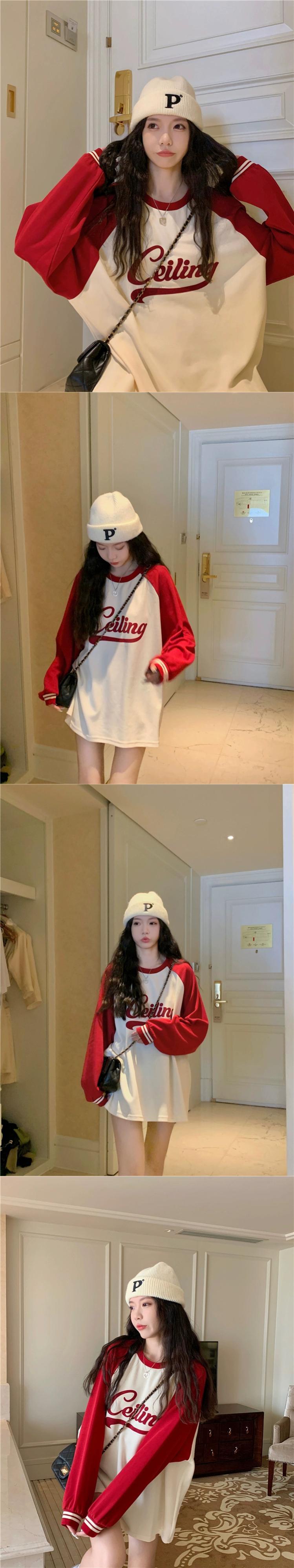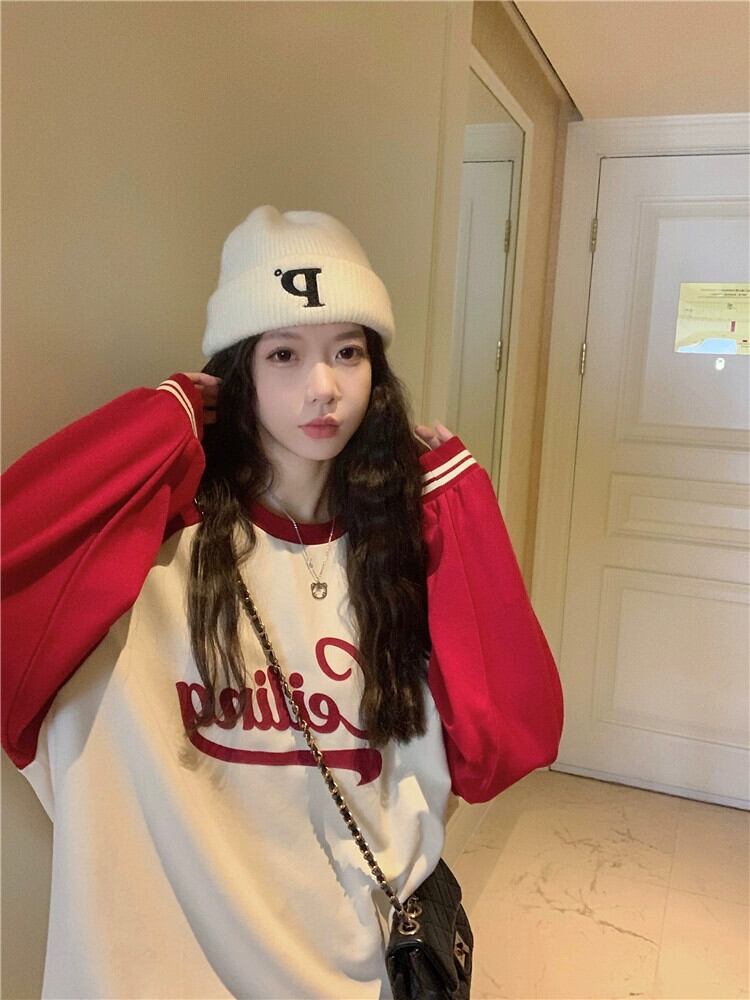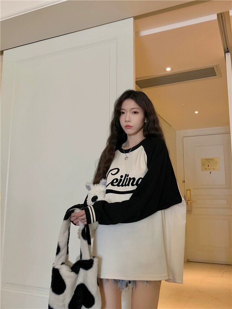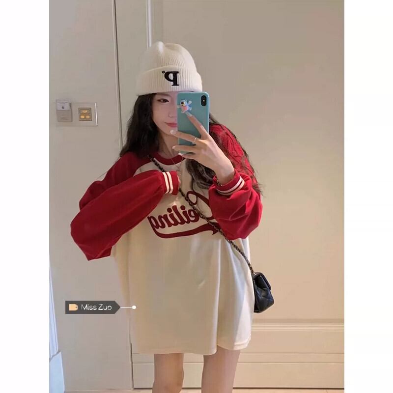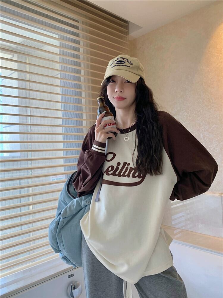 コントラストカラーラグラン長袖トレーナー女性秋 2023 新しいアメリカンレトロニッチ怠惰なスタイルのミッドレングスのトップトレンド ロング オータム 秋物 8571674478291835