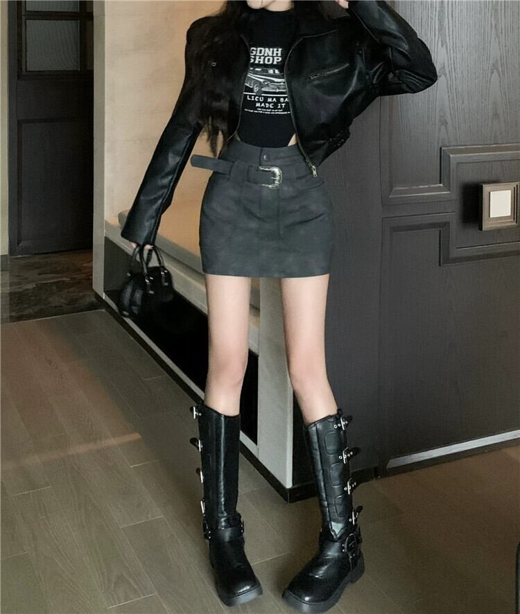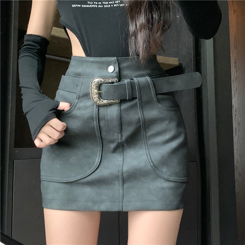 黒革のスカートスカート女性秋ハイウエスト A ラインスカートアメリカンレトロスーパー痩身お尻カバーショートスカート ブラック オータム 秋物 レザー Aライン 8571619536381429