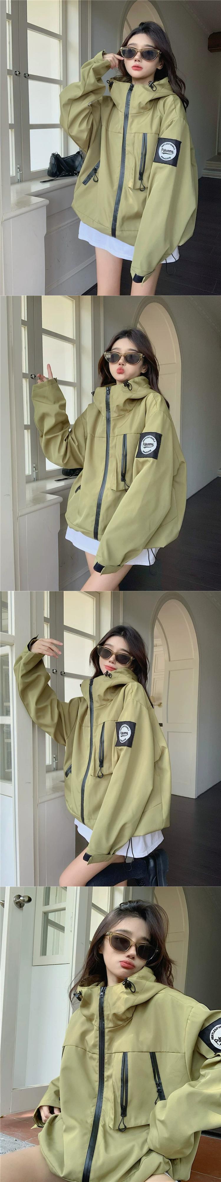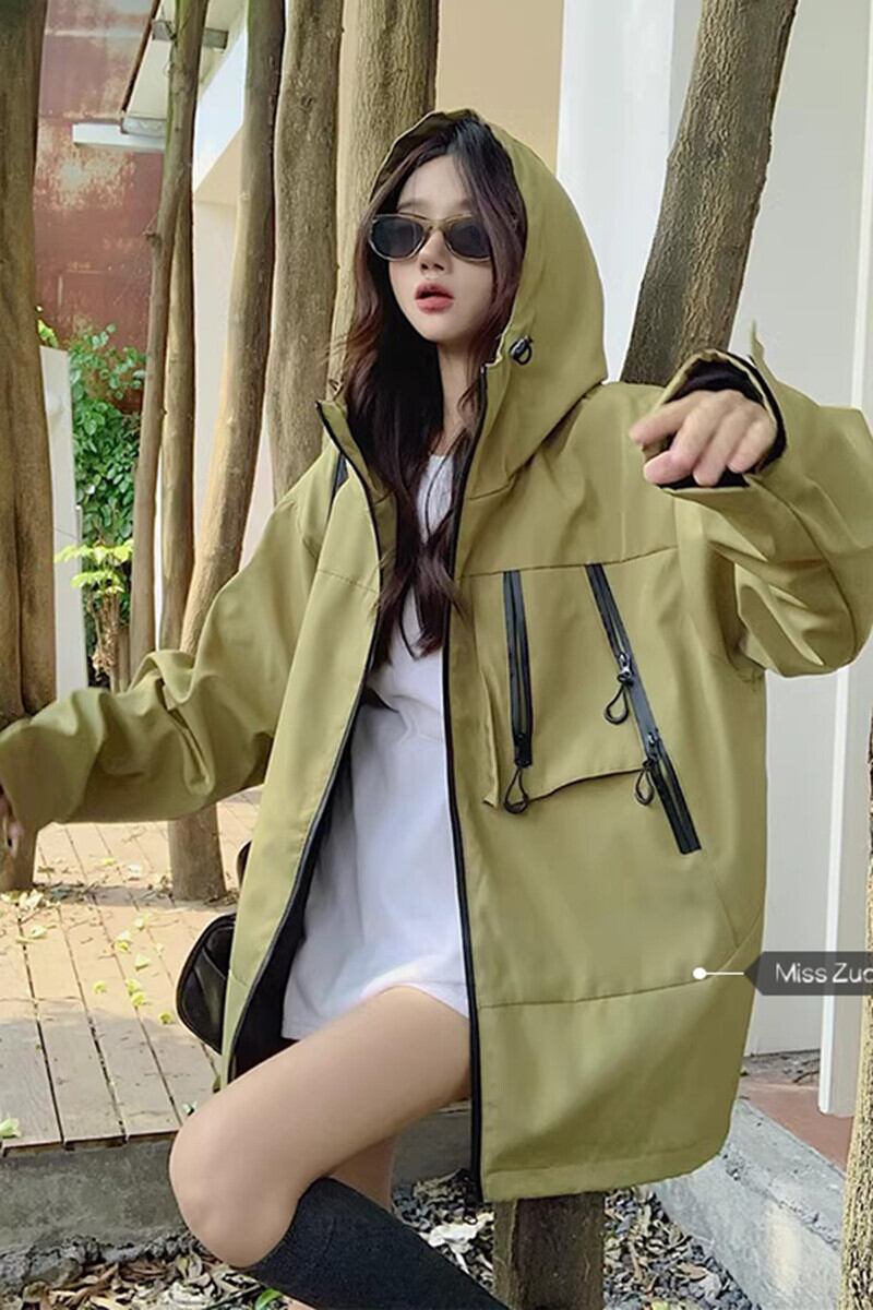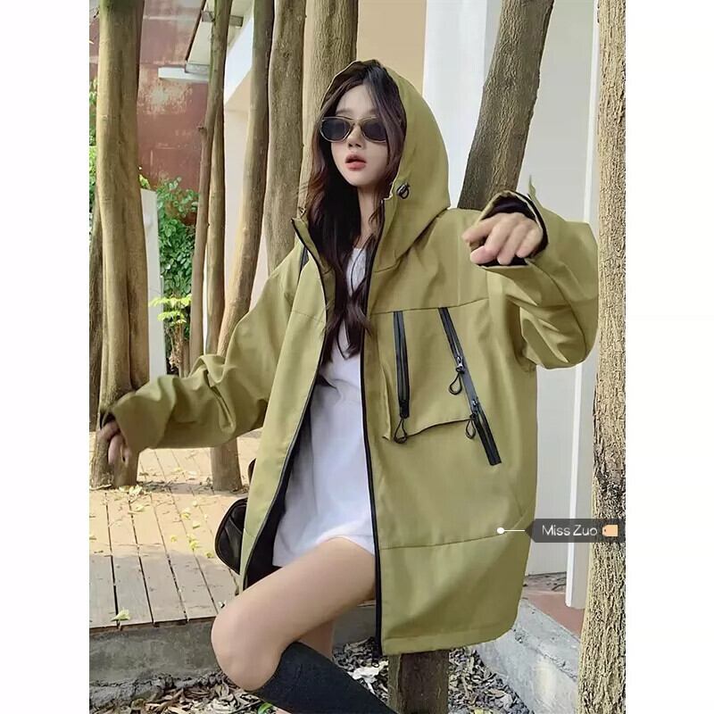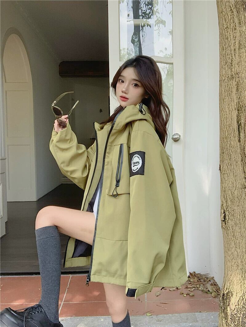 後期グリーン フード付きジャケット レディース 秋 2023 アメリカン レトロ ルーズ レイジー ウィンド ジップ ジャケット オータム 秋物 8571664722440314