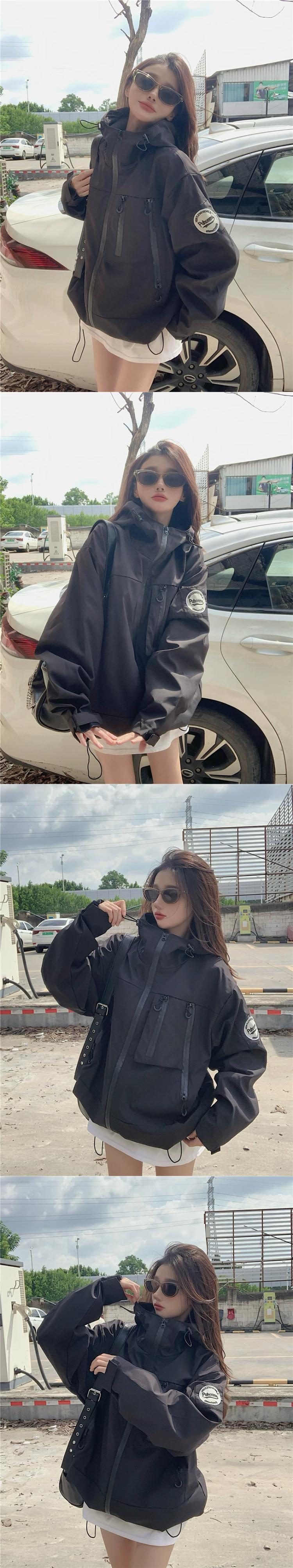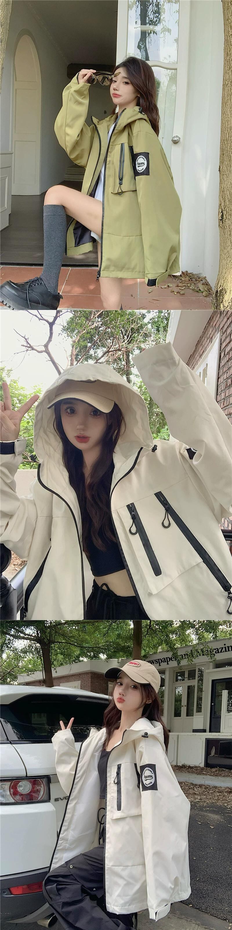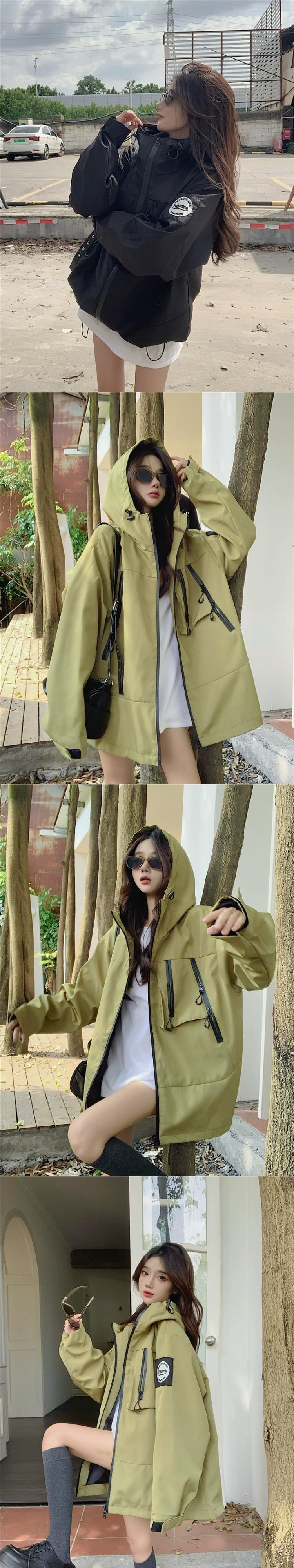後期グリーン フード付きジャケット レディース 秋 2023 アメリカン レトロ ルーズ レイジー ウィンド ジップ ジャケット オータム 秋物 8571664722440314