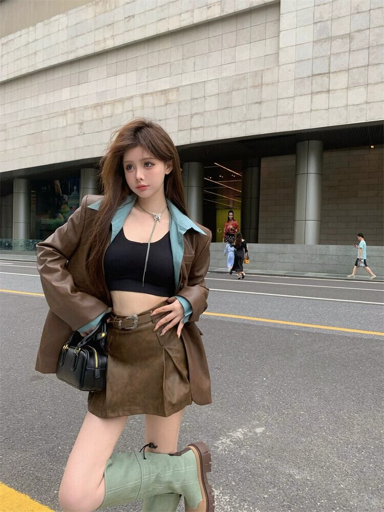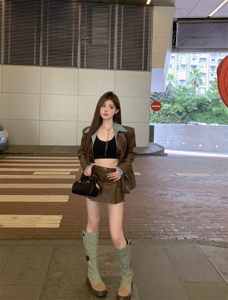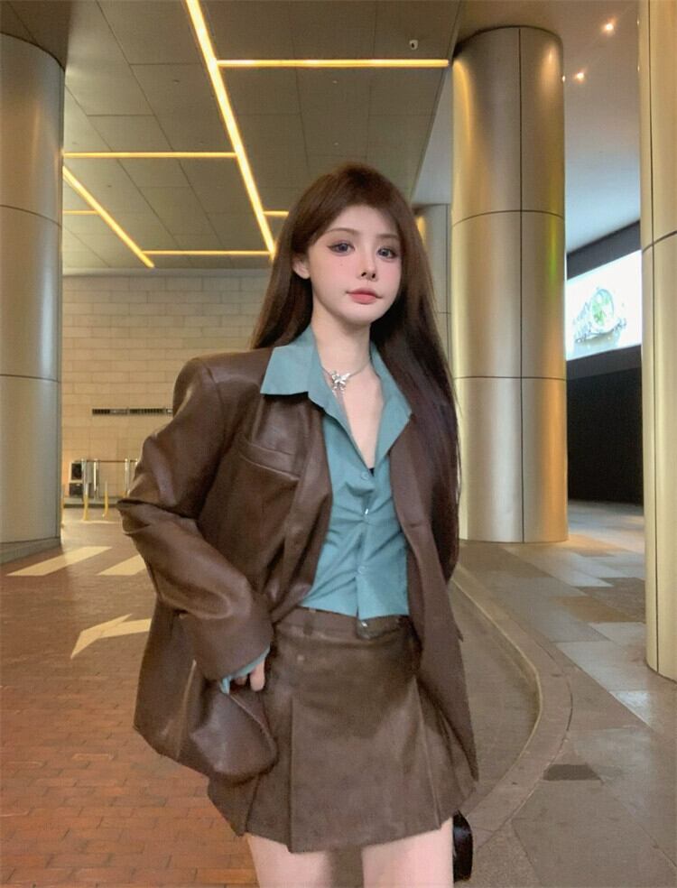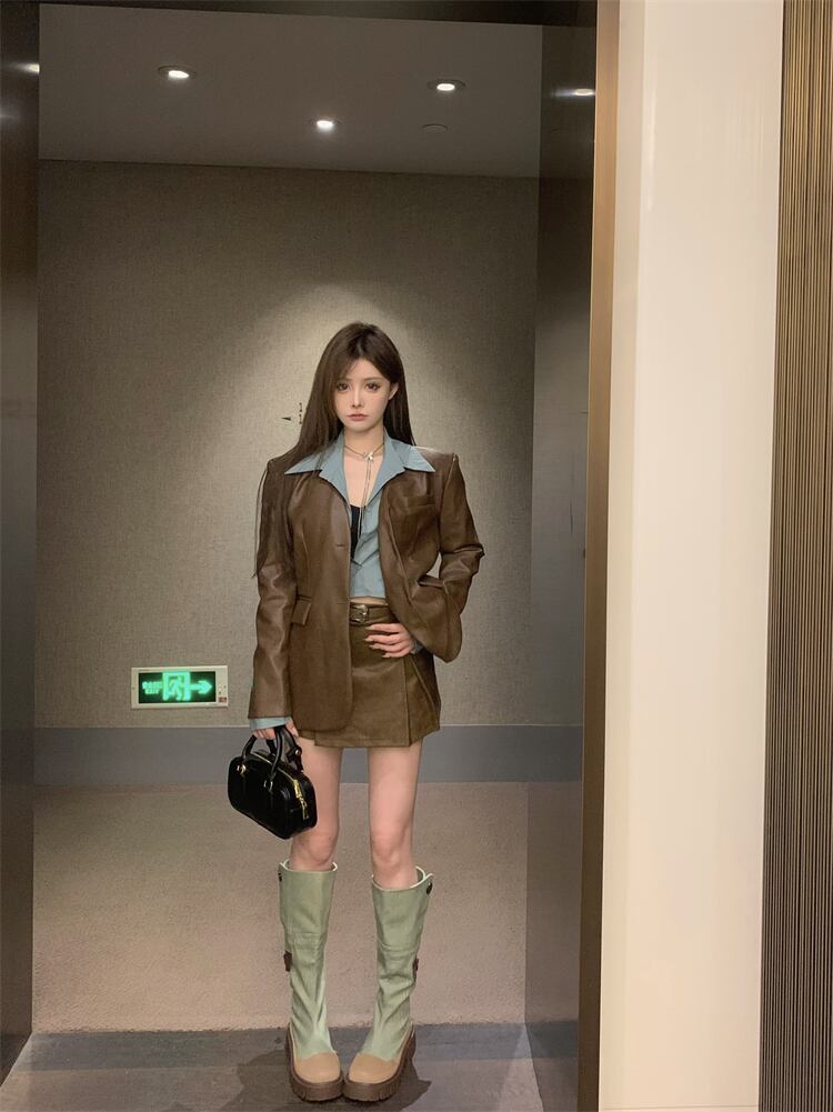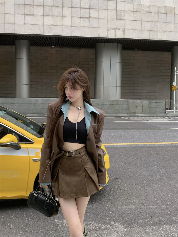 フェイクツーピースレザージャケットレディース秋メイラードウェアデザインアメリカンレトロスイートクールスタイルPUレザージャケット 大人ガーリー スウィート キュート カジュアル オータム 秋物 8571679039636388