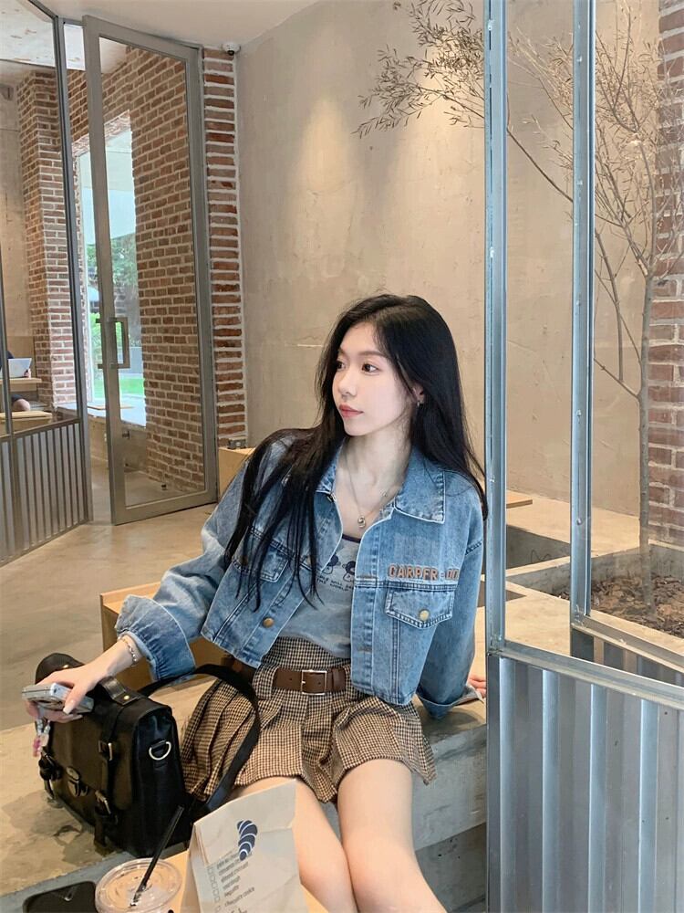 ショートデニムジャケットの女性 2023 秋の新しいスタイルのアメリカンレトロな小さな刺繍文字ジャケットトップ レッド オータム 秋物 8571618508535002