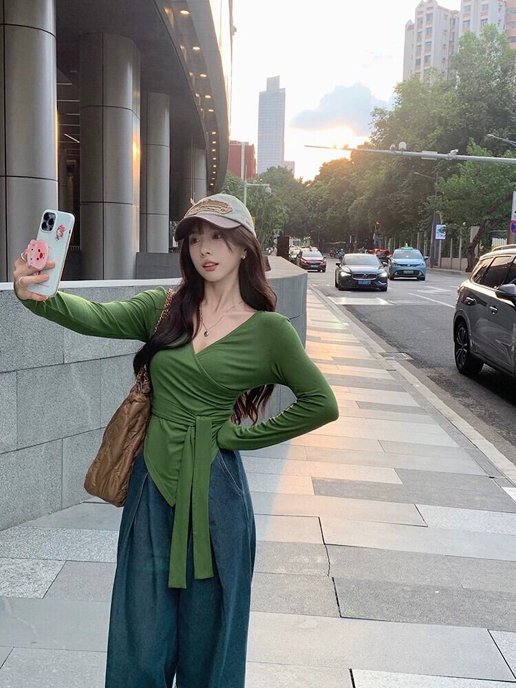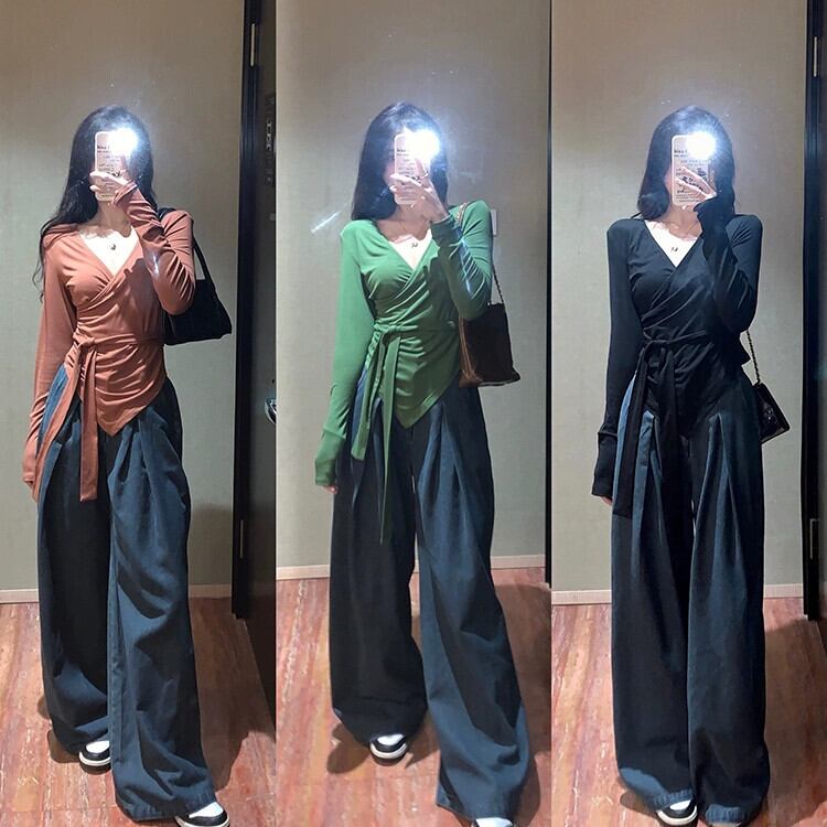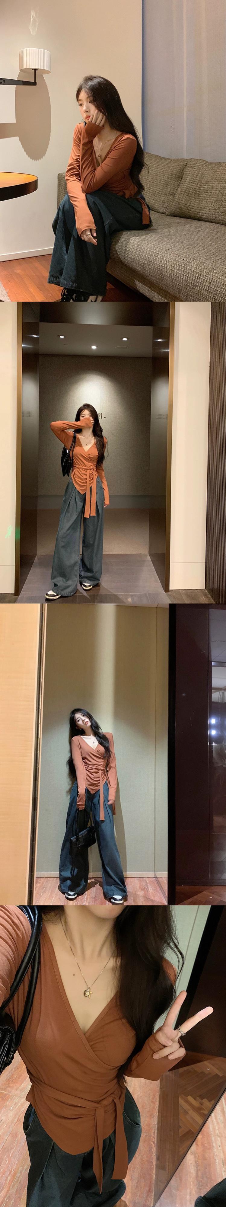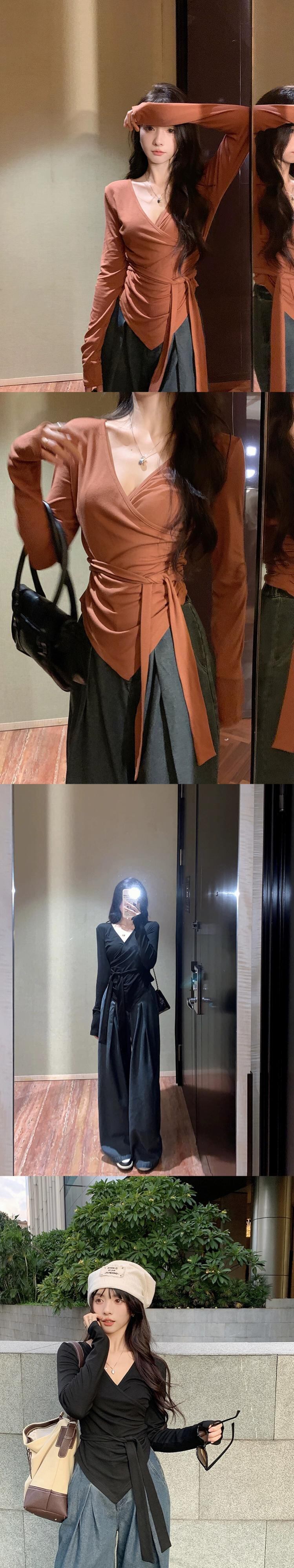 不規則な V ネックウエストトップ女性 2023 秋の新デザインスリムボトムブラウン長袖 T シャツ ロング オータム 秋物 Vネック Tシャツ 857164961433130