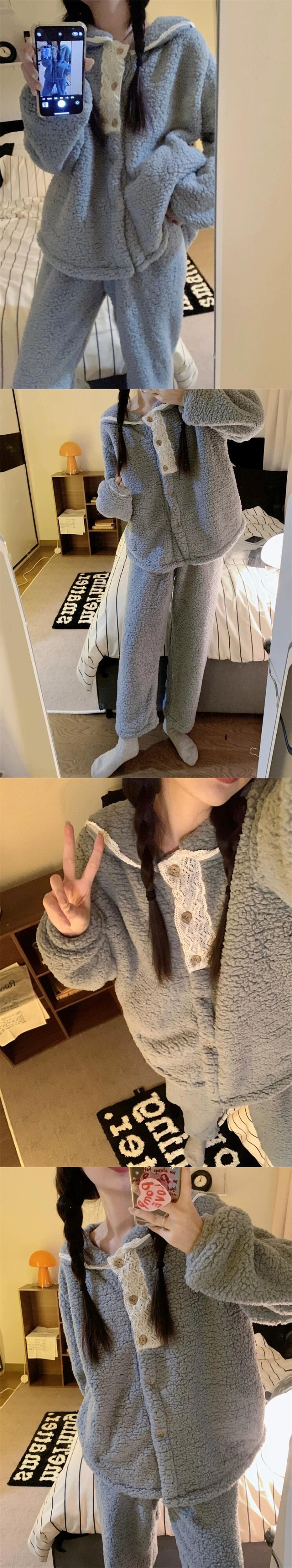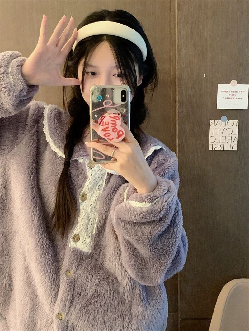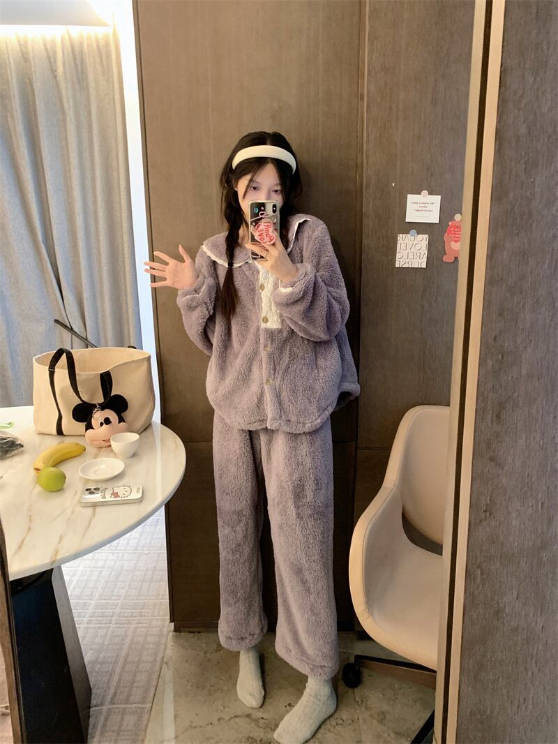冬のフランネルパジャマ女性プラスベルベットと厚みのあるインターネットセレブスタイルの甘くてかわいいコーラルベルベットのホーム服セットは屋外でも着用できます 大人ガーリー スウィート キュート カジュアル ウィンター 冬物 8571663615850325