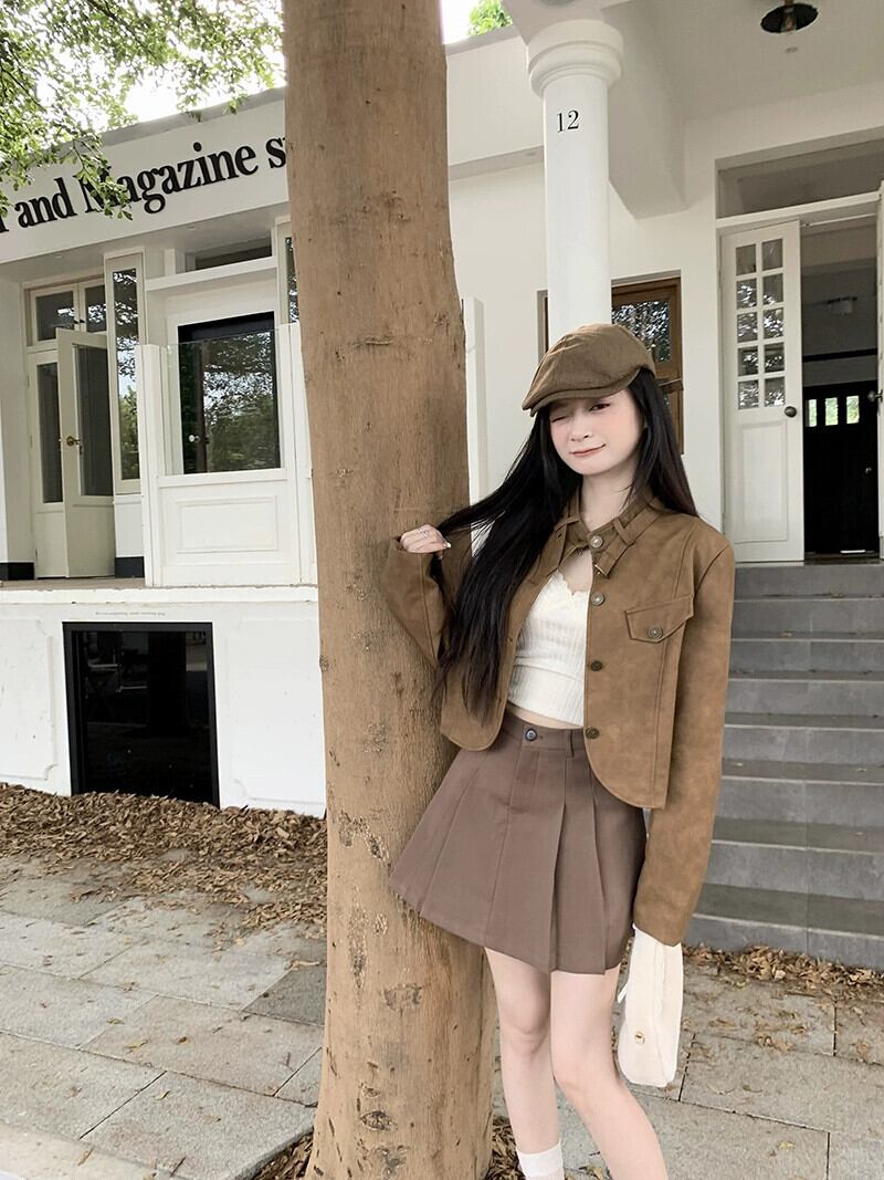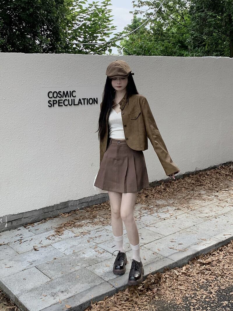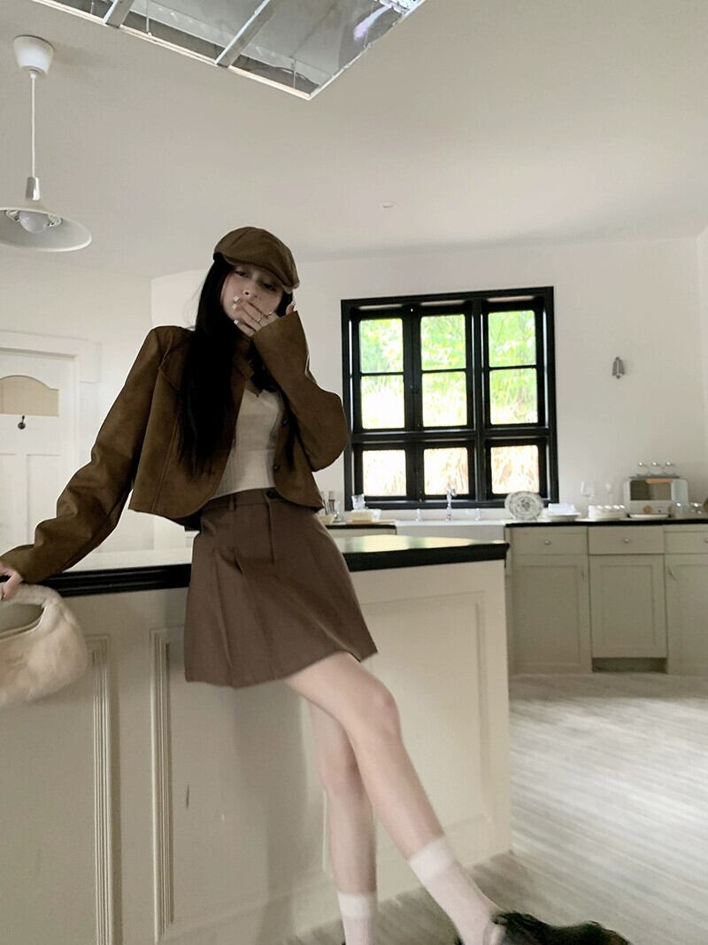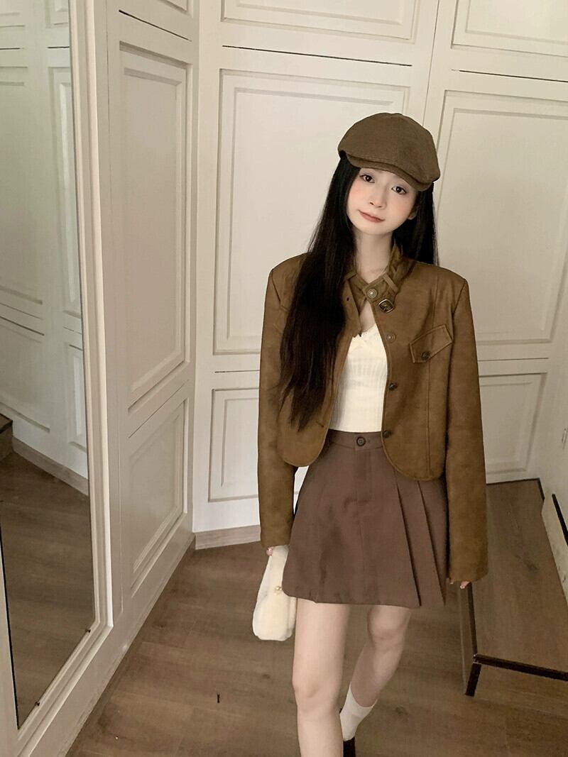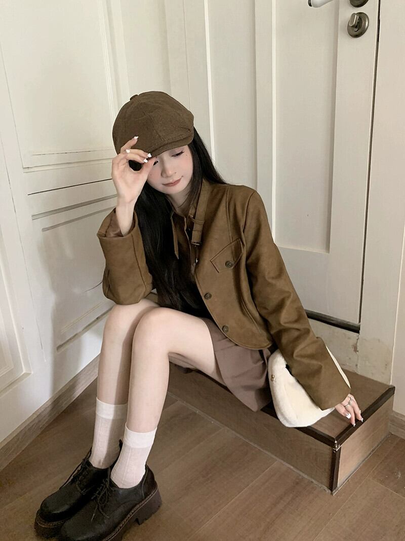 メイラードは茶色の革のジャケットを着ています小さな女性 2023 秋の新しいデザインのショート オートバイのジャケット オータム 秋物 レザー 857168328366867