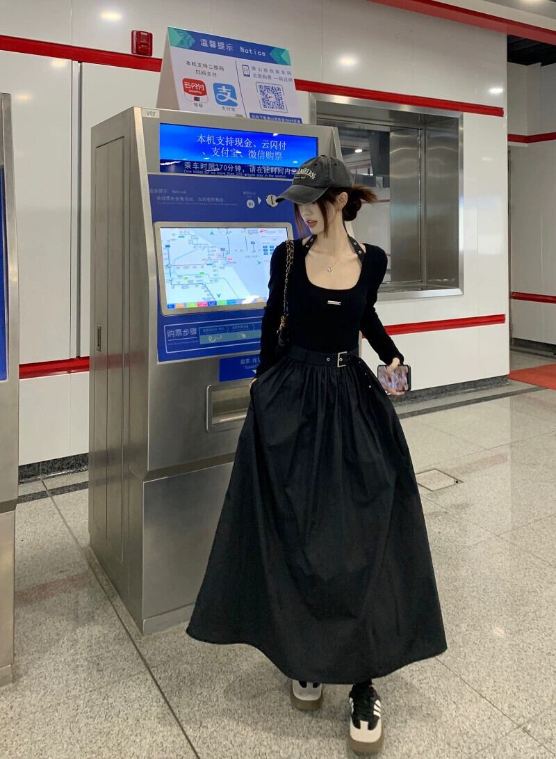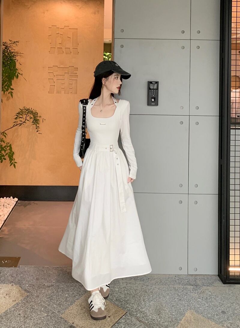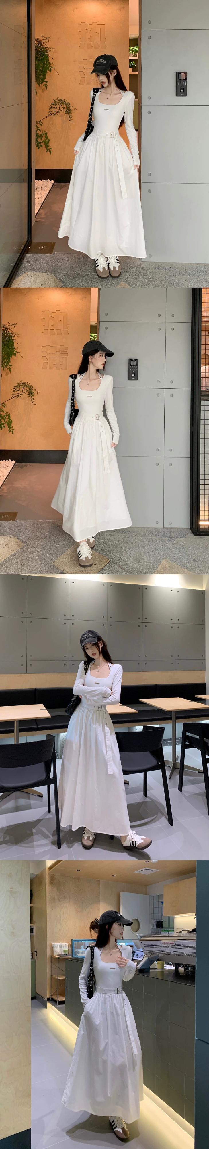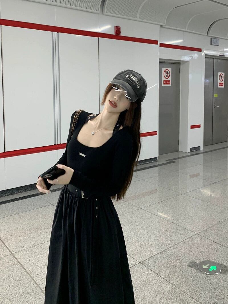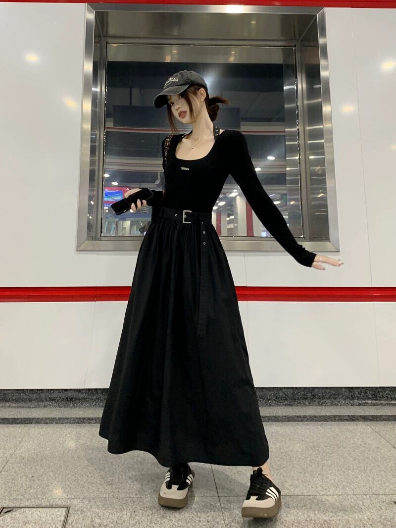 秋に着るニットスプライシング長袖ドレス、高級リトルブラックドレス、コールドスタイル、シックでユニークなロングスカート オータム 秋物 8571666659423909