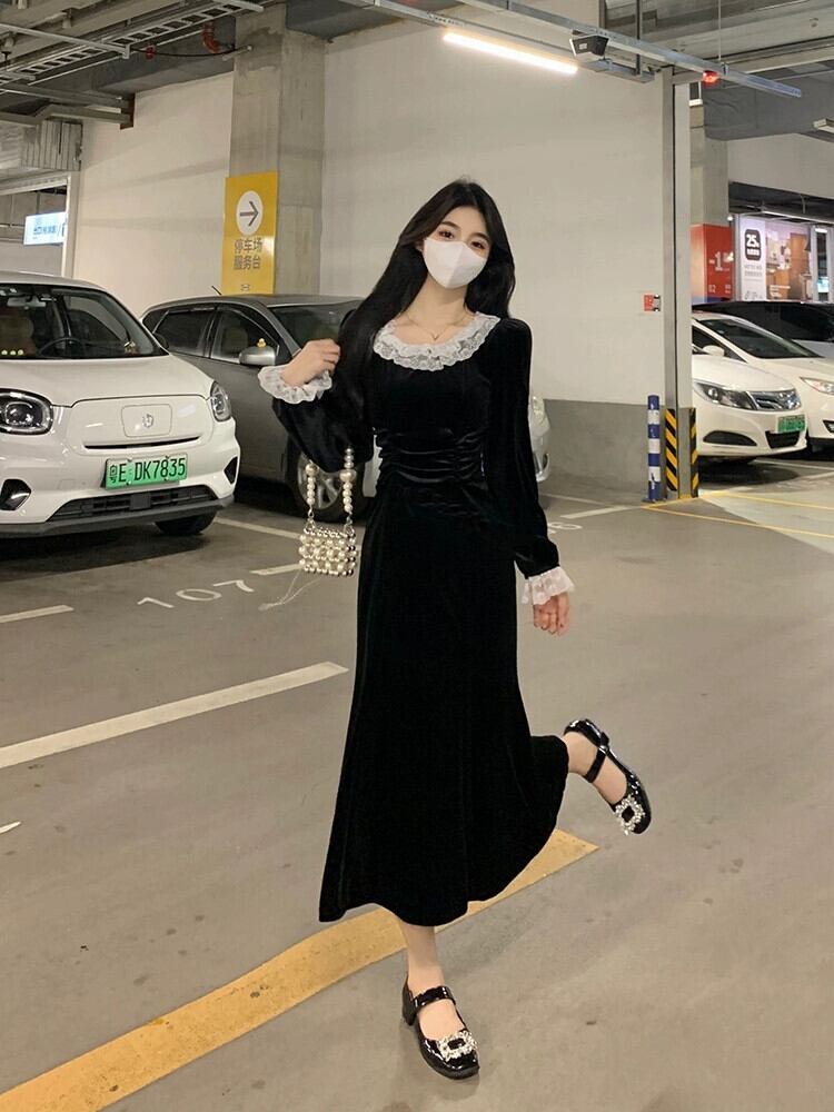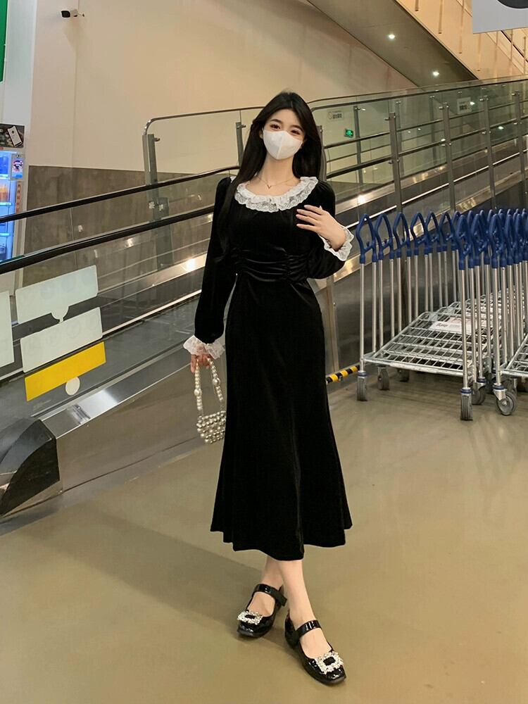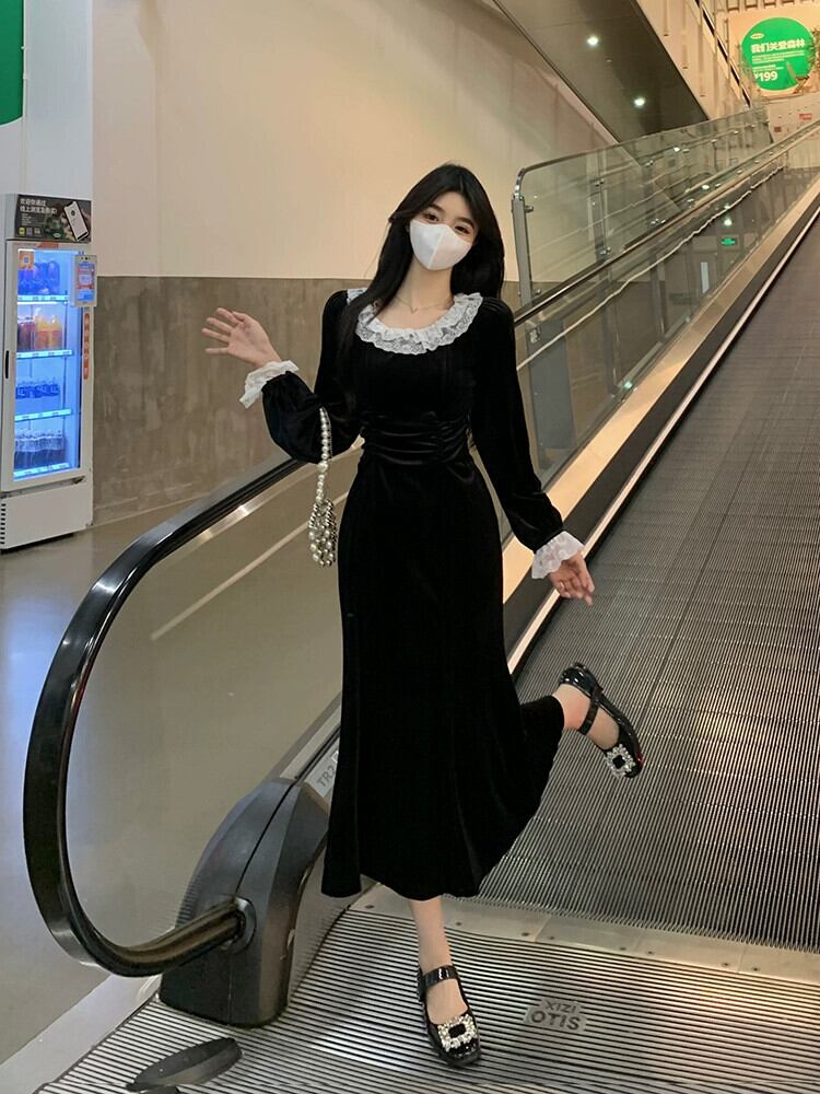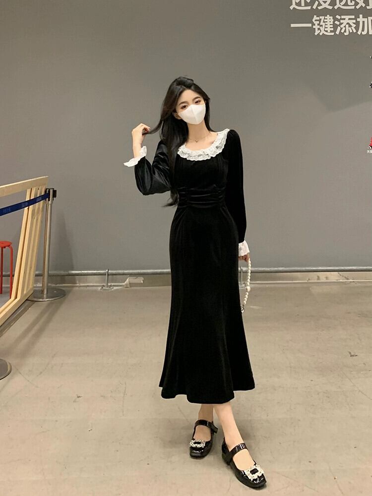 秋の黒の長袖ベルベットのドレスの女性、ハイエンドの絶妙な社交界のフィッシュテールスカート、フランスのレトロな優しいロングスカート ブラック オータム 秋物 857166351803614