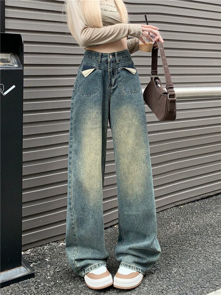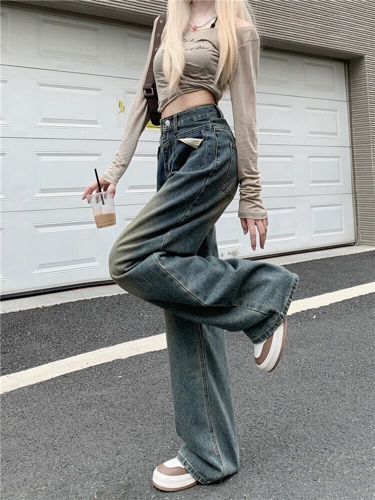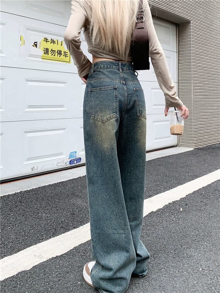 レトロなノスタルジックなブルージーンズの女性、ゆったりとしたストレートレッグ秋の人気の洋ナシ型の体型ハイウエストフロアレングスワイドレッグパンツ オータム 秋物 8571655641794982