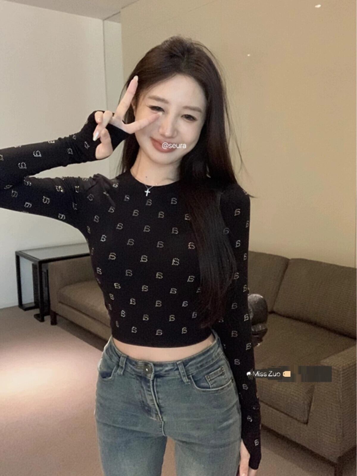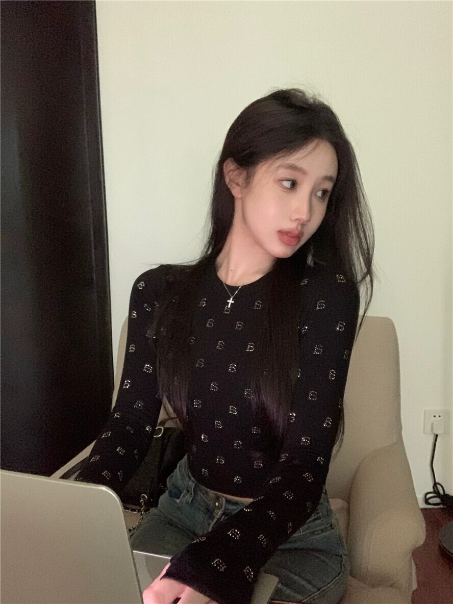 ホットダイヤモンドレタリング長袖Tシャツレディース秋インナー重ね着シャツアメリカンシック甘辛ウエスタンスタイルスリムショートトップ ロング 大人ガーリー スウィート キュート カジュアル オータム 秋物 8571691997357761
