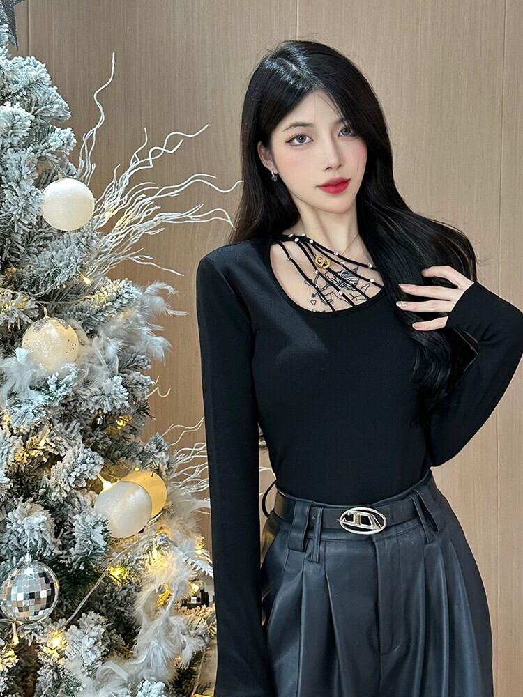 黒長袖 Tシャツの女性の秋と冬のベルベットインナーボトシャツ 2023 新しいファッションと美しいデザイントップ ロング ブラック オータム 秋物 ウィンター 冬物 8571613481923259