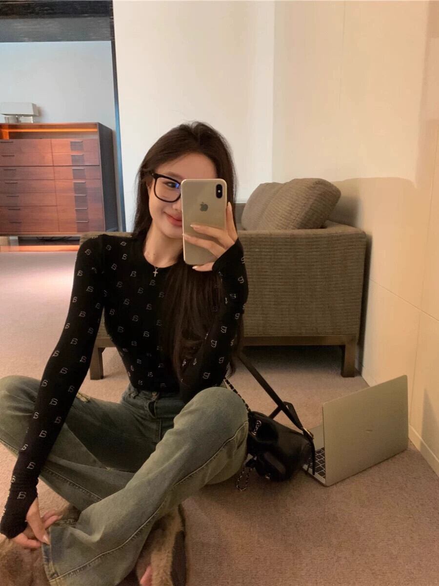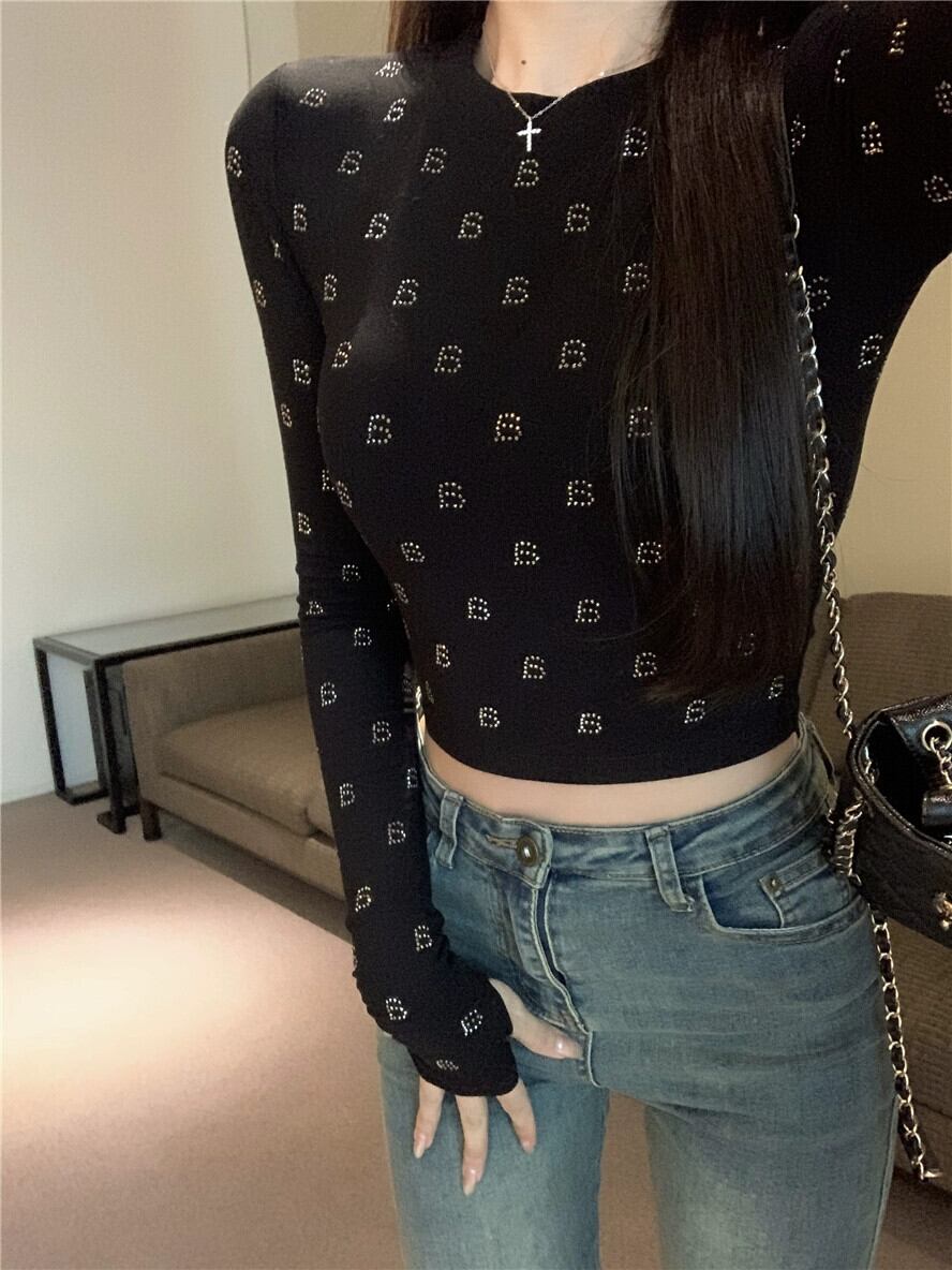 ホットダイヤモンドレタリング長袖 Tシャツ女性秋 2023 新しいアメリカンシックな甘辛インナーレイヤリングシャツショートトップ ロング 大人ガーリー スウィート キュート カジュアル オータム 秋物 8571662706843976