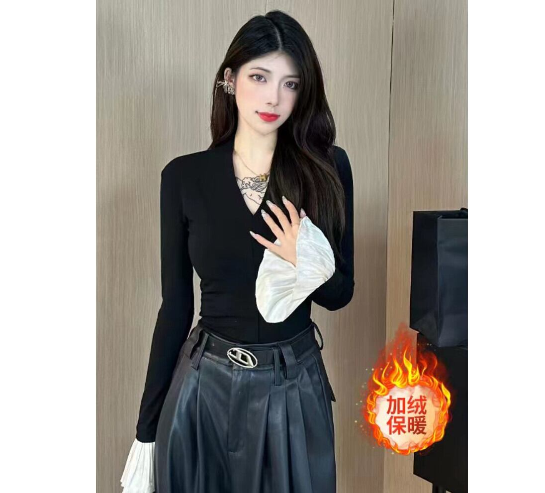 ハーフタートルネックインナーボトリングシャツ女性秋冬 2023 新しいベルベット二重袖長袖 Tシャツベルスリーブトップ ロング オータム 秋物 ウィンター 冬物 8571618813851891