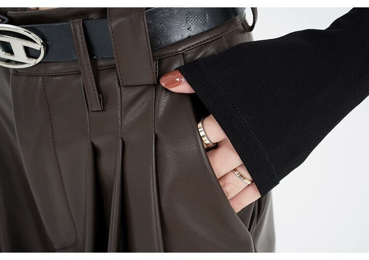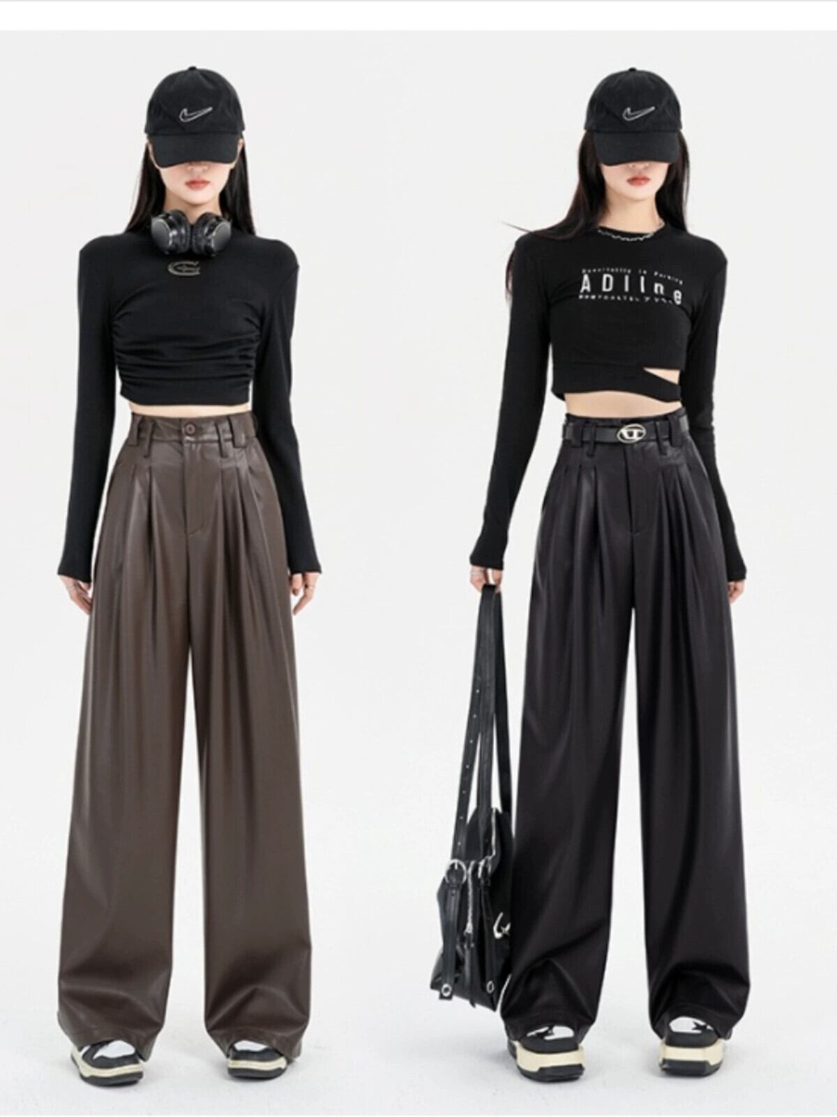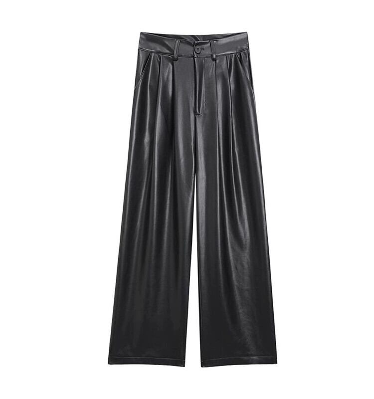 黒 PU レザーパンツワイドレッグパンツ女性の秋と冬 2023 アメリカンレトロストリートホットガールスーツパンツ床拭きパンツ ブラック オータム 秋物 ウィンター 冬物 ワイドパンツ 857166010435337