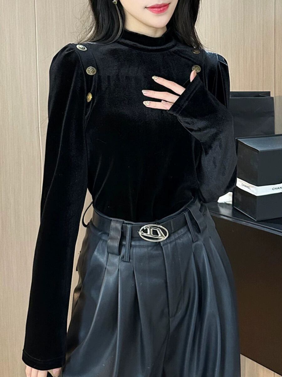 ブラックベルベットトップレディース秋冬プラスベルベットハイエンドウエスタンスタイルハーフハイカラーインナーボトリングシャツ長袖Tシャツ ロング オータム 秋物 ウィンター 冬物 8571659488781080