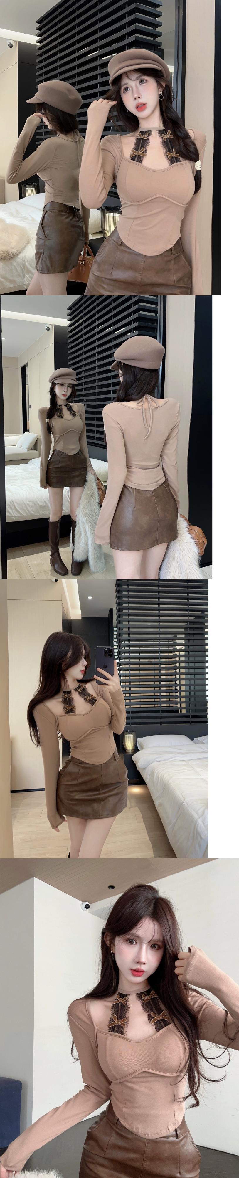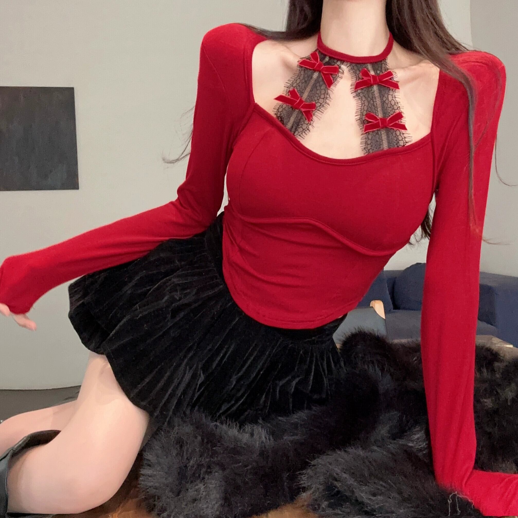クリスマスレッド長袖 Tシャツ女性の秋と冬のベルベットボトリングシャツ純粋な欲望ネクタイリボンホルターネックショートトップ ロング オータム 秋物 ウィンター 冬物 ピュア 8571619798954193