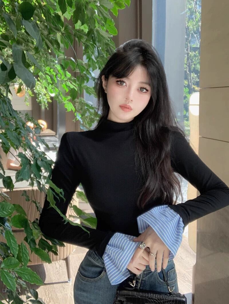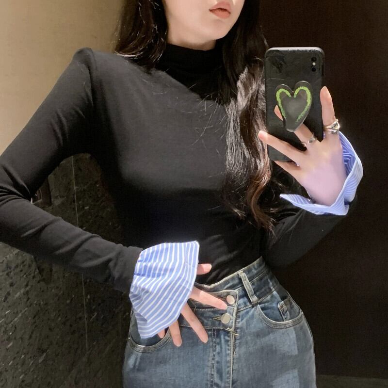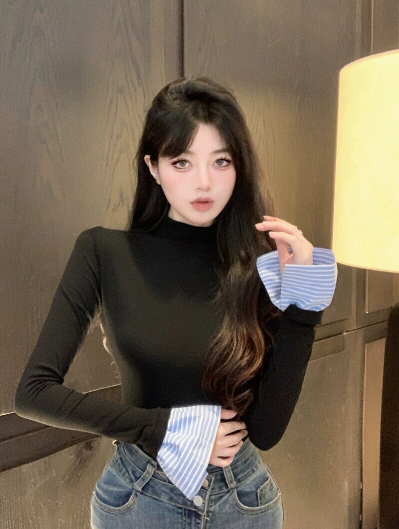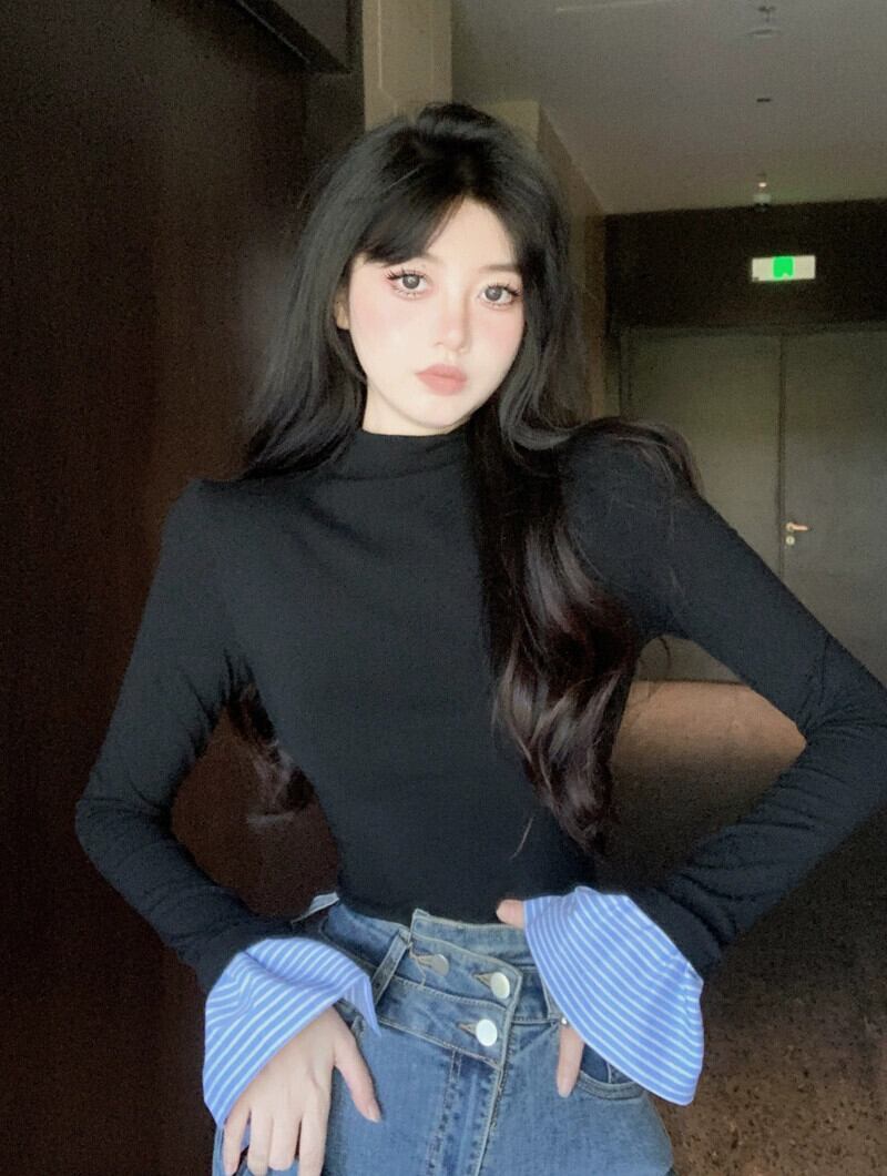 ハーフタートルネックインナーレイヤードシャツレディース、秋冬プラスベルベットデザイン、黒長袖Tシャツ、スリムフィット、超見栄えの良いトップス ロング レッド ブラック オータム 秋物 ウィンター 冬物 8571692882389125