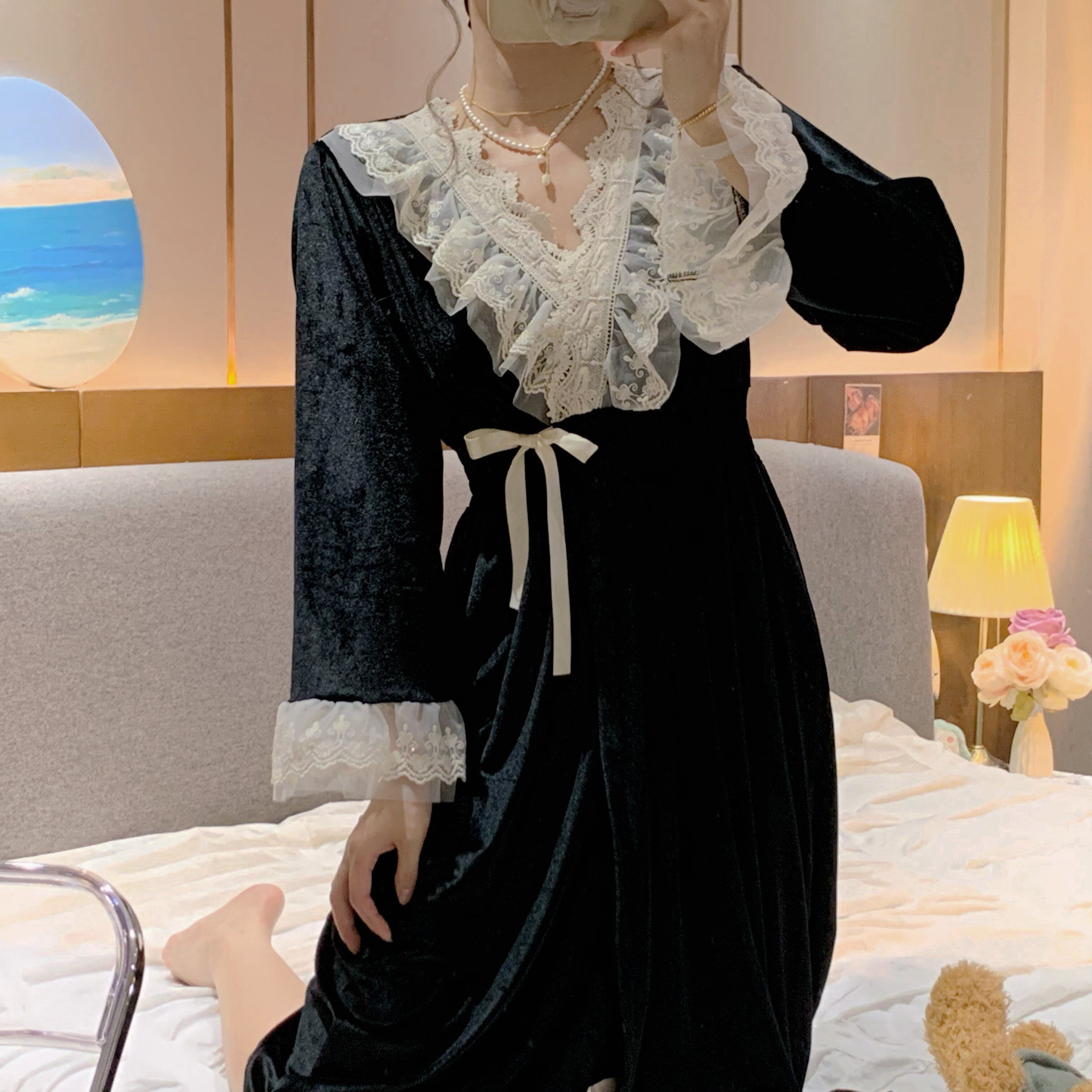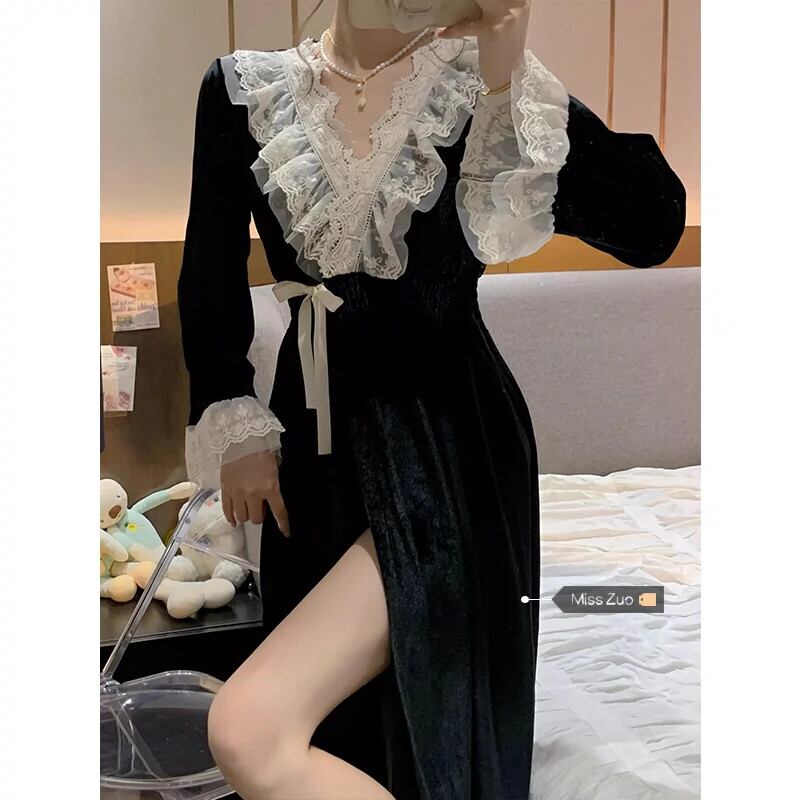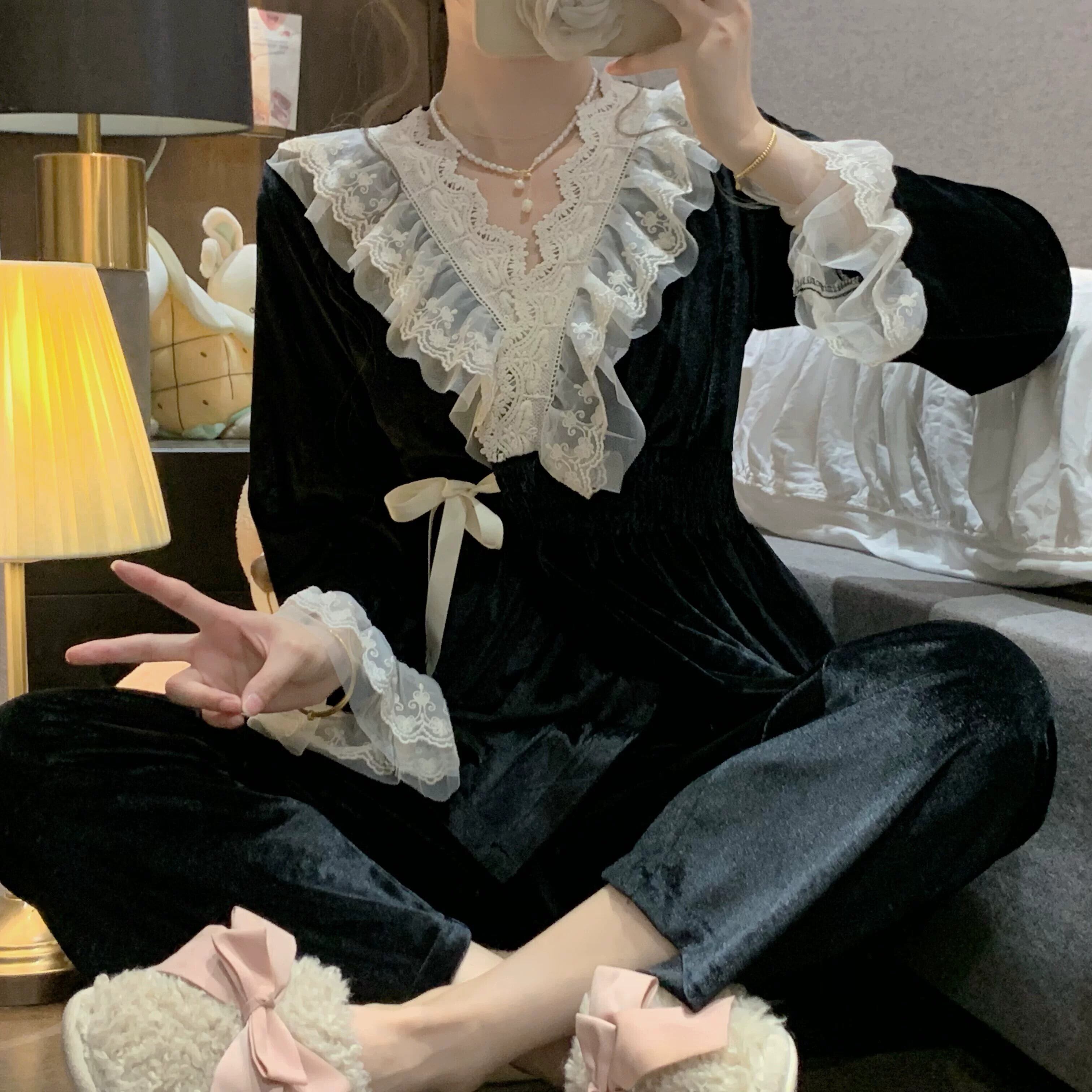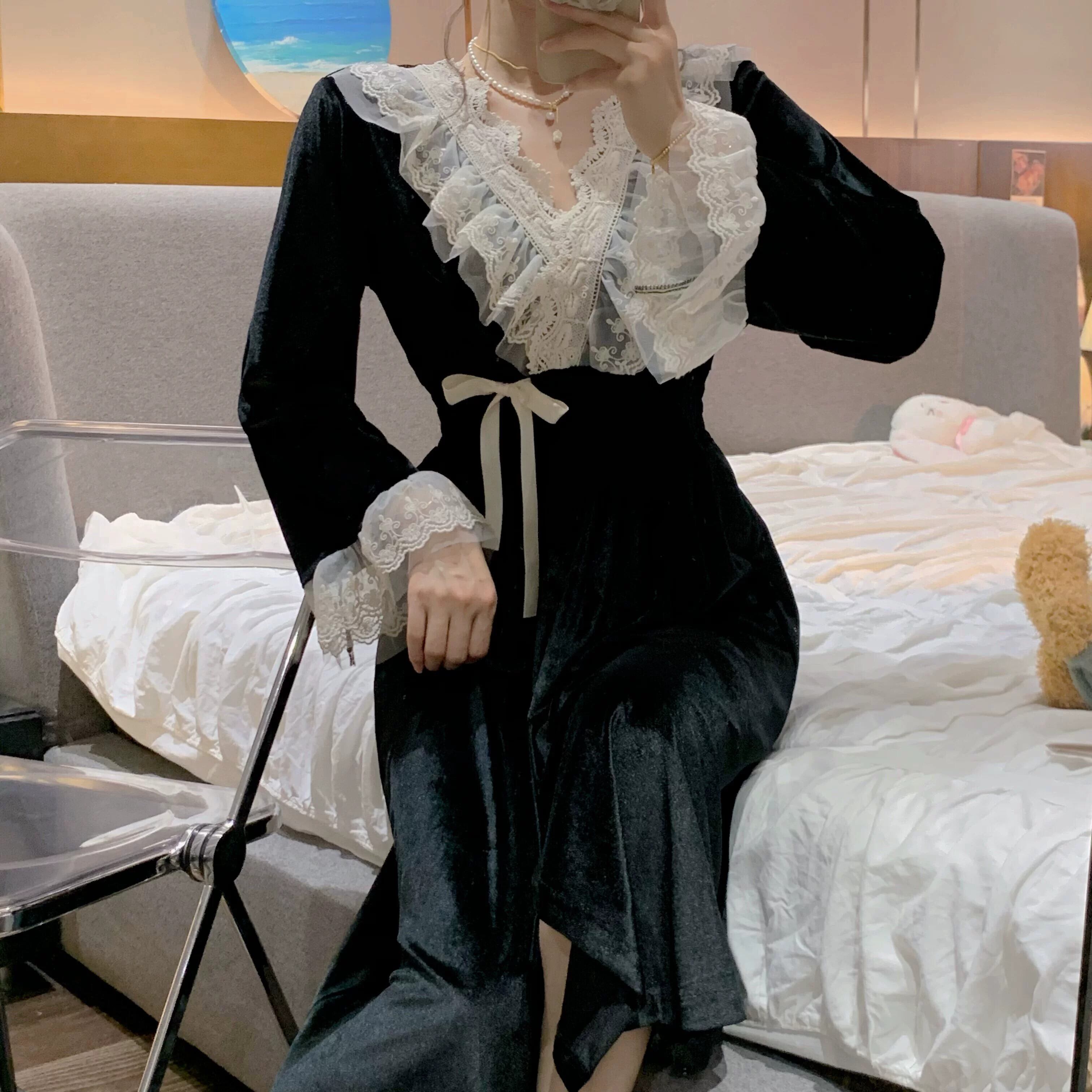 ブラックゴールドベルベットパジャマ女性秋ロングネグリジェ 2023 新スタイルフレンチレトロ宮殿プリンセススタイルホーム服 レース オータム 秋物 8571618758355722
