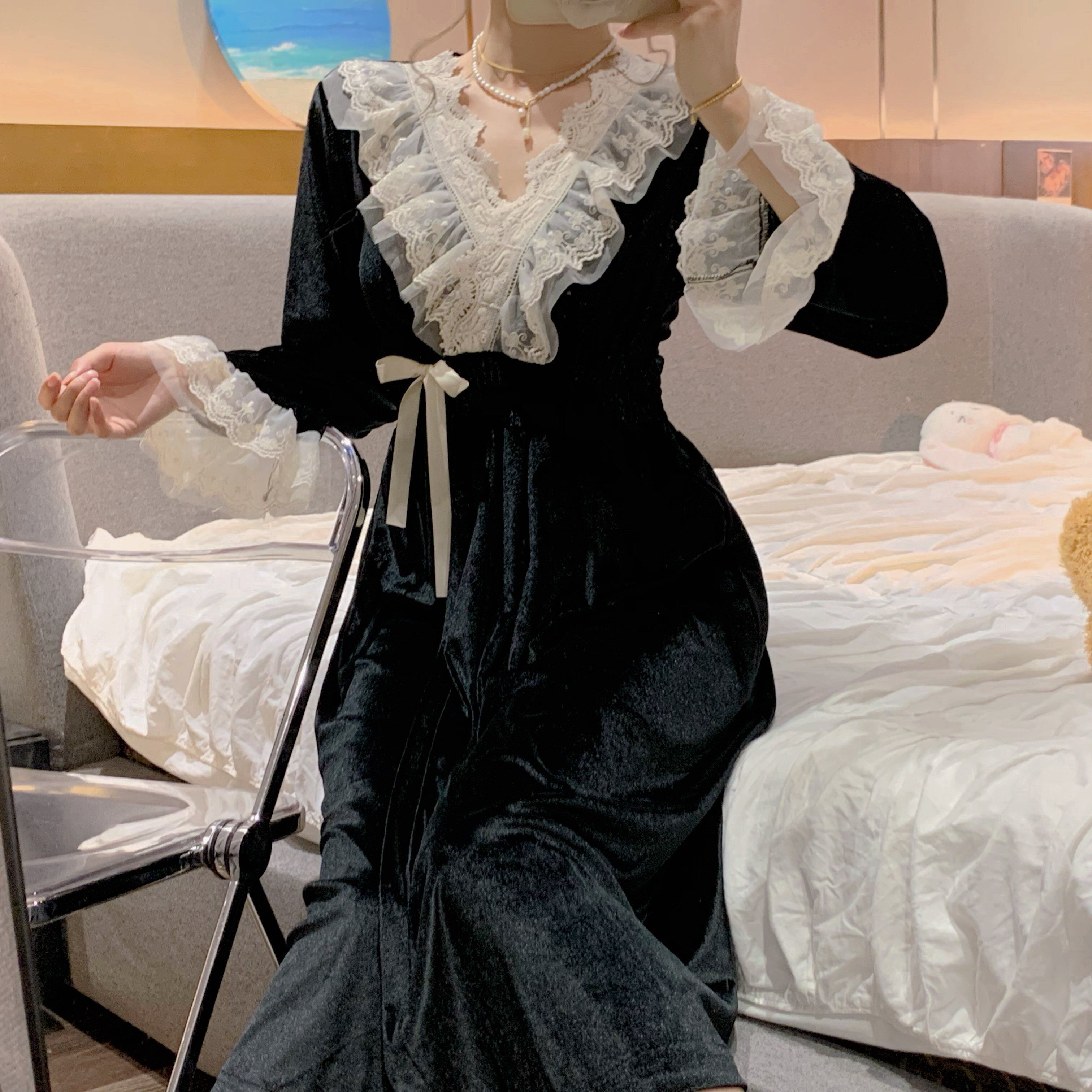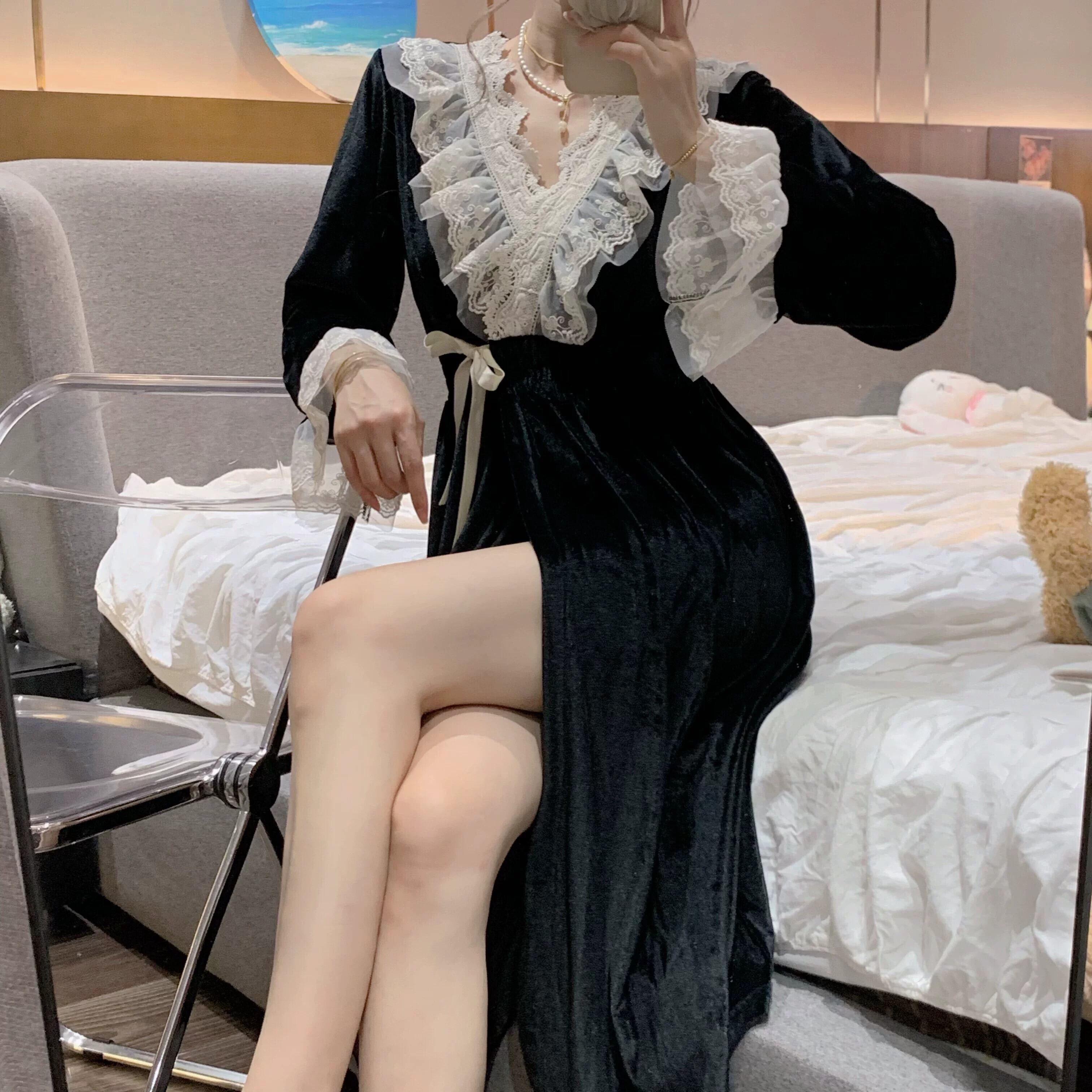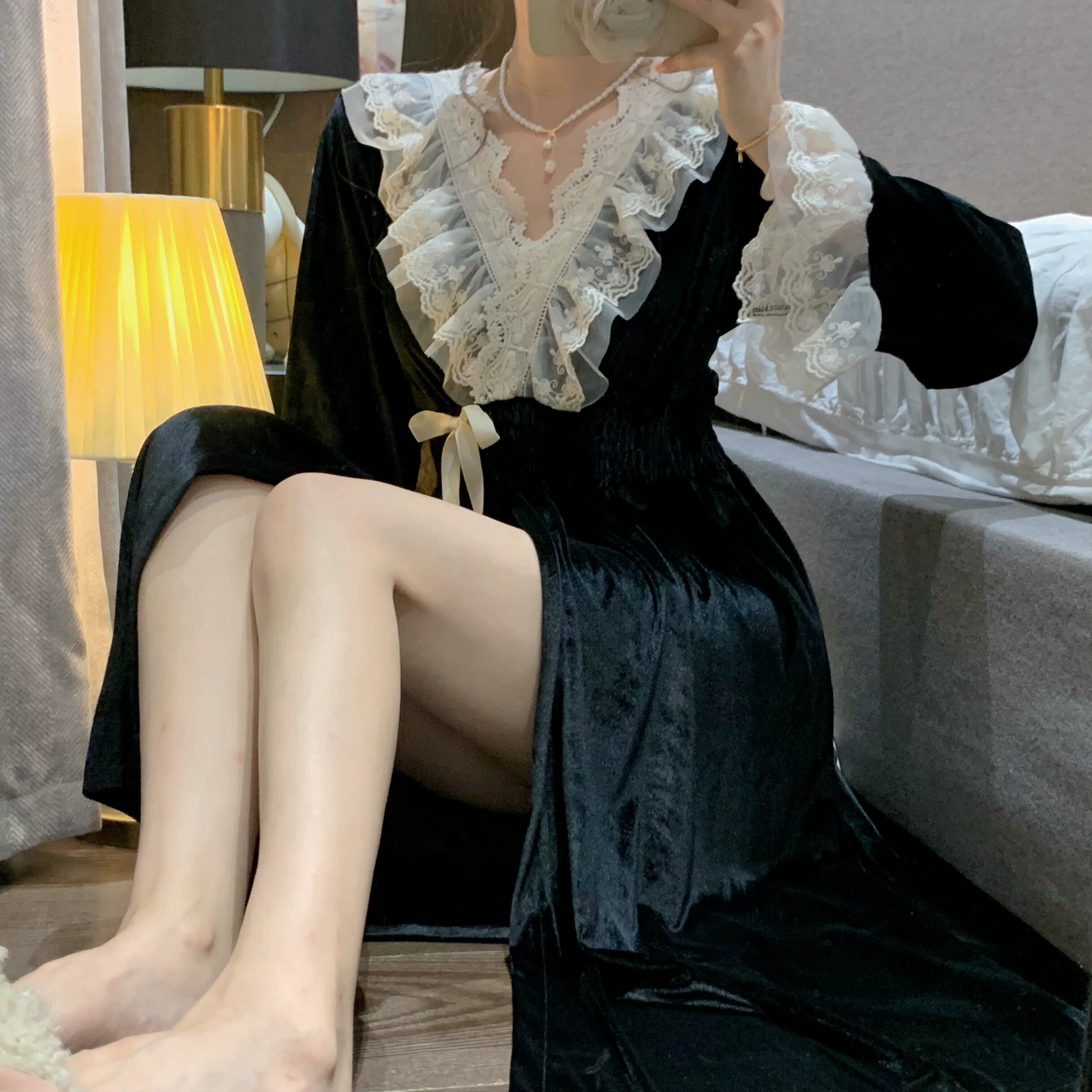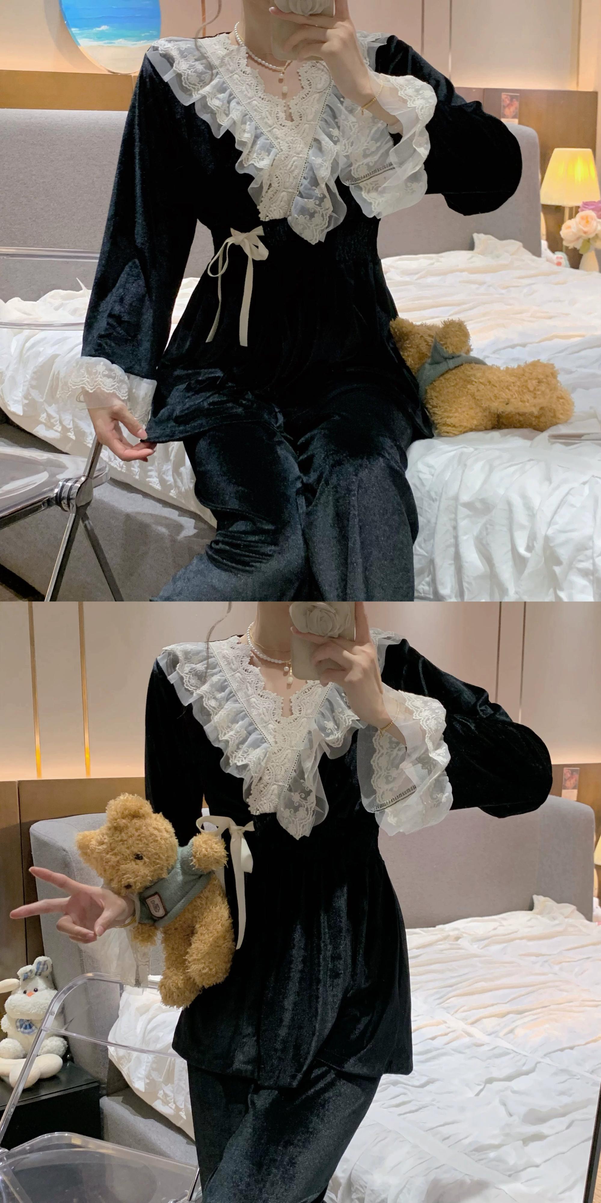 ブラックゴールドベルベットパジャマ女性秋ロングネグリジェ 2023 新スタイルフレンチレトロ宮殿プリンセススタイルホーム服 レース オータム 秋物 8571618758355722