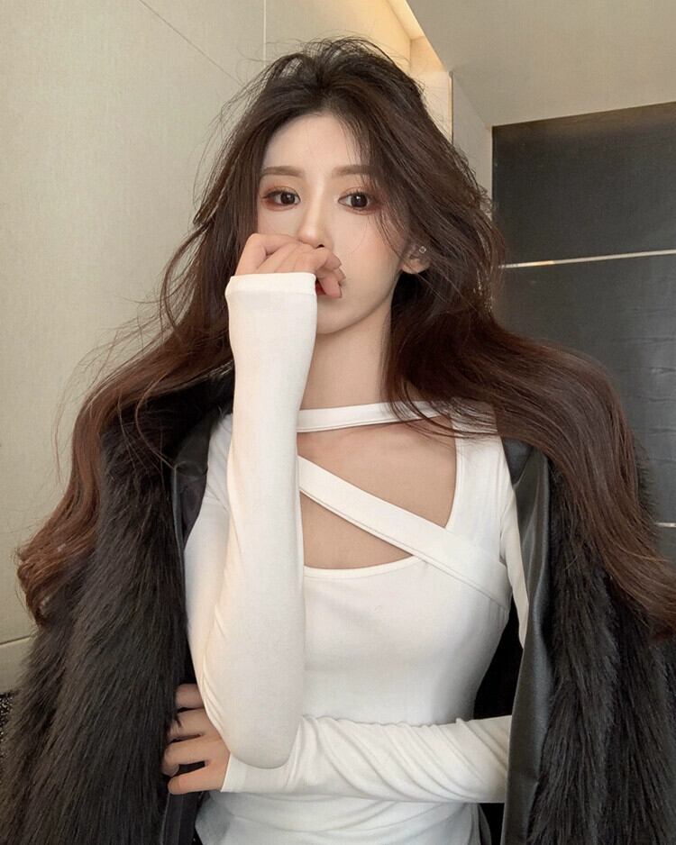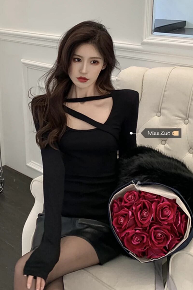ホットショルダーパッドトップ女性の秋と冬のベルベットインナーボトリングシャツデザインニッチ純粋な欲望黒長袖Tシャツ ロング ブラック オータム 秋物 ウィンター 冬物 ピュア 8571680230965613