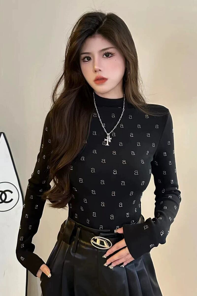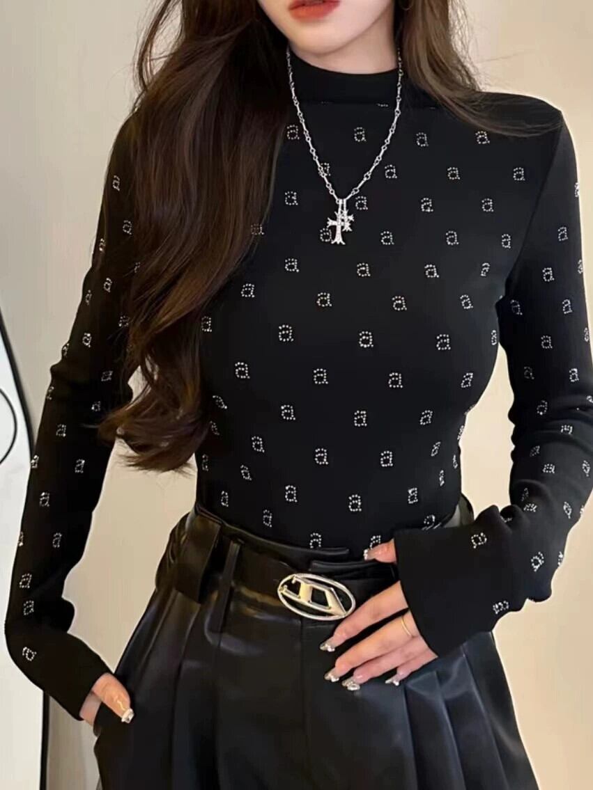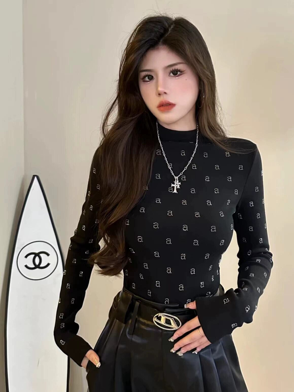 ホットダイヤモンド文字ショートトップ女性の秋と冬のベルベット底シャツ 2023 新しいスタイルハーフタートルネック長袖 Tシャツ ロング オータム 秋物 ウィンター 冬物 8571641740474851