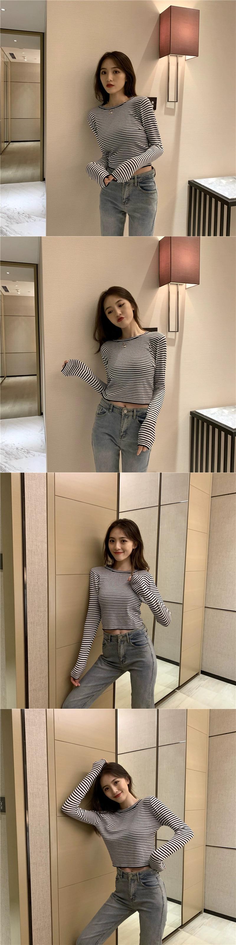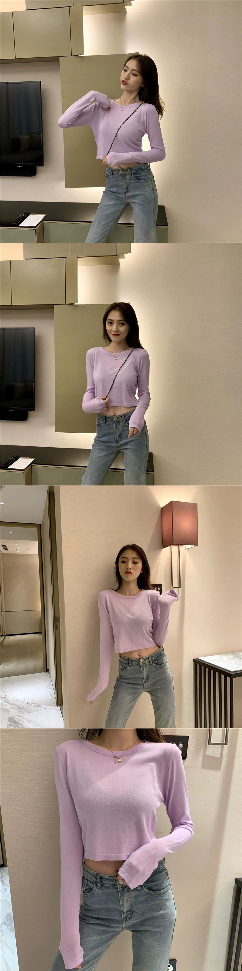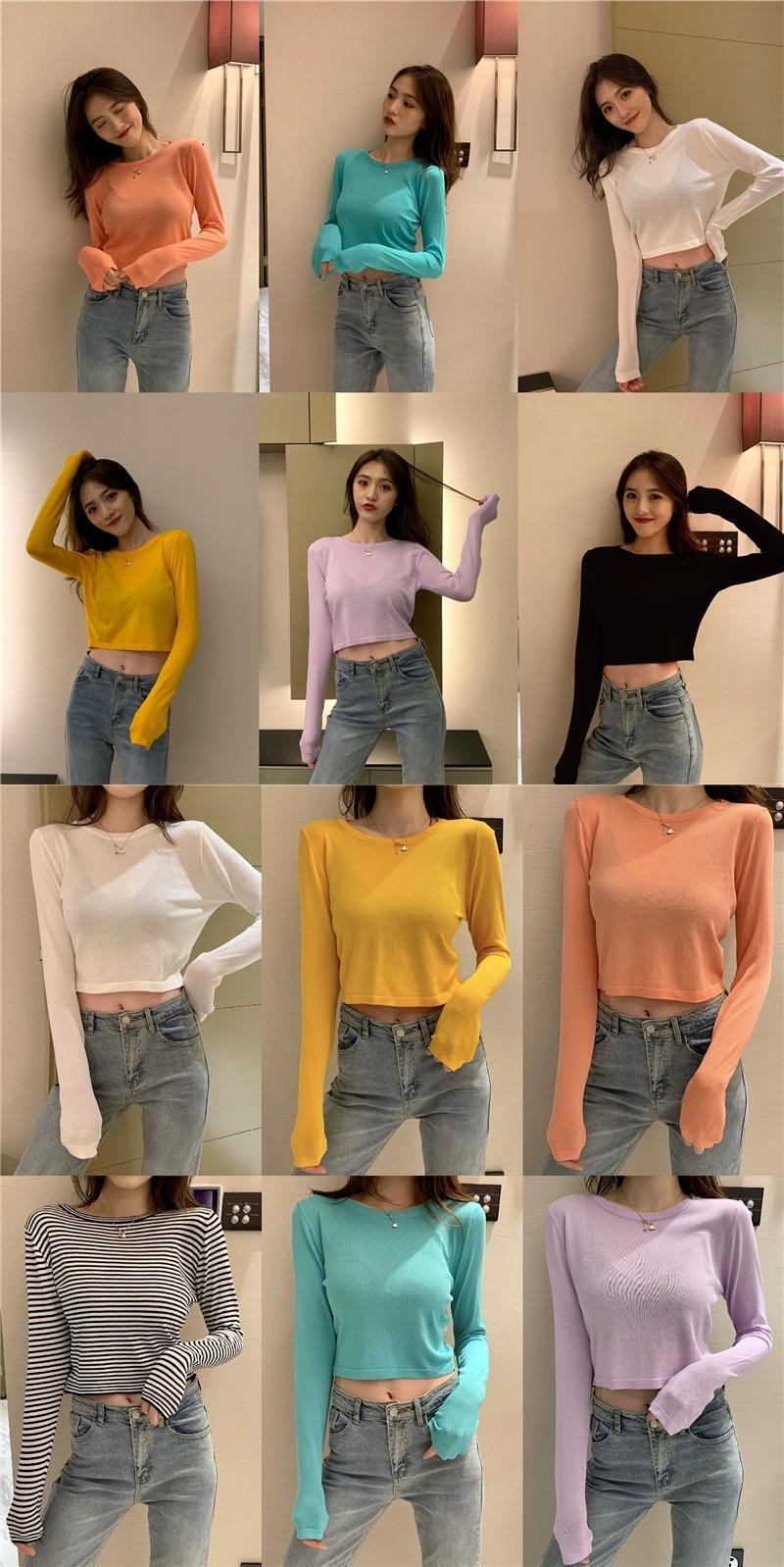 春と秋 2023 スタイルソリッドカラーショートへそウエストボトムトップスリム長袖 Tシャツレディース ロング スプリング 春物 オータム 秋物 8571683839049787
