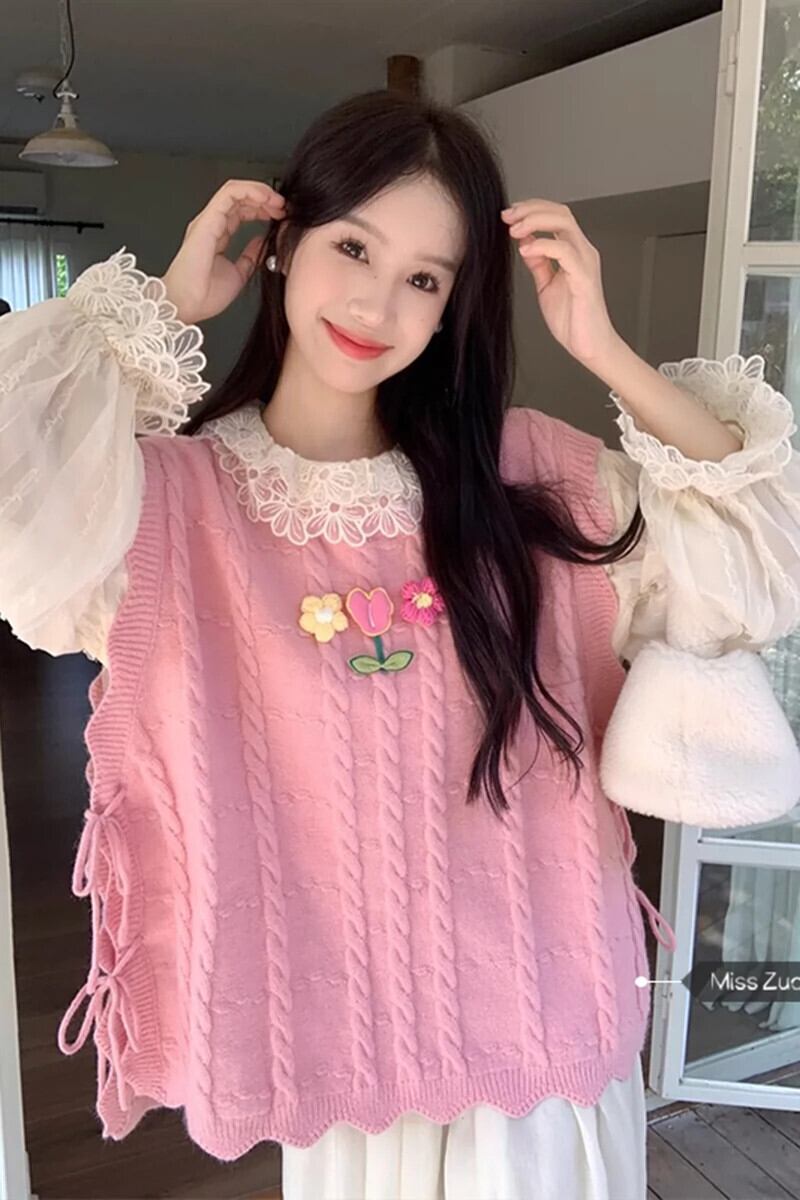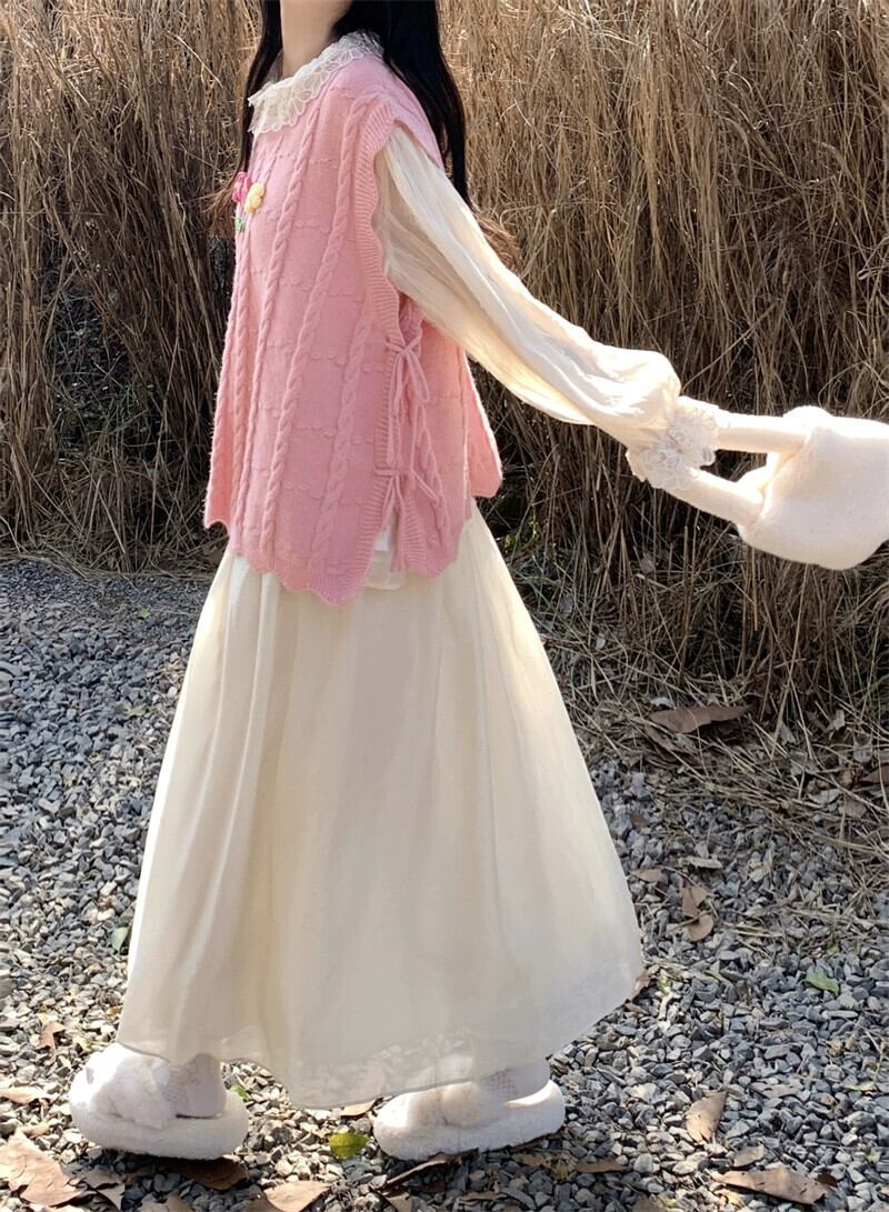 ピンクのストラップ付きニットベストの女性、秋のシャツ、レイヤードベスト、甘くてスタイリッシュなノースリーブベスト レッド 大人ガーリー スウィート キュート カジュアル 8571629646719398