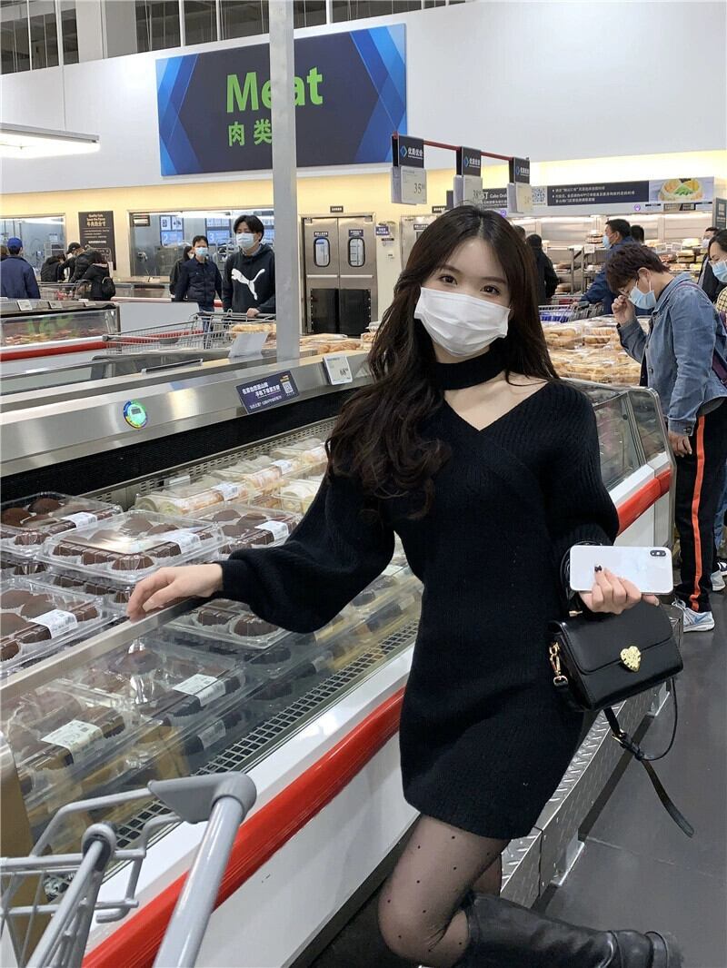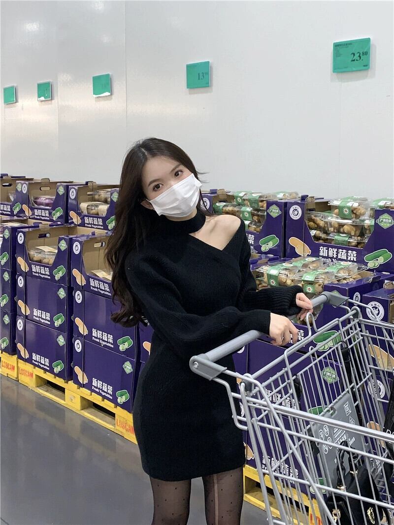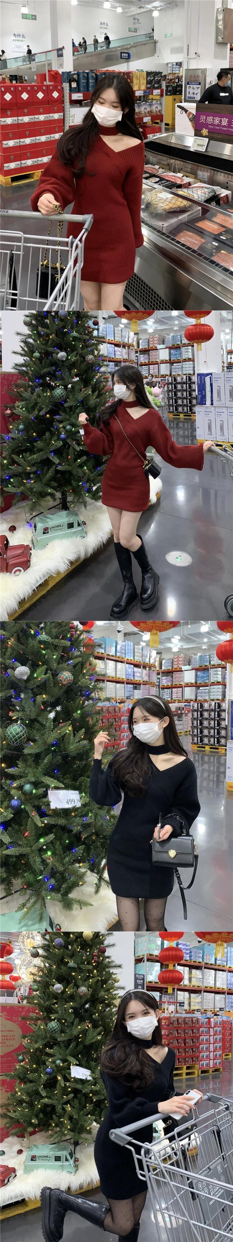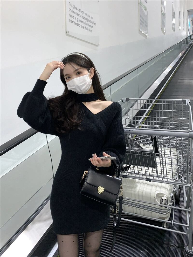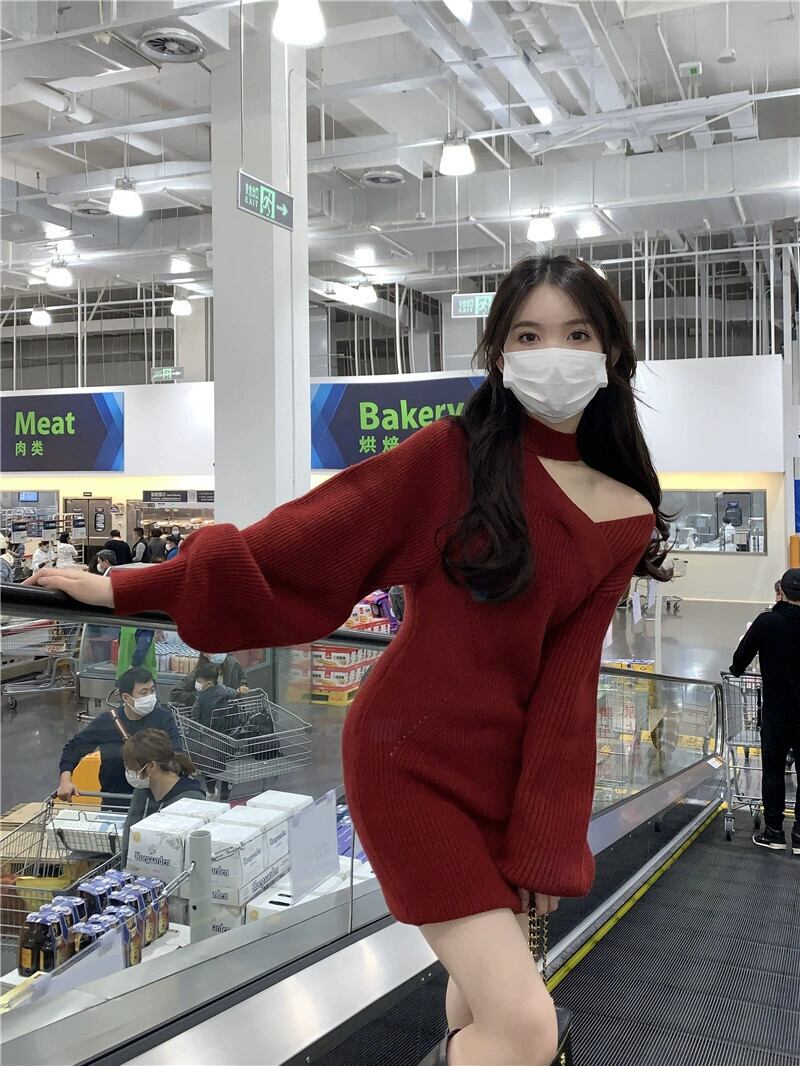 赤いニットドレスの女性の秋冬 2023 新しいスリムで小さなオフショルダーインナーヒップハグショートスカート レッド オータム 秋物 ウィンター 冬物 8571669962186788