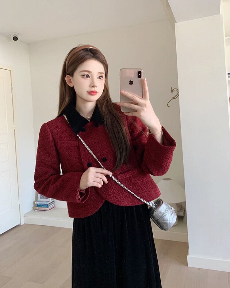 赤い小さな香りのスタイルのショートコートの女性、今年の人気の秋、美しいフランス風の富裕層の娘の高級トップス レッド オータム 秋物 8571672010597038