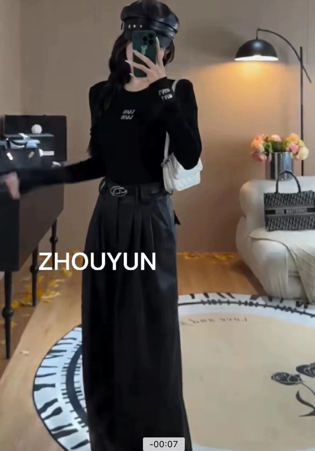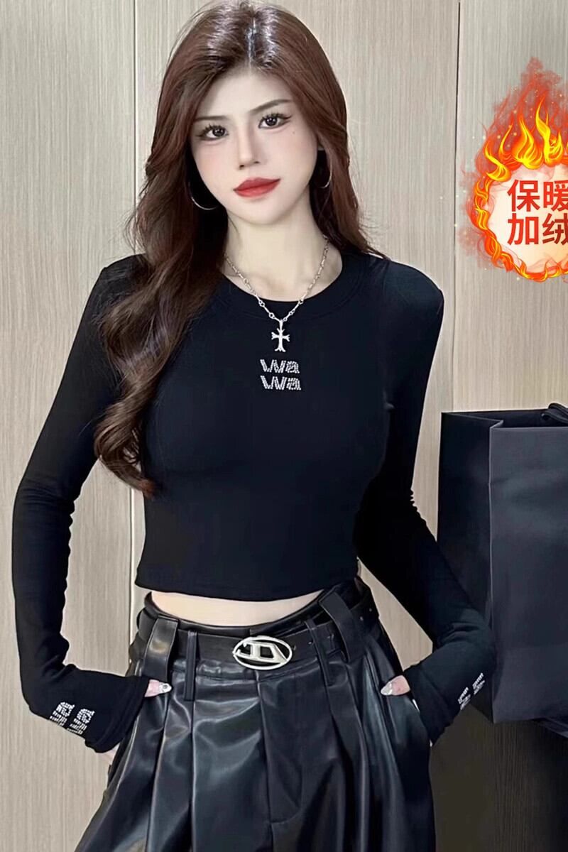 黒長袖Tシャツレディース秋冬インナー重ね着シャツ2023新文字シックショートトップ ロング ブラック オータム 秋物 ウィンター 冬物 8571654475833730