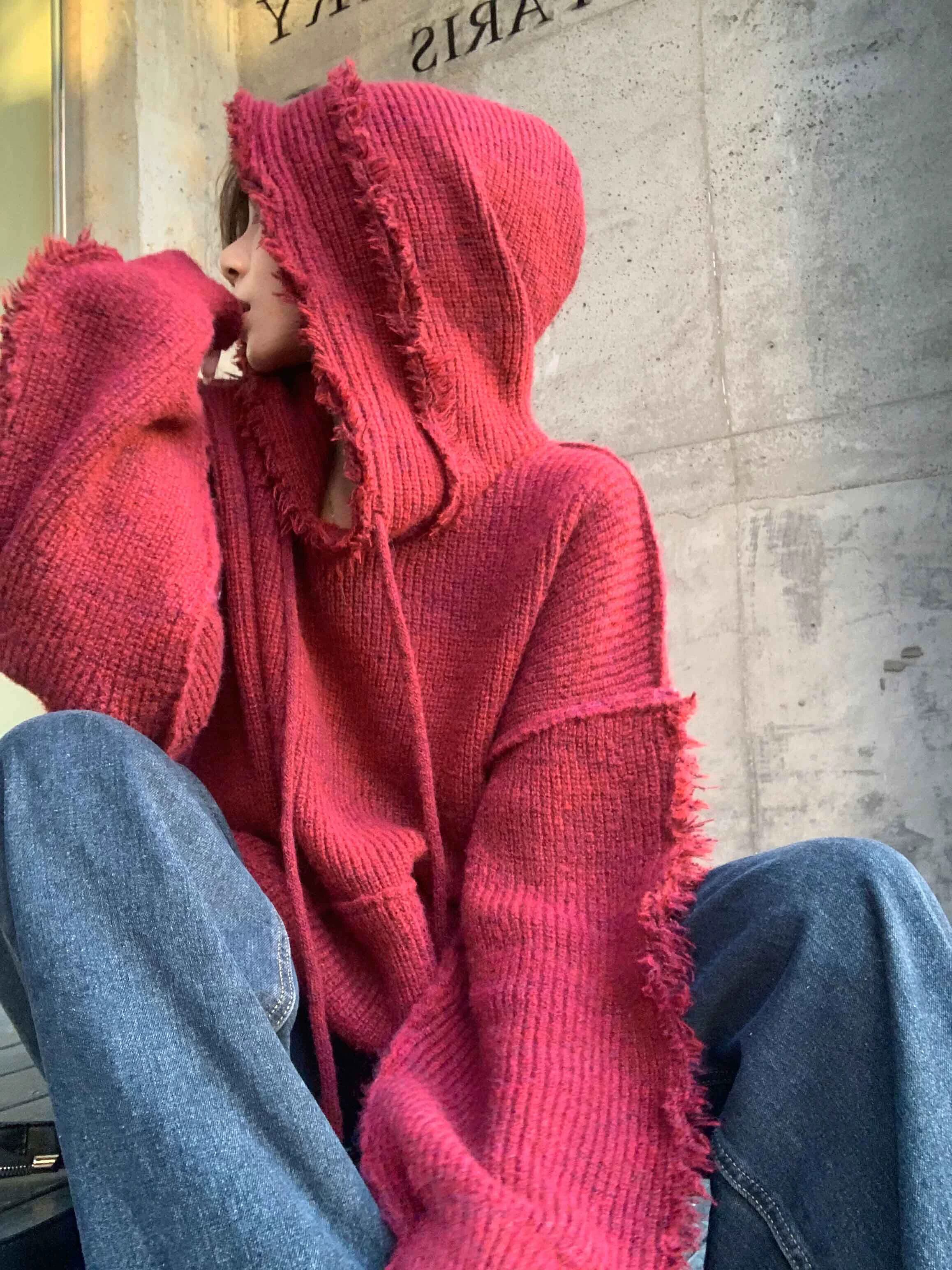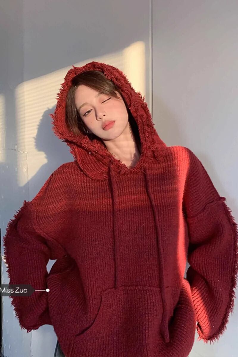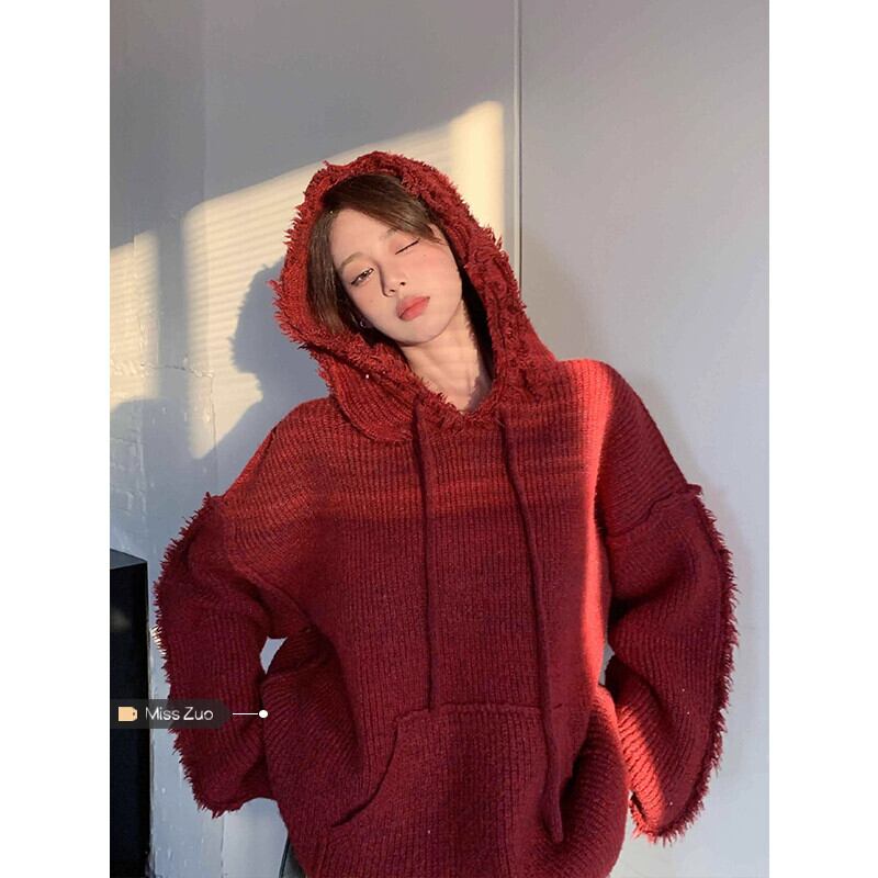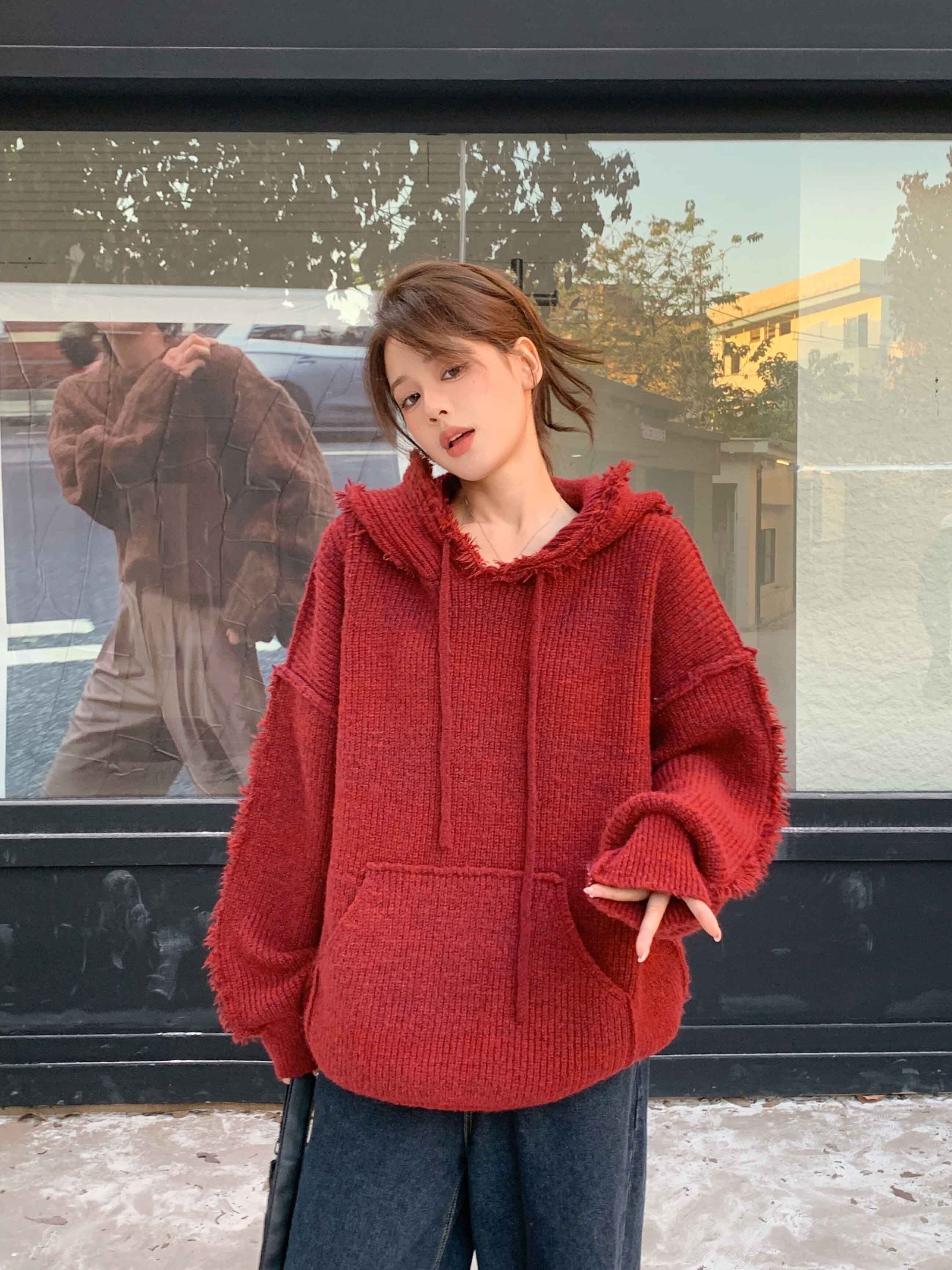クリスマスイヤーレッドセーター女性の秋冬2023レトロ怠惰なスタイルルーズフード付きテルセーター オータム 秋物 ウィンター 冬物 8571664898367045