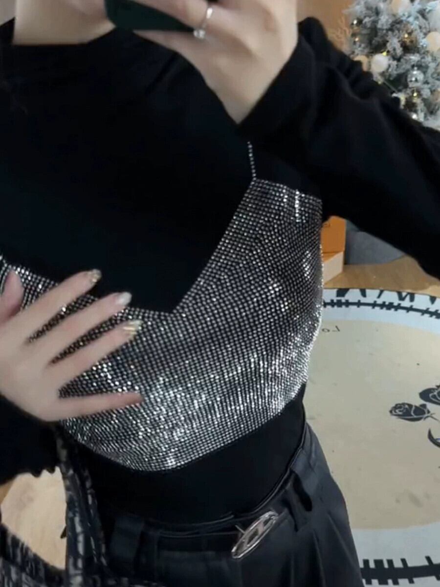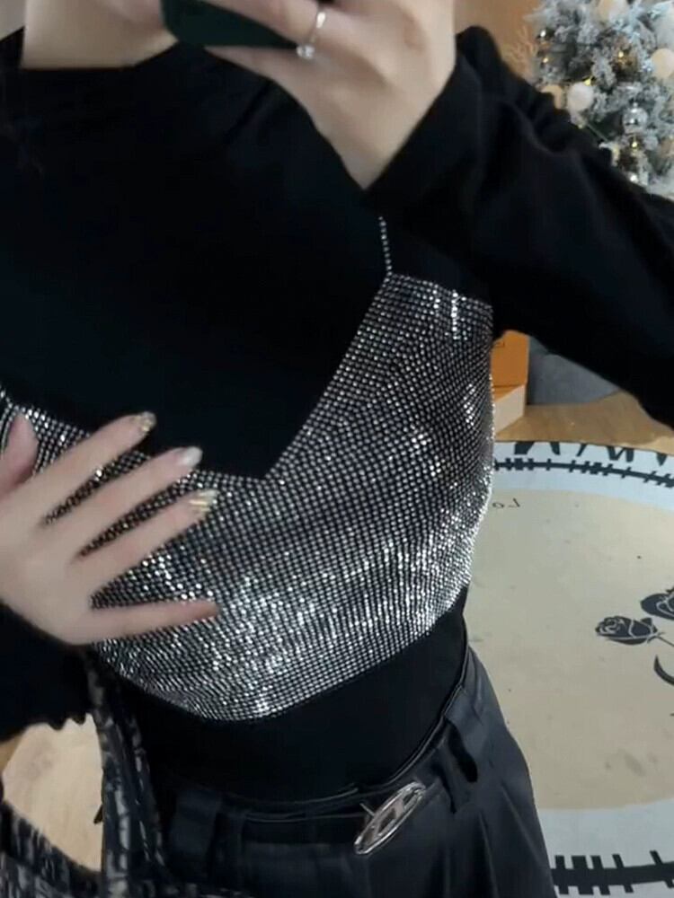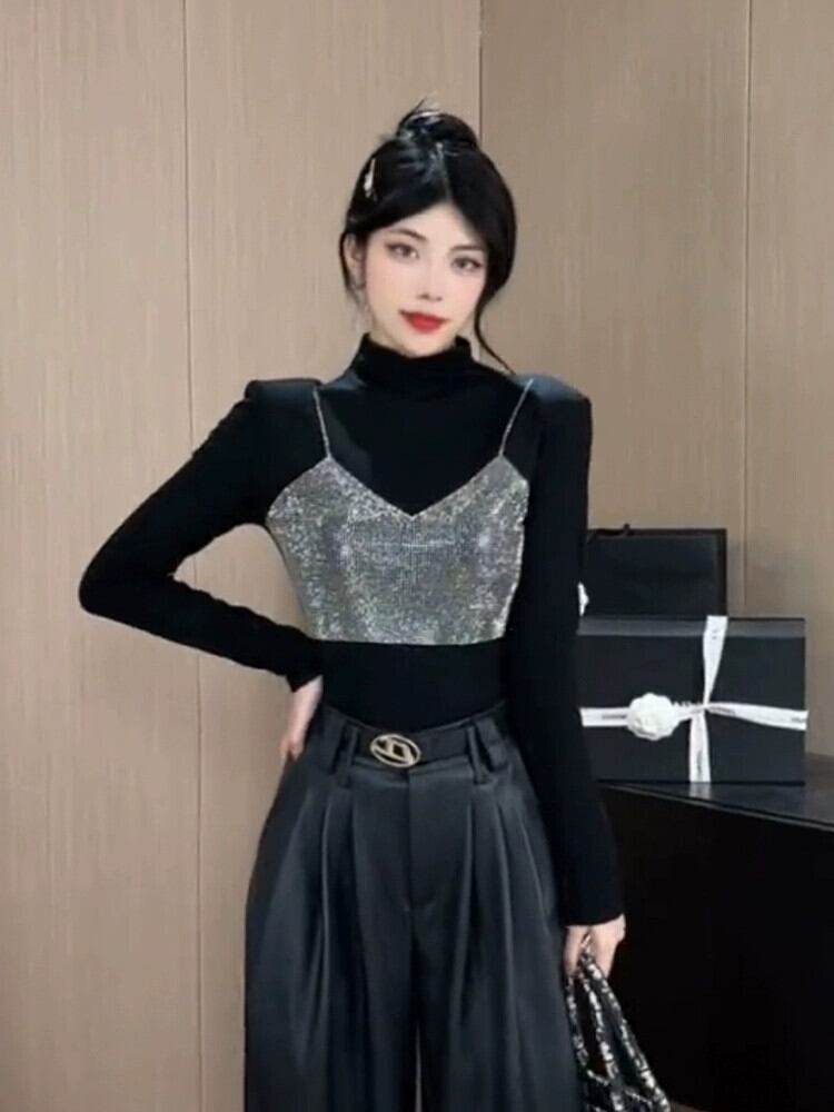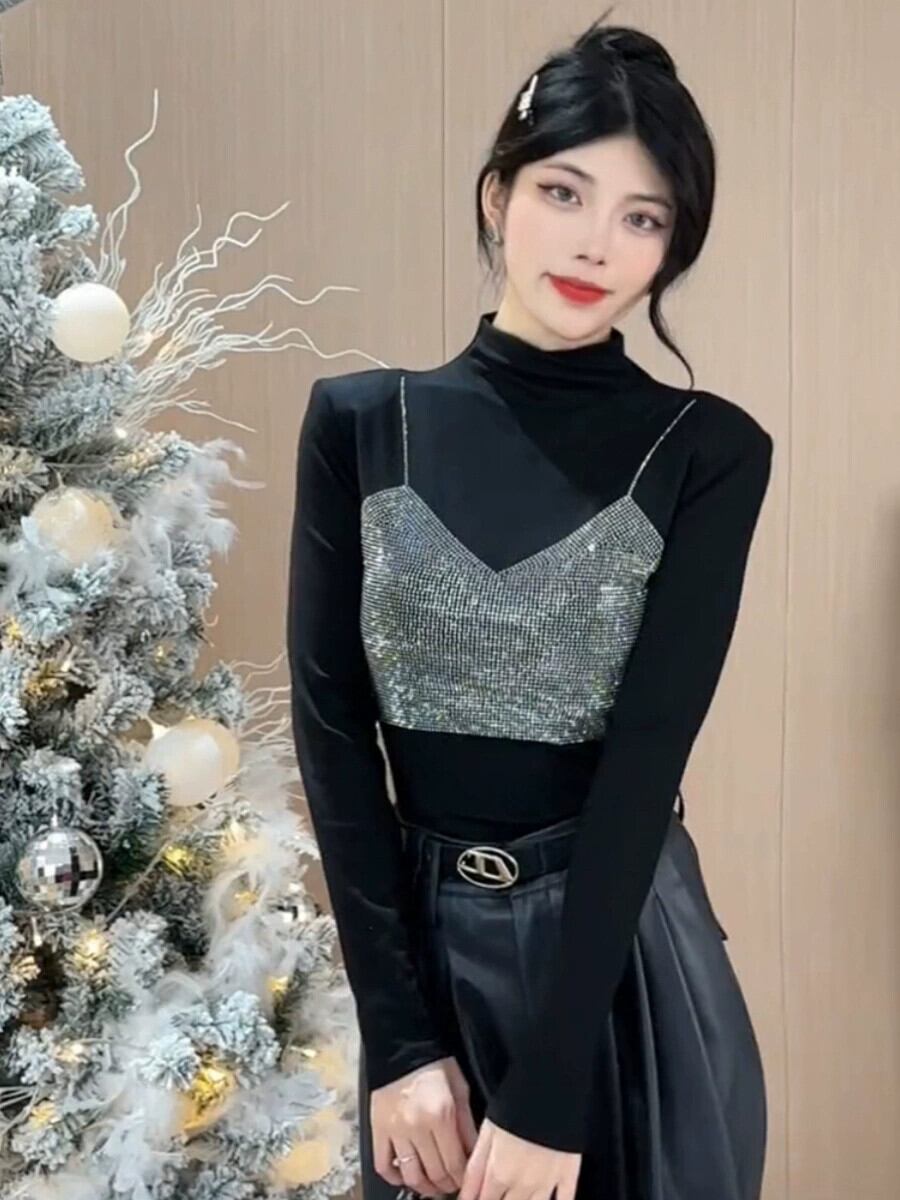 ハーフタートルネックプラスベルベットボトムシャツ女性秋冬ダイヤモンドトップ 2023 新しいスタイル見栄えの良い西洋スタイル長袖 T シャツ ロング オータム 秋物 ウィンター 冬物 Tシャツ 8571671908911218